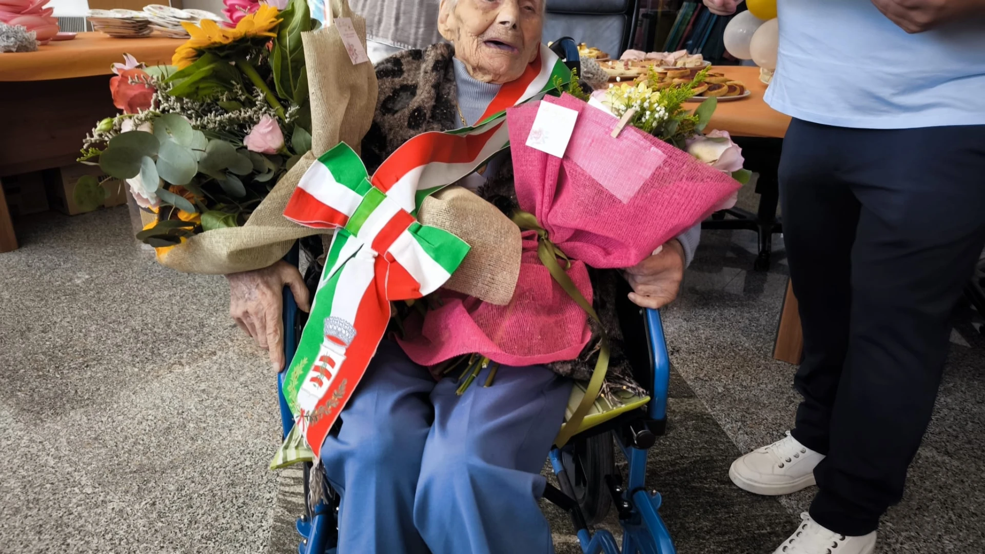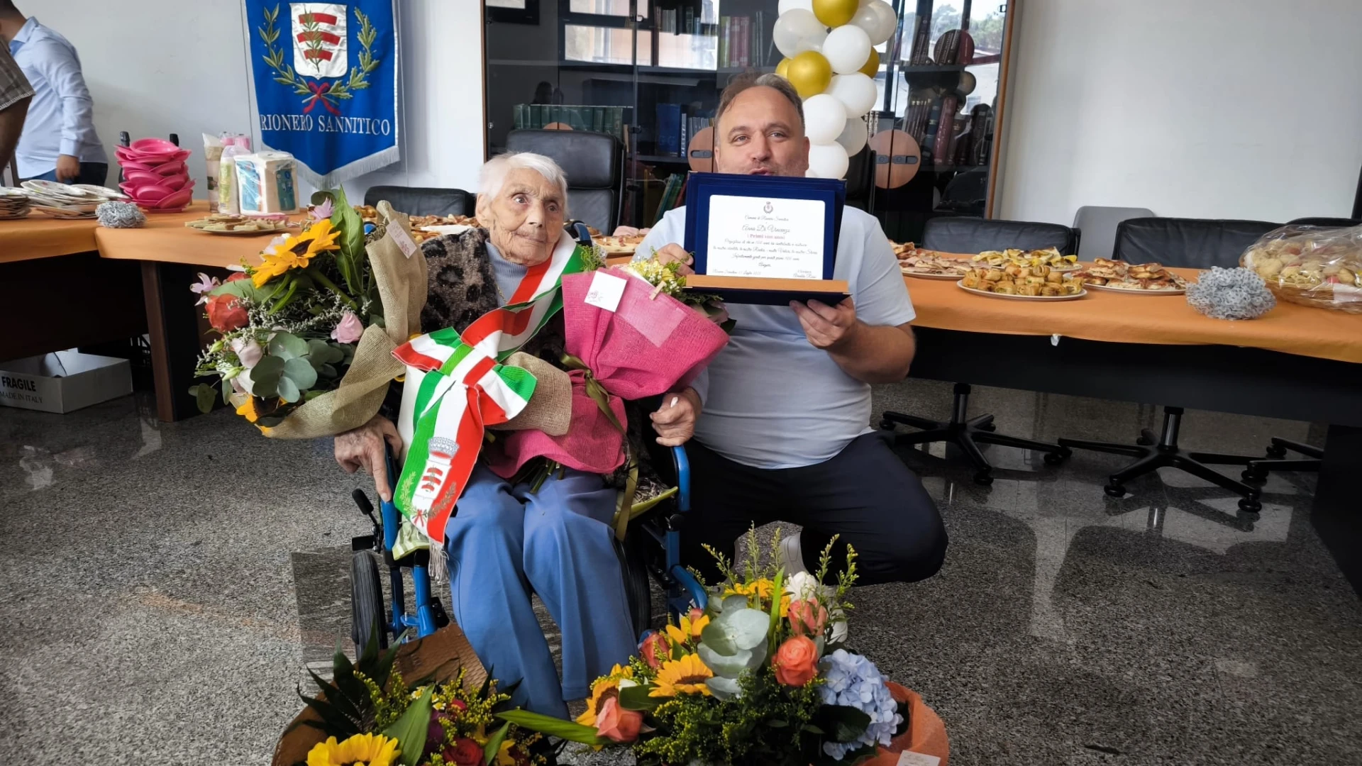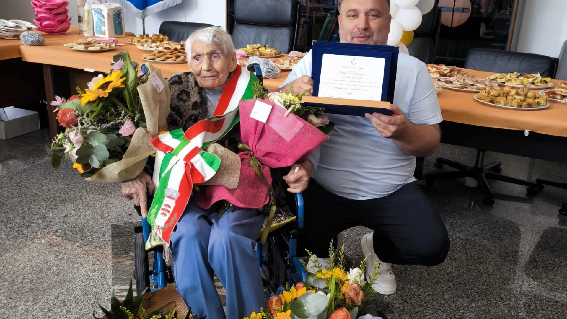 RIONERO SANNITICO. Una giornata di festa che i suoi familiari le hanno voluto dedicare. Anna Di Vincenzo di Rionero Sannitico, ha festeggiato quest’oggi il suo centesimo compleanno. Si tratta della seconda nonnina del territorio comunale che taglia questo importantissimo traguardo. Per lei una mega festa di paese. Prima la celebrazione della Santa Messa e subito dopo il rinfresco in piazza all’interno di un locale adiacente la sede del Municipio di Rionero Sannitico. Il sindaco Arnaldo Rossi, per l’occasione, ha consegnato a nonna Anna la fascia di primo cittadino e una targa commemorativa della giornata, trasformando cosi l’anziana piu’ longeva di Rionero nel sindaco per un giorno. GUARDA IL SERVIZIO.