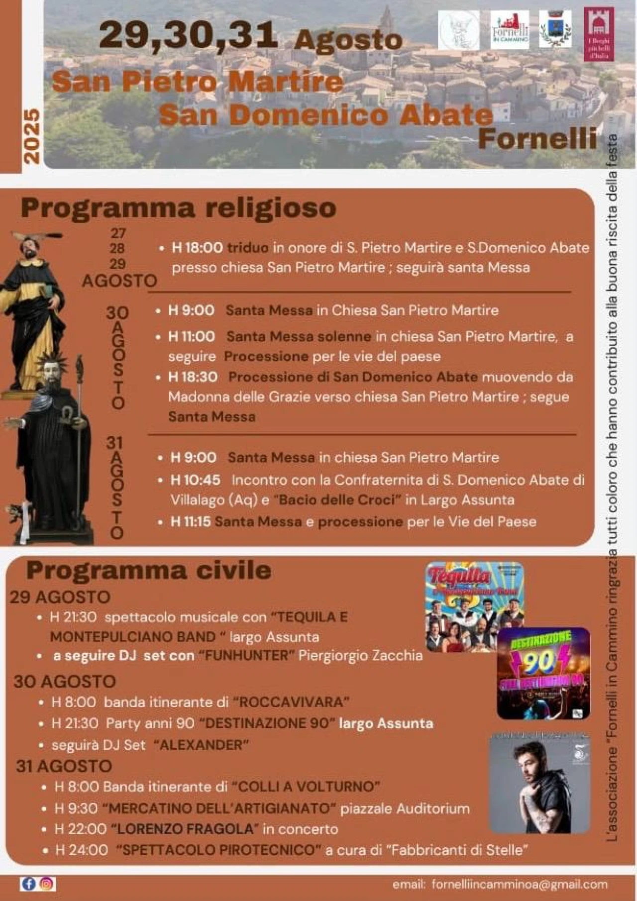 FORNELLI. Un fine settimana da non perdere quello che sta per arrivare in paese. Dal 29 al 31 agosto i fedeli ed i cittadini del posto onoreranno le loro tradizioni ed usanze popolari, con i festeggiamenti dedicati ai santi patroni San Pietro Martire e San Domenico Abate. Un programma religioso e civile davvero molto corposo. Manifestazione promossa ed organizzata dall’associazione “Fornelli in Cammino” , dalla locale Parrocchia e con il patrocinio del comune di Fornelli. Una tre giorni di fede e svago che va a concludere il ciclo di feste estive che si sono svolte, anche quest’anno e in gran numero, a Fornelli, riportando una notevole partecipazione cittadina e di turisti.