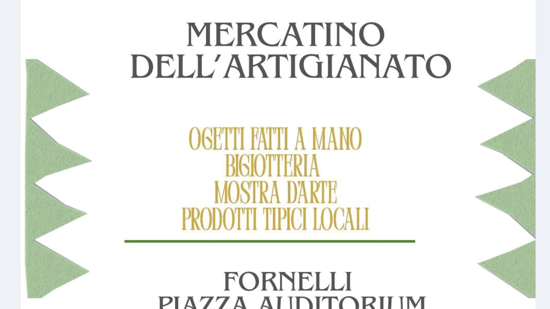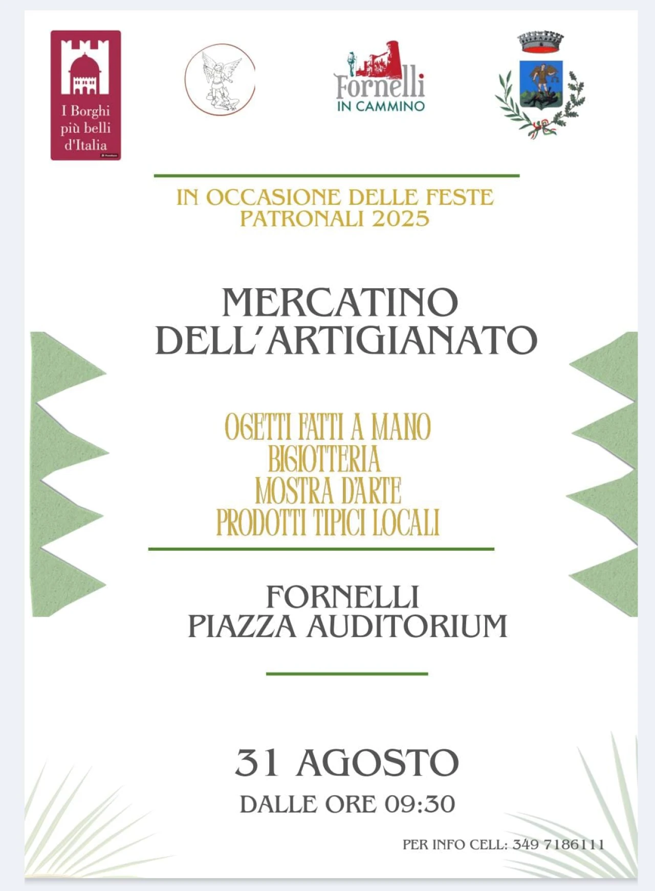 ore 9.30 Mercatino dell’Artigianato presso il piazzale dell’Auditorium comunale. Esposizione e vendita di oggetti fatti a mano, bigiotteria, mostra d’arte, prodotti tipici locali.