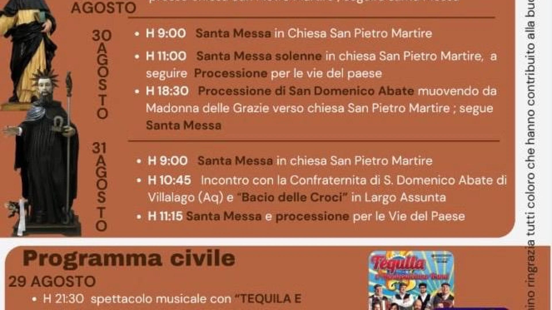 Programma religioso: ore 18.00 27-28-29 agosto triduo in onore di San Pietro Martire e San Domenico Abate presso chiesa San Pietro Martire, seguirà santa messa.
