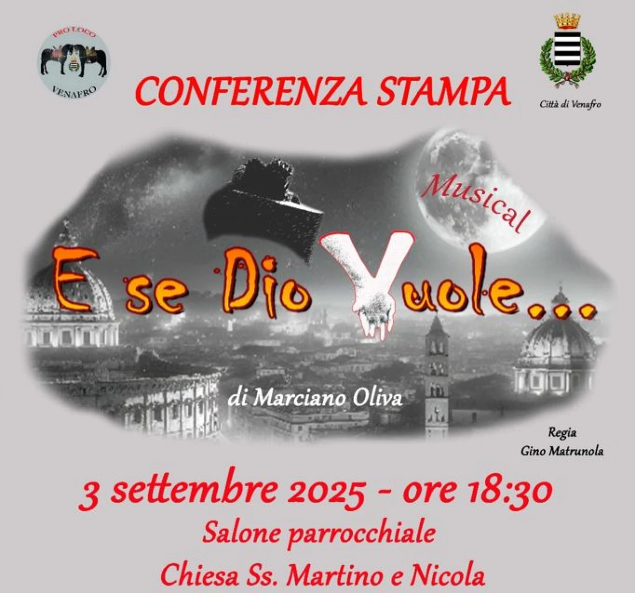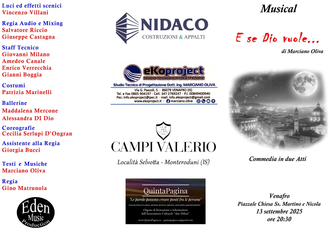 VENAFRO. Un grande impegno che nasce dall’idea e dalla genialità dell’ingegnere venafrano doc Marciano Oliva. Un lavoro di squadra e soprattutto una produzione artistica di assoluto livello. A Venafro il prossimo 13 settembre andrà in scena la prima assoluta del musical intitolato “E se Dio Vuole” scritto ed ideato, testi e musiche da Marciano Oliva. Una storia tutta da vivere e soprattutto da seguire. La commedia in due atti verrà messa in scena il 13 settembre a partire dalle ore 20.30 presso il piazzale della Chiesa dei Santi Martino e Nicola a Venafro. Intanto, l’evento, verrà presentato in conferenza stampa mercoledì 3 settembre alle ore 18.30 all’interno del salone parrocchiale della chiesa dei Santi MARTINO E NICOLA.
