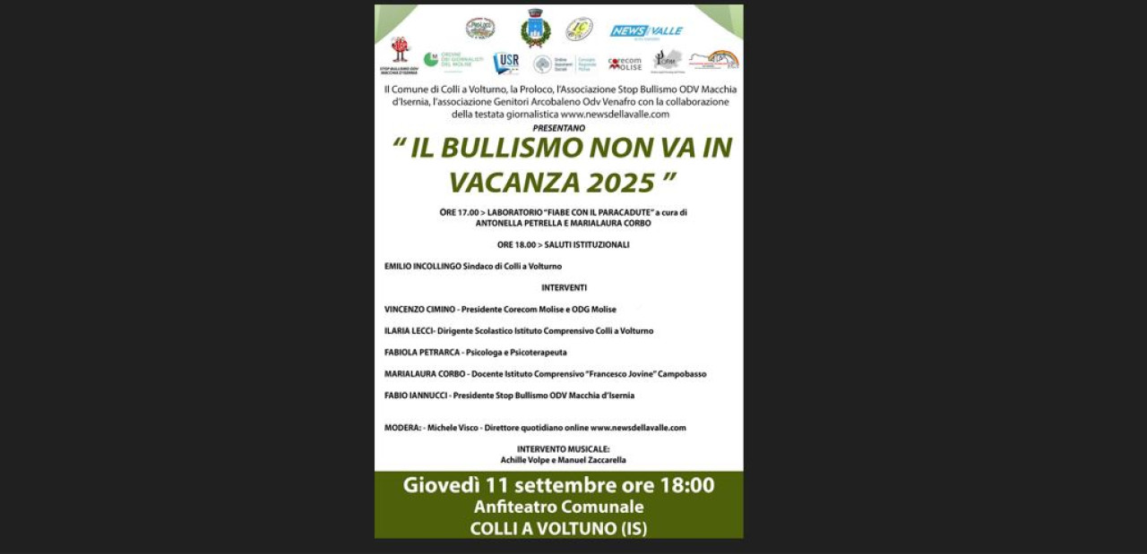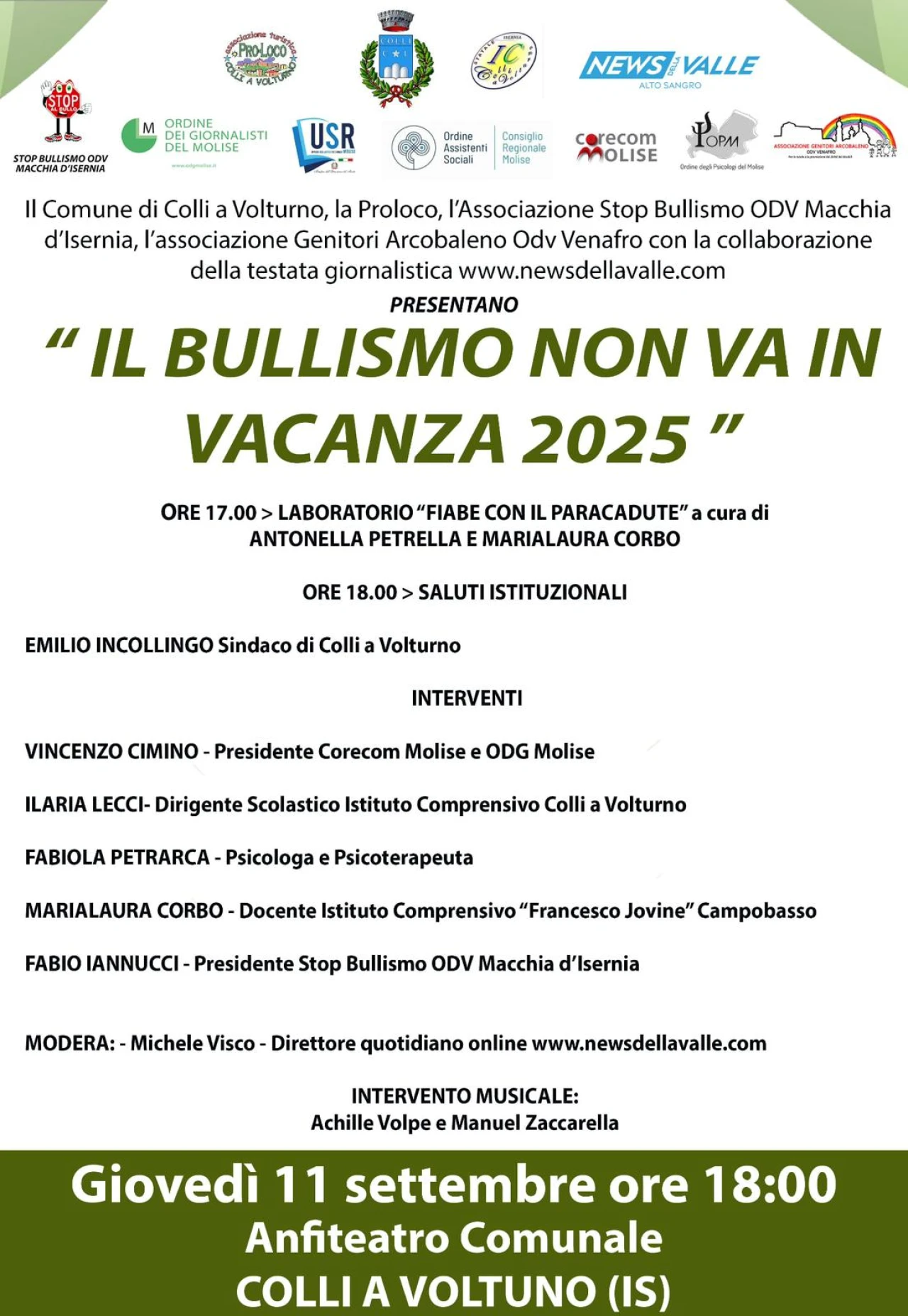 COLLI A VOLTURNO. Una tappa del tour 2025 dell’evento “Il bullismo non va in vacanza” approda a Colli a Volturno. Grazie all’impegno dell’associazione Stop Bullismo Odv Macchia d’Isernia, l’evento itinerante approda anche nell’alta Valle del Volturno, con la collaborazione importante del comune di Colli a Volturno che patrocinerà la manifestazione , dell’Associazione Turistica Pro Loco di Colli a Volturno, dell’associazione Genitori Arcobaleno Odv Venafro e della testata giornalistica on-line www.newsdellavalle.com media partner dell’evento.