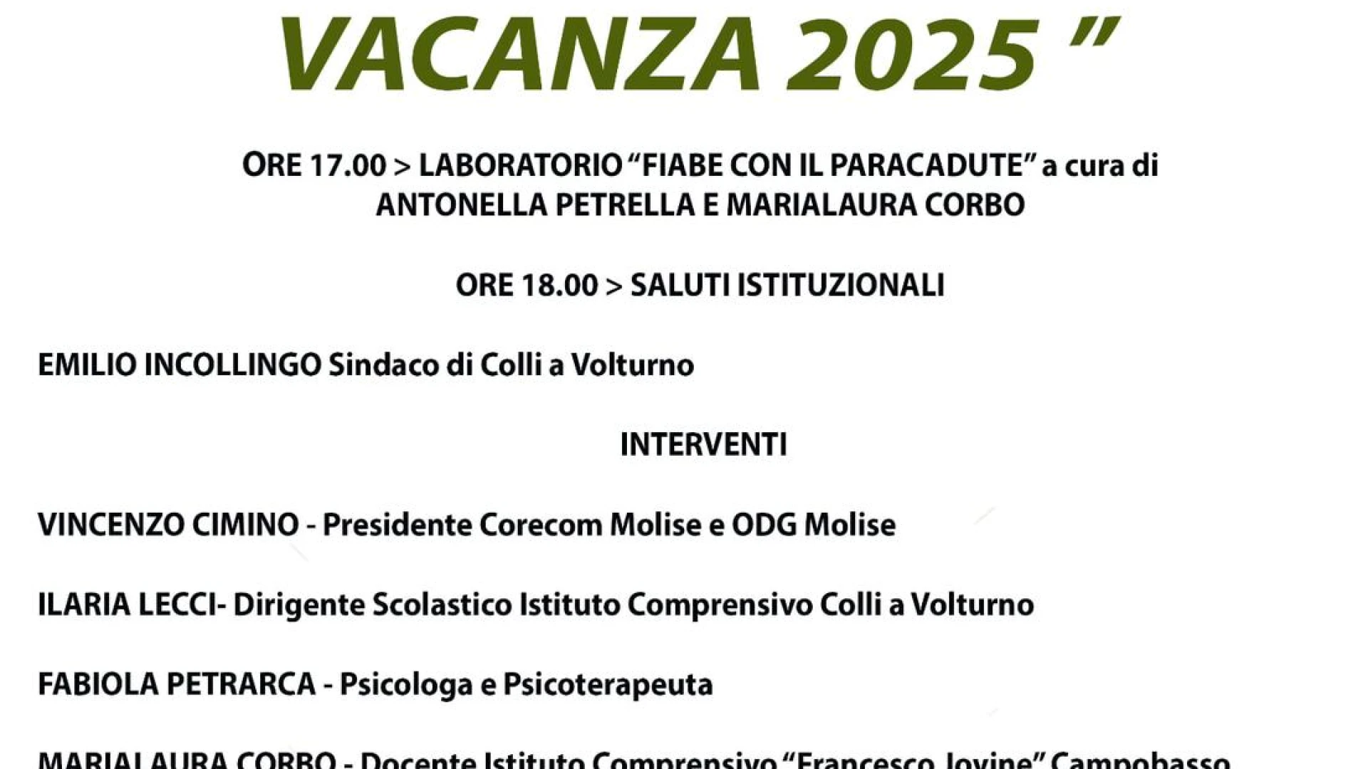 Il convegno si svolgerà giovedì 11 settembre all’interno della Piazza dell’anfiteatro comunale di Colli a Volturno. Alle ore 17 spazio al laboratorio “Fiabe con il paracadute” a cura di Antonella Petrella e Marialaura Corbo. A seguire dalle ore 18 il convegno “Il Bullismo non va in vacanza” con relatori d’eccezione.