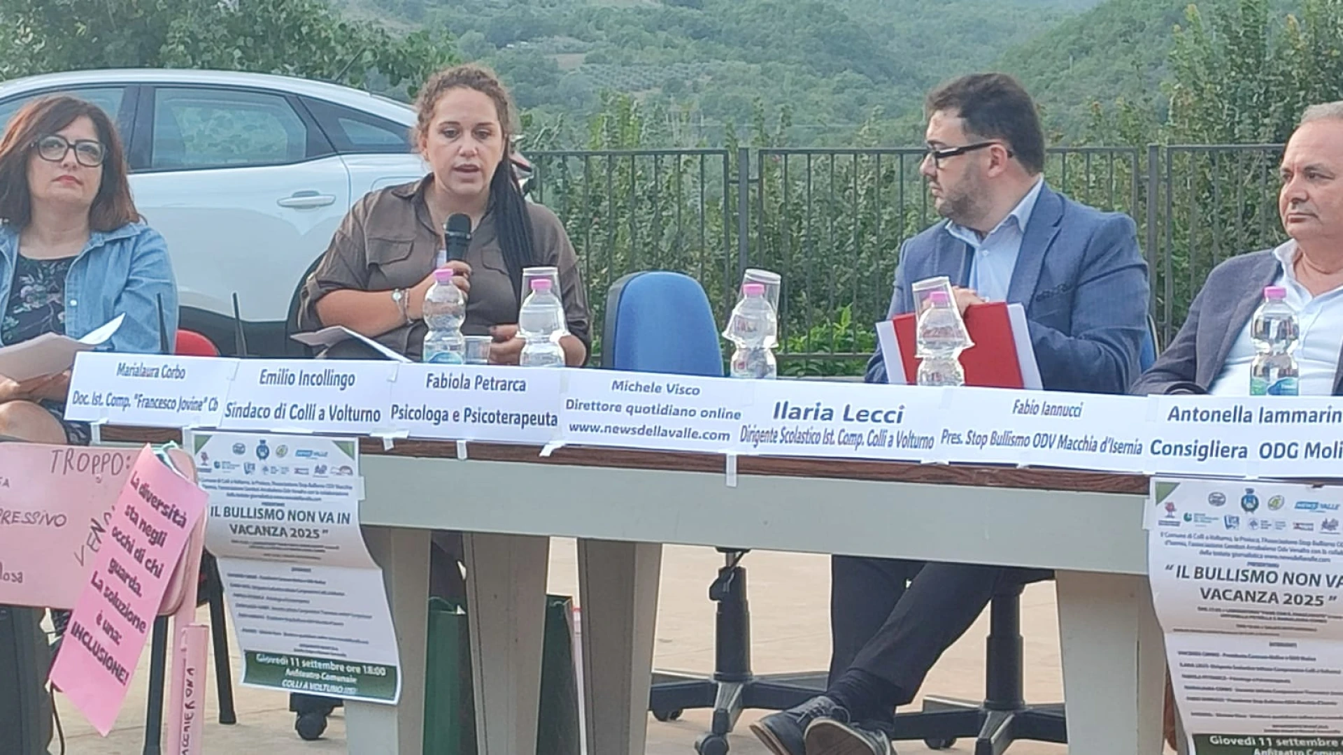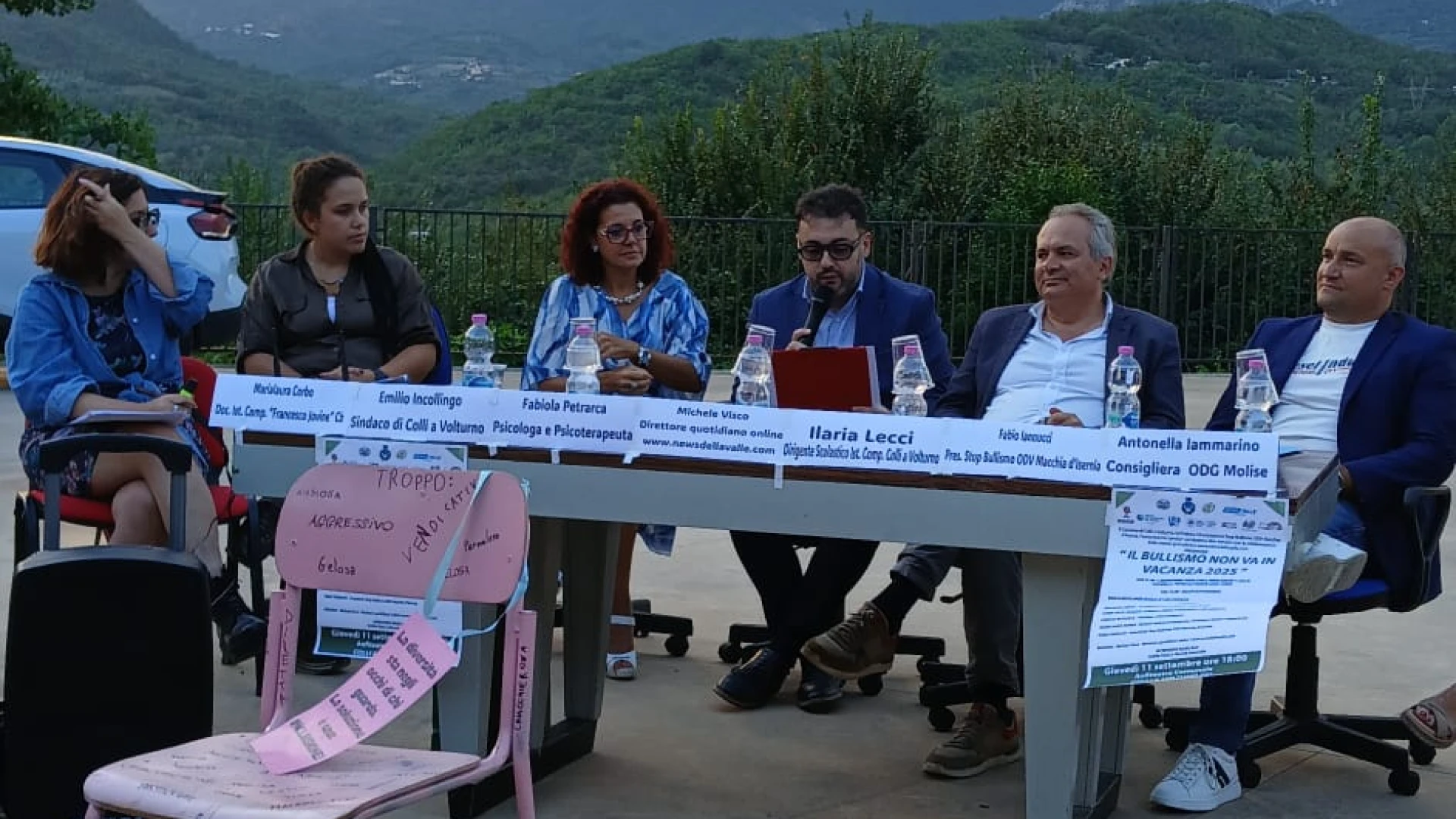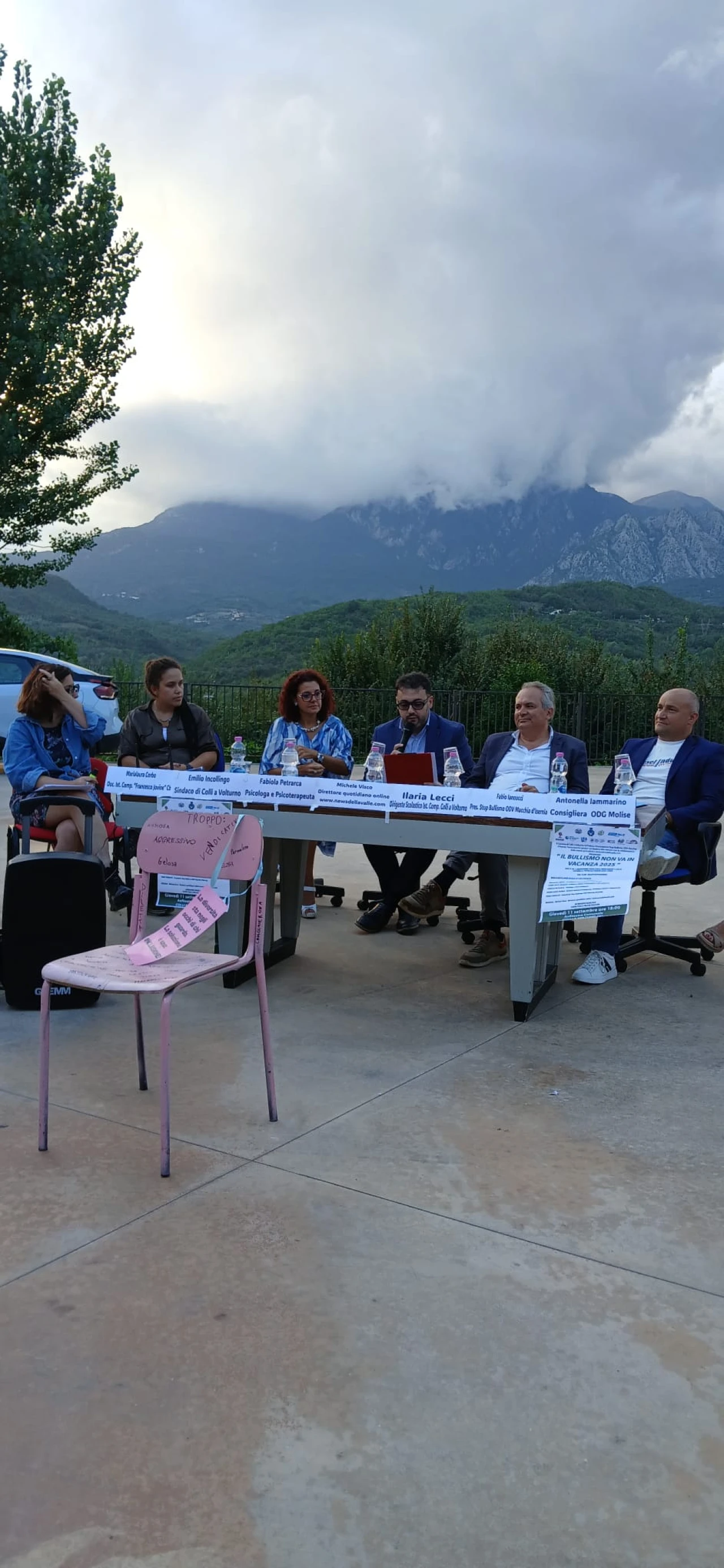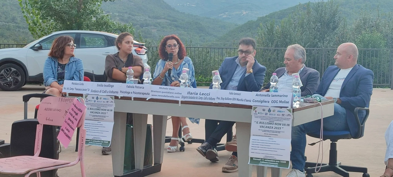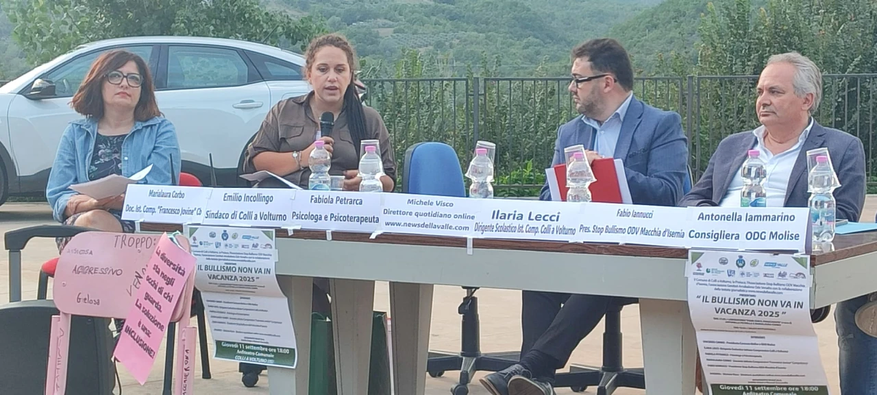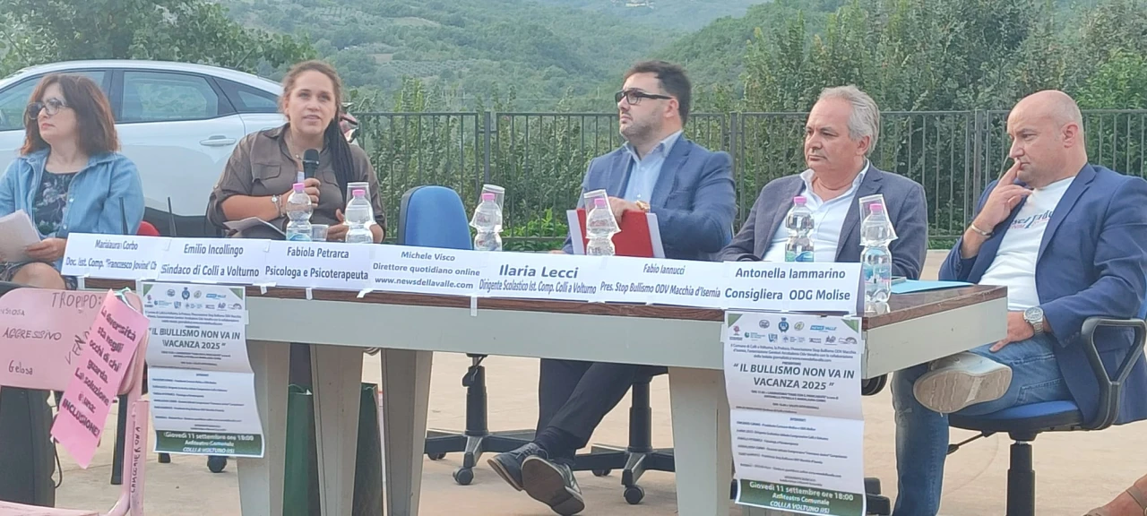 COLLI A VOLTURNO. Quello di giovedì 11 settembre e’ stato un appuntamento sociale e culturale di grande interesse in paese. Nella piazza anfiteatro si e’ svolta la tappa dell’evento “Il Bullismo non va in vacanza” promossa dall’Associazione Stop Bullismo Odv Macchia d’Isernia, dal comune di Colli a Volturno e dall’associazione turistica Pro Loco Colli. Evento realizzato grazie alla partecipazione a livello comunicativo della testata giornalistica www.newsdellavalle.com. I relatori hanno discusso delle tematiche strettamente correlate al bullismo, soprattutto in ambiente scolastico. GUARDA IL SERVIZIO.