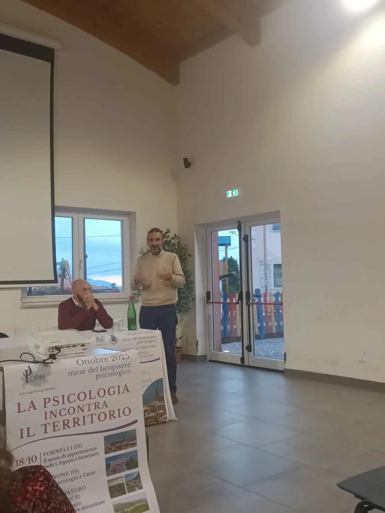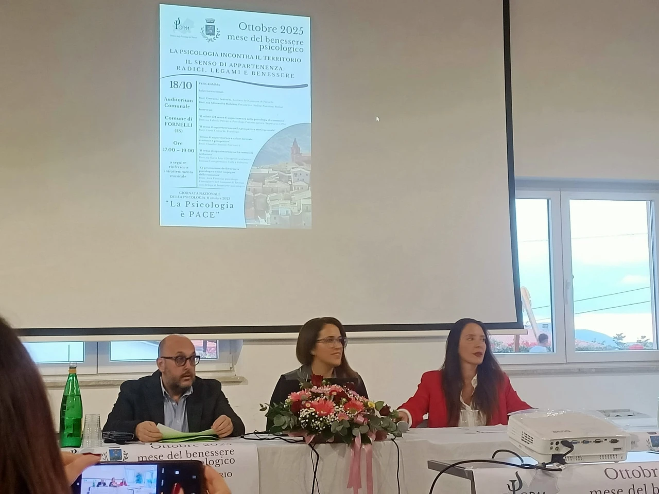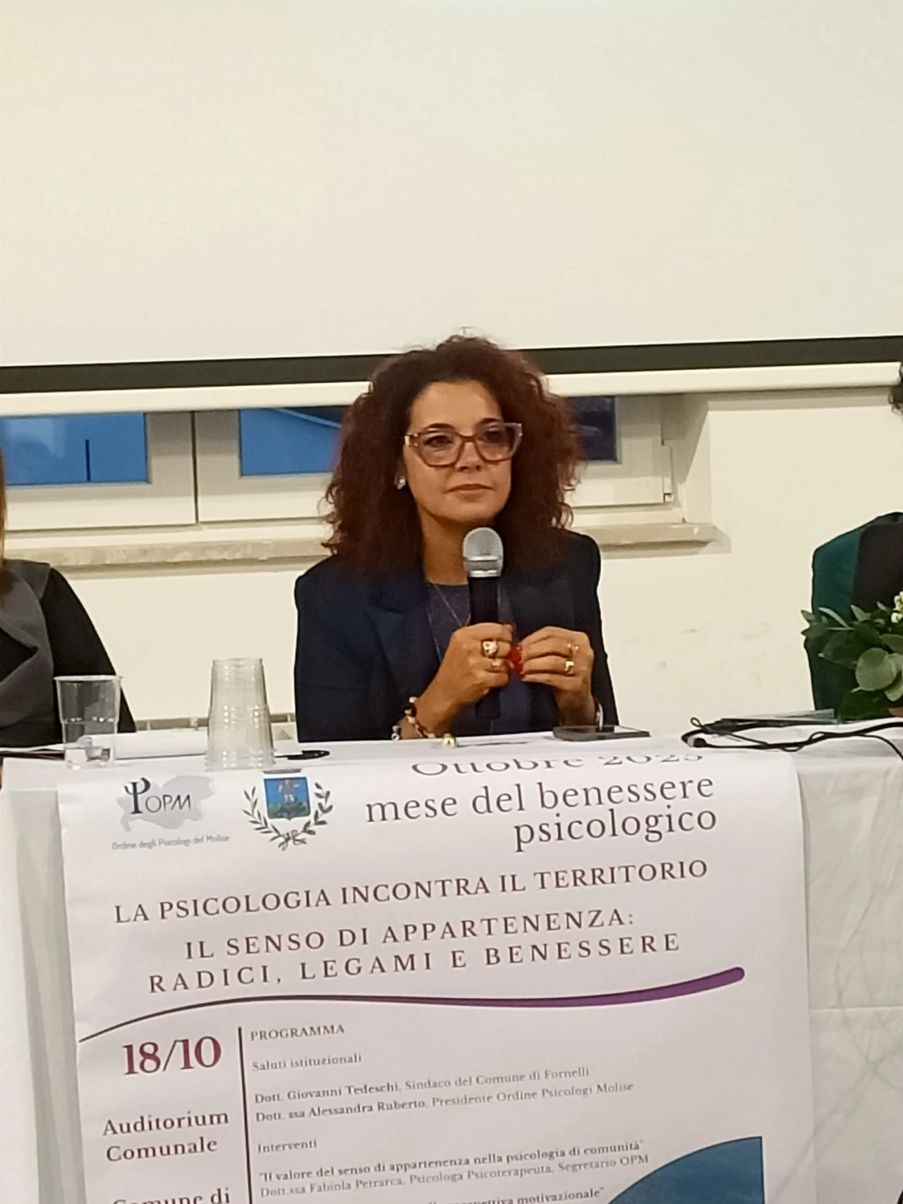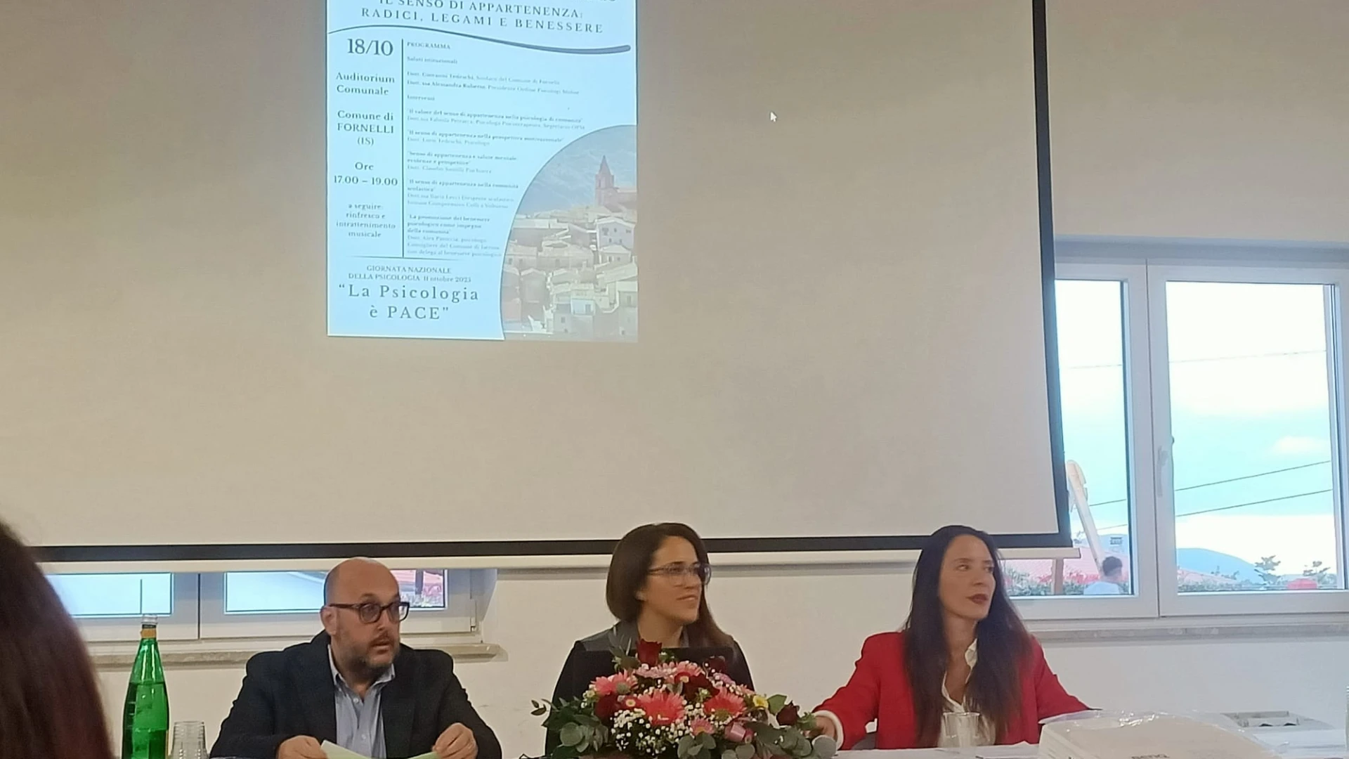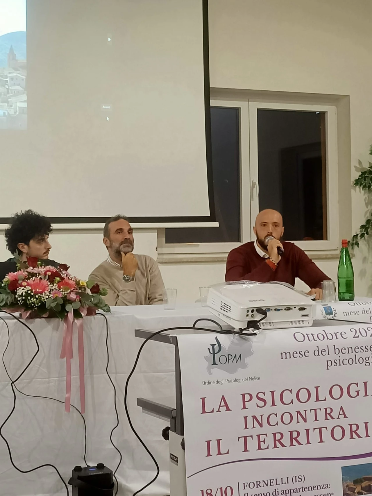 La dott.ssa Fabiola Petrarca psicologa, psicoterapeuta e segretario OPM: il valore del senso di appartenenza nella psicologia di comunità: “Il comportamento degli individui è meglio compreso se si analizza in relazione ai contesti sociali che ne caratterizzano la vita quotidiana. Capire le persone nei loro contesti socioculturali ed economici, analizzando l'interazione tra individuo, gruppo e ambiente per promuovere il benessere psicologico e migliorare la qualità della vita collettiva”. Il dott. Loris Tedeschi psicologo: “Senso di appartenenza, radici e legami, chi resta deve trovare nuove forme di appartenenza mentre chi parte porta con sé ricordi che possono essere fonte di legami futuri. I legami devono essere valorizzati. La sfida non è solo demografica, è psicologica e identitaria”. Il dott. Claudio Santilli, psichiatra, senso di appartenenza e salute mentale: “Mi ha sempre affascinato il concetto junghiano di “sincronicità”, secondo il quale a volte accadono coincidenze tra più eventi senza un evidente nesso di causa, ma che assumono un particolare significato se le correliamo alle nostre esperienze interiori. Non ho potuto non pensare alla sincronicità quando mi hanno invitato a partecipare a un evento formativo in Molise, per parlare di come il senso di appartenenza influenza la salute mentale. La mia bisnonna Sofia nacque proprio a Fornelli, ed è a queste lande che potrei attribuire il mio senso di appartenenza. L’identità personale non può scindersi da quella sociale perché l’essere umano non è semplicemente un essere ma è, meravigliosamente, un esser-ci ai fini del benessere e della salute mentale”. Il Dirigente scolastico dell’Istituto Comprensivo di Colli al Volturno, dott.ssa Ilaria Lecci, il senso di appartenenza nella comunità scolastica: “La scuola ha il compito di favorire il senso di appartenenza al territorio, di fare rete e contribuire a favorire il benessere. L’importanza delle relazioni per educare le nuove generazioni al rispetto. Felice di essere Dirigente scolastico in un territorio tutto da vivere e scoprire”.