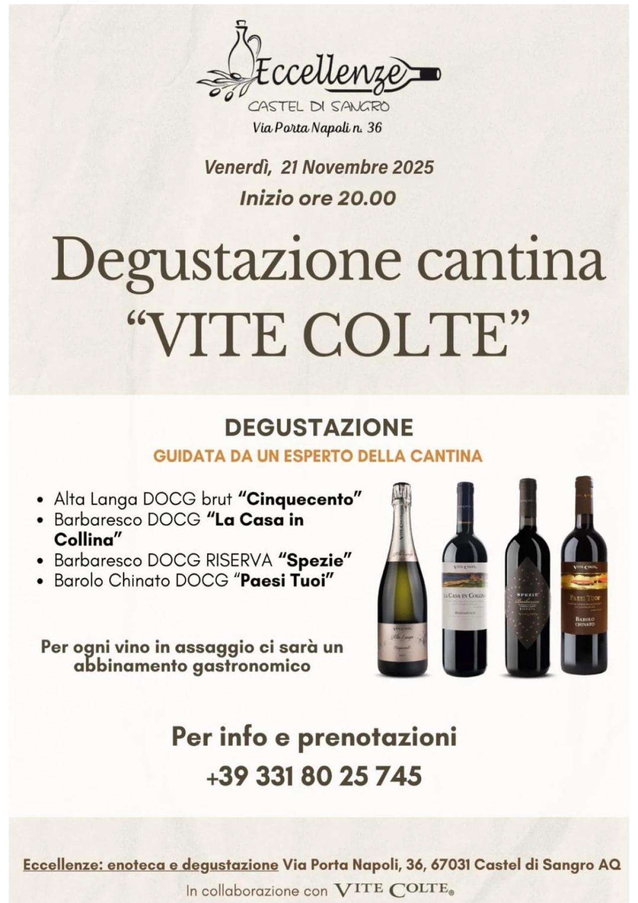 CASTEL DI SANGRO. Da Eccellenze enoteca e degustazione, appuntamento assolutamente da non perdere in programma venerdì 21 novembre. Una serata per gli appassionati del buon vino in compagnia della gran selezione di vini della Cantina “VITE COLTE”. Una serata che vedra’ abbinamenti speciali con food abbinato scelti da Franco Gasbarro titolare di Eccellenze.