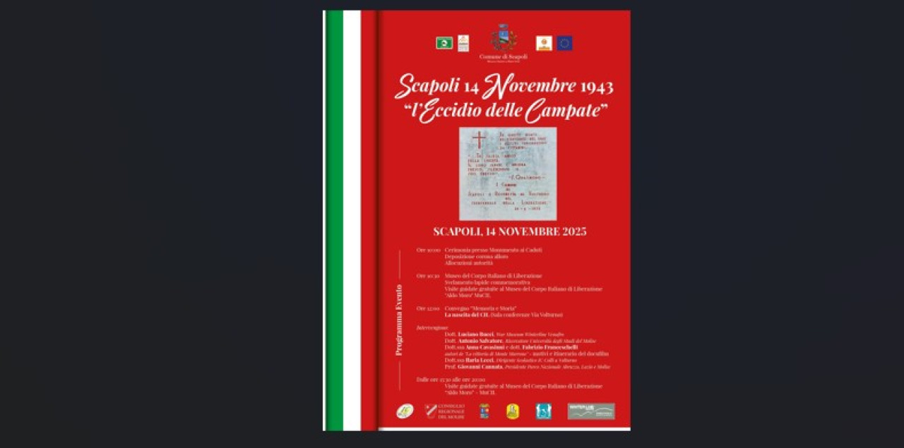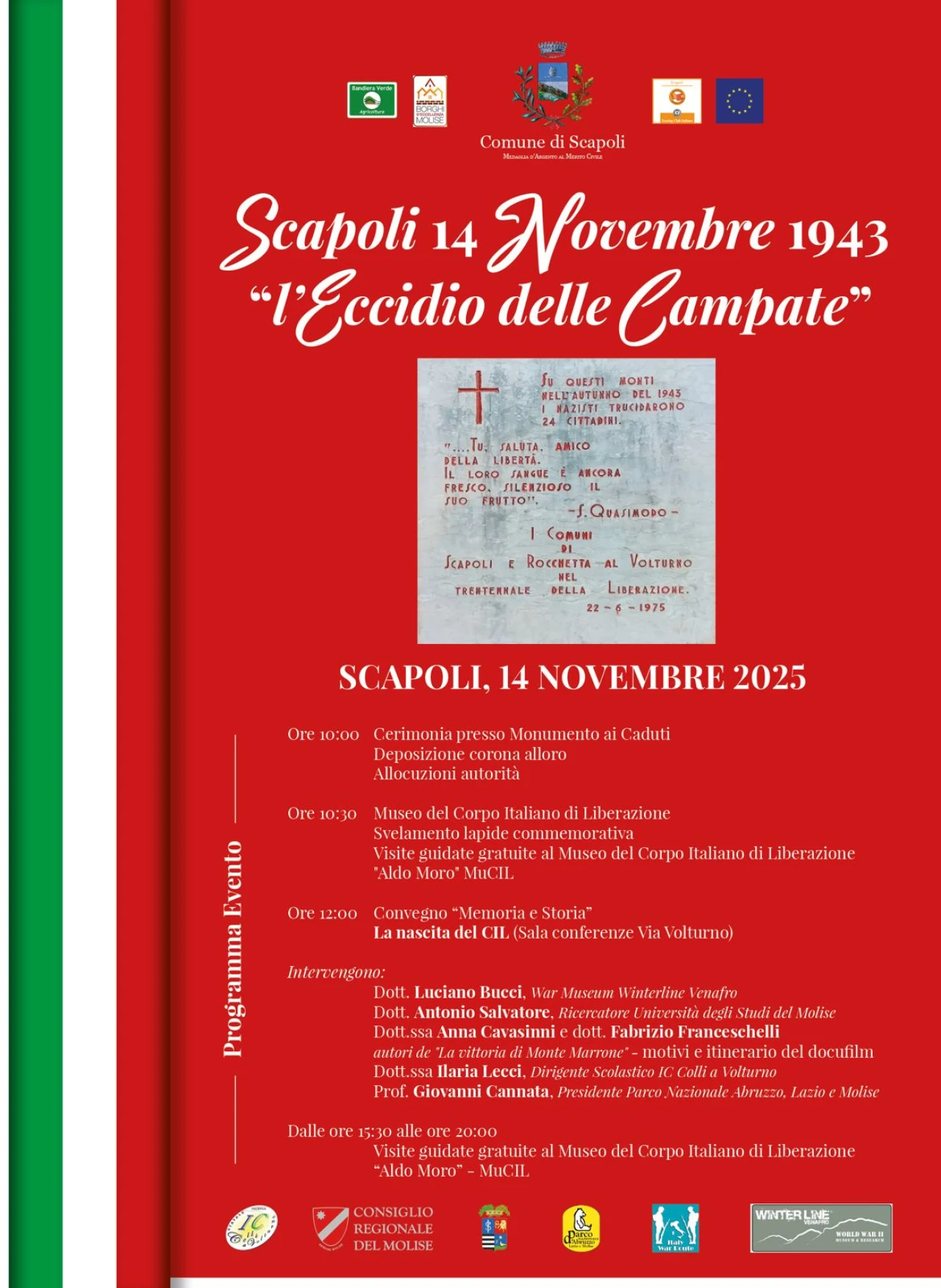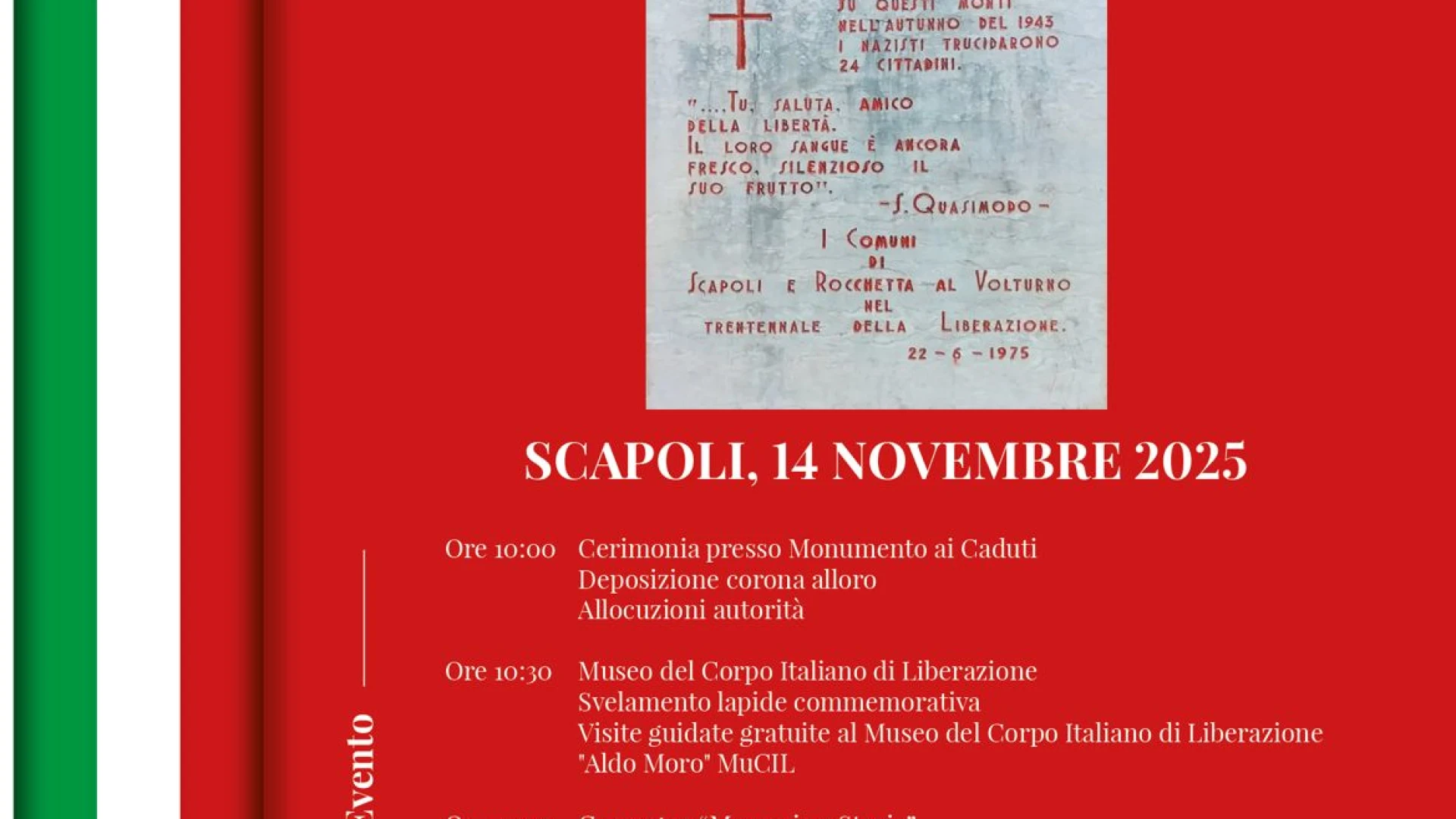 Il programma dell’evento prevede alle ore 10 presso il Monumento di Caduti di Scapoli la deposizione di una corona di alloro e le allocuzioni delle autorità presenti. A seguire alle ore 10.30 presso il Museo del Corpo Italiano di Liberazione verrà svelata una lapide commemorativa a tutti i presenti. Seguiranno visite gratuite al Museo del Corpo Italiano di Liberazione “Aldo Moro” denominato MuCIL.