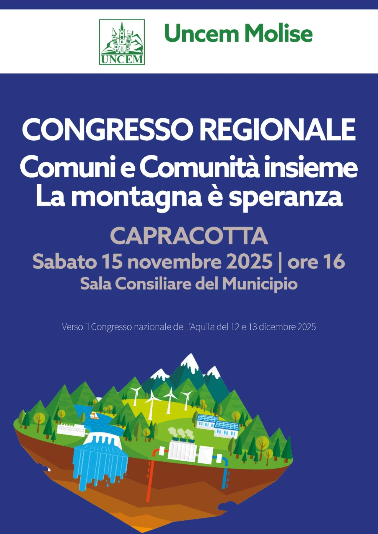CAPRACOTTA. Un dialogo tra Comuni, Enti locali montani, imprese, associazioni, cittadini. Tutti protagonisti insieme, con Uncem, nel pomeriggio di sabato 15 novembre, dalle ore 16 in Municipio a Capracotta. Uncem organizza il Congresso regionale del Molise, con la Delegazione guidata da Candido Paglione.