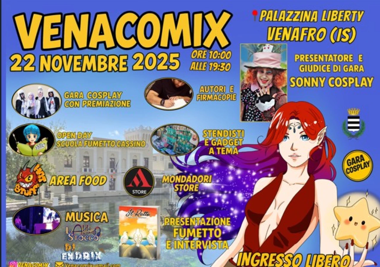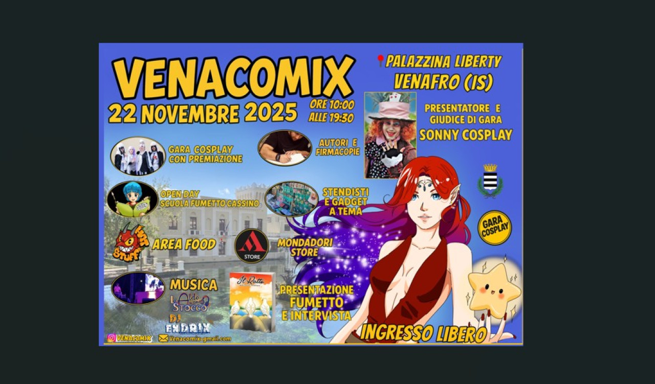 Venafro si prepara ad accogliere la sua prima grande fiera del fumetto, cosplay e cultura pop. Appuntamento imperdibile sabato 22 novembre 2025 per un evento che promette di trasformare la città in un regno di fantasia. Il fermento è palpabile: per la prima volta in assoluto, Venafro ospiterà il suo festival dedicato al mondo comix, fumetto e cosplay. Il Venacomix ideato dal giornalista Lello Castaldi e da Antonietta Sorrentino – Artista e Fumettista, non sarà solo una fiera, ma una vera e propria celebrazione della cultura pop che porterà nella nostra città artisti, doppiatori, cosplayer e migliaia di appassionati da tutto la regione. Gli organizzatori stanno lavorando alacremente per finalizzare un programma ricco e variegato. L’appuntamento dunque è fissato per il giorno 22 novembre 2025 presso la Palazzina Liberty di Venafro. L’ingresso è gratuito e gli orari di apertura andranno dalle ore 10 alle ore 19.