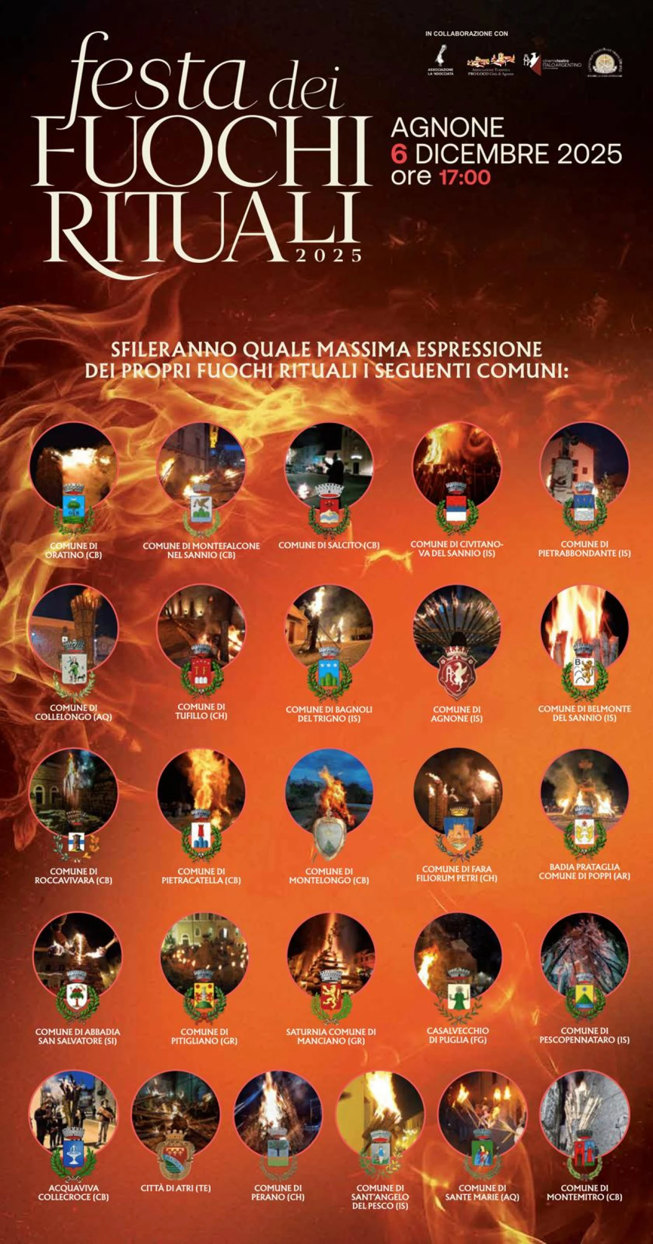 Saranno 26 i Comuni che sfileranno con le loro espressioni dei riti legati al fuoco. Dal Molise ci saranno Oratino, Montefalcone nel Sannio, Salcito, Civitanova del Sannio, Pietrabbondante, Pescopennataro, Roccavivara, Montelongo, Bagnoli del Trigno, Agnone, Belmonte del Sannio, Pietracatella, Acquaviva Collecroce, Sant’Angelo del Pesco e Montemitro. Dall’Abruzzo parteciperanno Collelongo, Tufillo, Fara Filiorum Petri, Perano, Atri e Sante Marie. Per la Toscana i fuochi di Badia Prataglia di Poppi, Pitigliano, Abbadia San Salvatore e Saturnia di Manciano. E, infine, per la Puglia il Comune di Casalvecchio.Il percorso dell’evento si snoderà lungo tutto il centro di Agnone, tra fuochi mobili e fuochi fissi. Ad aprire il corteo saranno le torce di Salcito, si chiuderà con un particolare falò di Sant’Antonio con la forma del teatro sannitico di Pietrabbondante. E il dicembre delle fiamme proseguirà con un ricco calendario composto da diversi appuntamenti, tra cultura e tradizioni.Il mese del fuoco di Agnone è realizzato dal Comune di Agnone, in collaborazione con la Regione Molise e la Camera di Commercio del Molise, con il sostegno di diverse realtà e il prezioso supporto di Poste Italiane, azienda che da anni è main sponsor del cartellone e continua a essere attenta alla valorizzazione del patrimonio culturale del territorio.