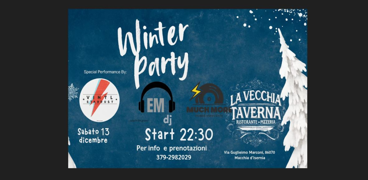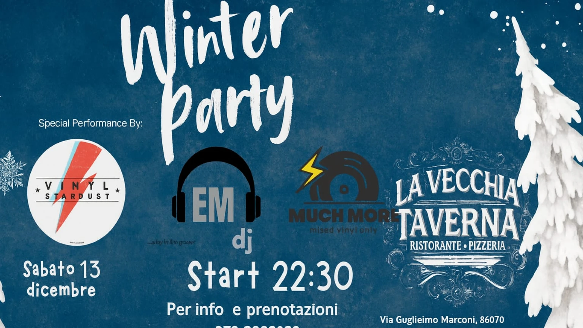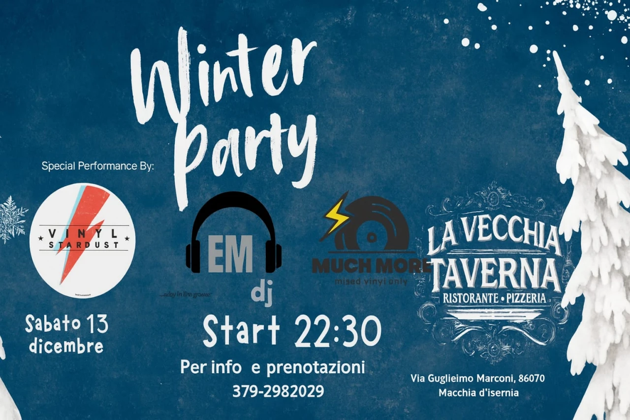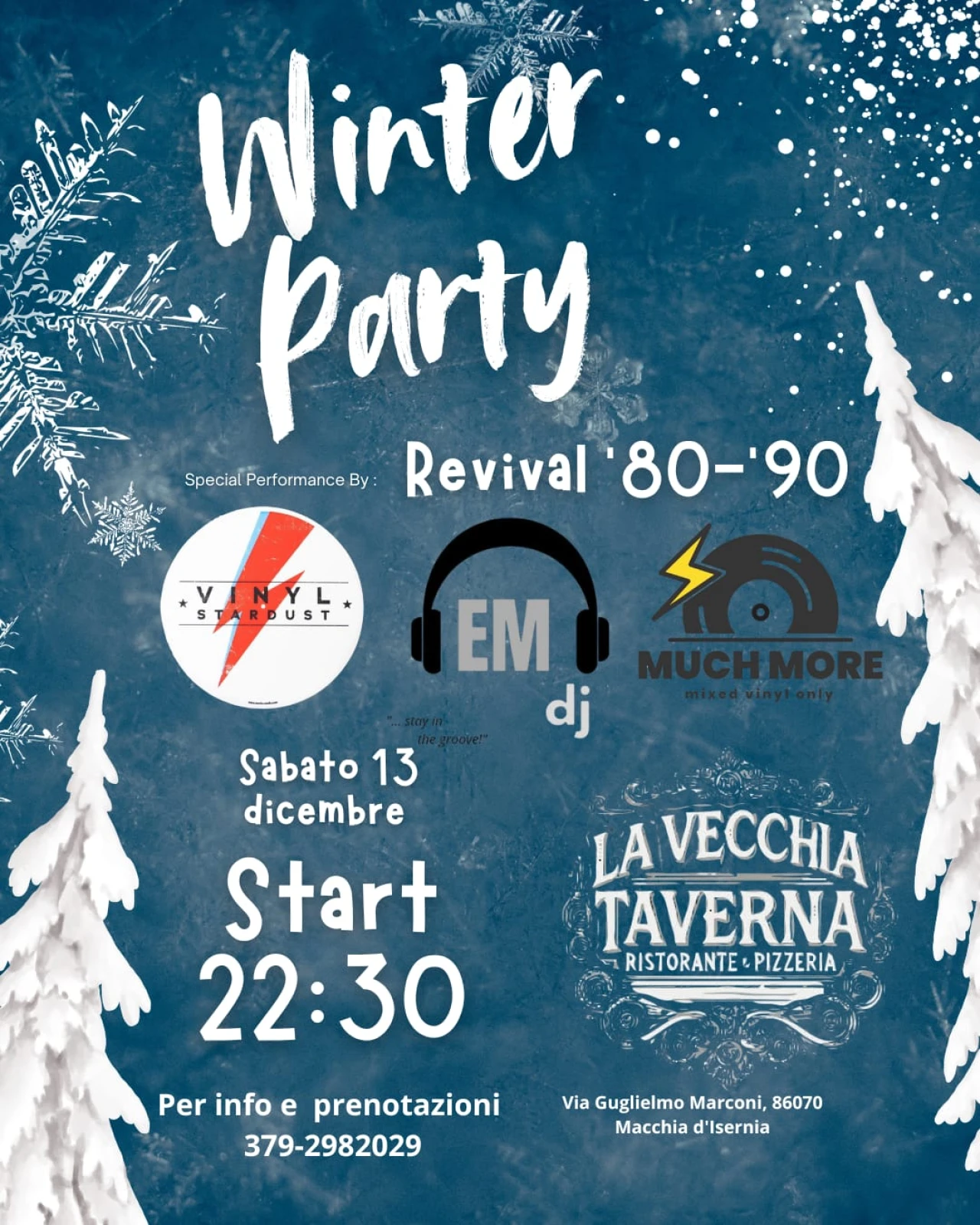 REDAZIONALE PUBBLICITARIO-MACCHIA D'ISERNIA. Una serata assolutamente da non perdere. La nuova ala del ristorante - pizzeria "La Vecchia Taverna" a Macchia d'Isernia, simpaticamente rinominata La Tavernetta dai gestori Roberto e Gianluca, ospitera il "Winter Party". La grande musica dance anni 80' e 90' da ascoltare e ballare tutta in una notte. Performance speciali in consolle con dj Vinyl Stardust, Emsi Dj e Dj Much More. Tutti i clienti e gli amanti della buona musica potranno degustare a partire da ore di cena delle pizze preparate alla Vecchia Taverna, del servizio di ristorazione e risto-pub. Il revival dance prendera' inizio alle ore 22.30.
