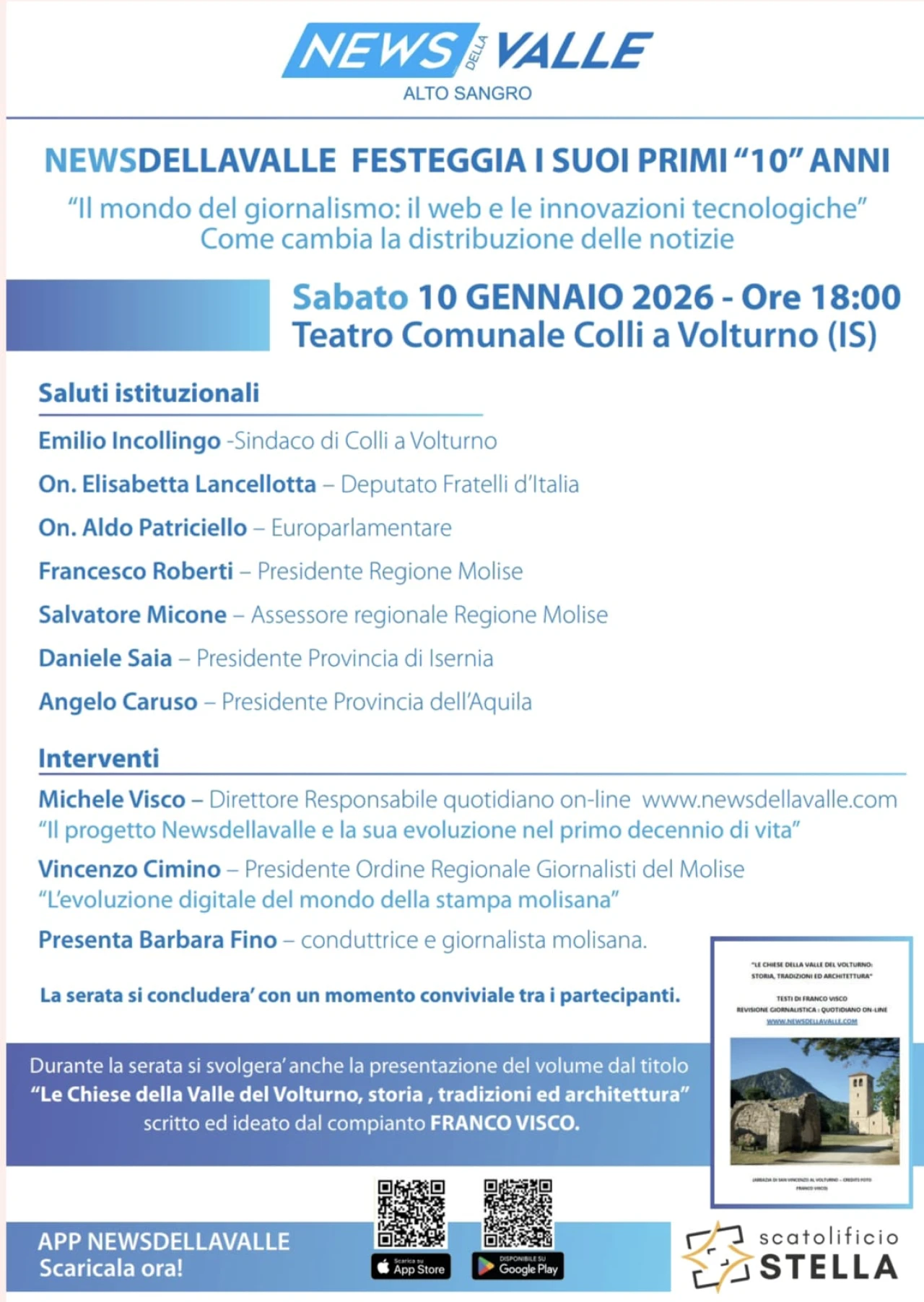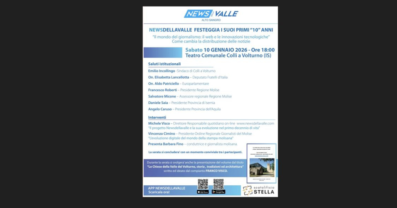 Sabato 10 gennaio 2026 con inizio alle ore 18 , il teatro comunale di Colli a Volturno ospiterà l’evento per il decennale della testata giornalistica. Appuntamento di spessore e rilievo per il mondo del giornalismo del Molise e dell’Alto Sangro che vivrà di due momenti. La prima parte dell’evento sarà dedicata allo svolgimento del convegno dal titolo “Il Mondo del Giornalismo: il web e le innovazioni tecnologiche. Come cambia la distribuzione delle notizie”. Relatori di rilievo discuteranno della tematica.