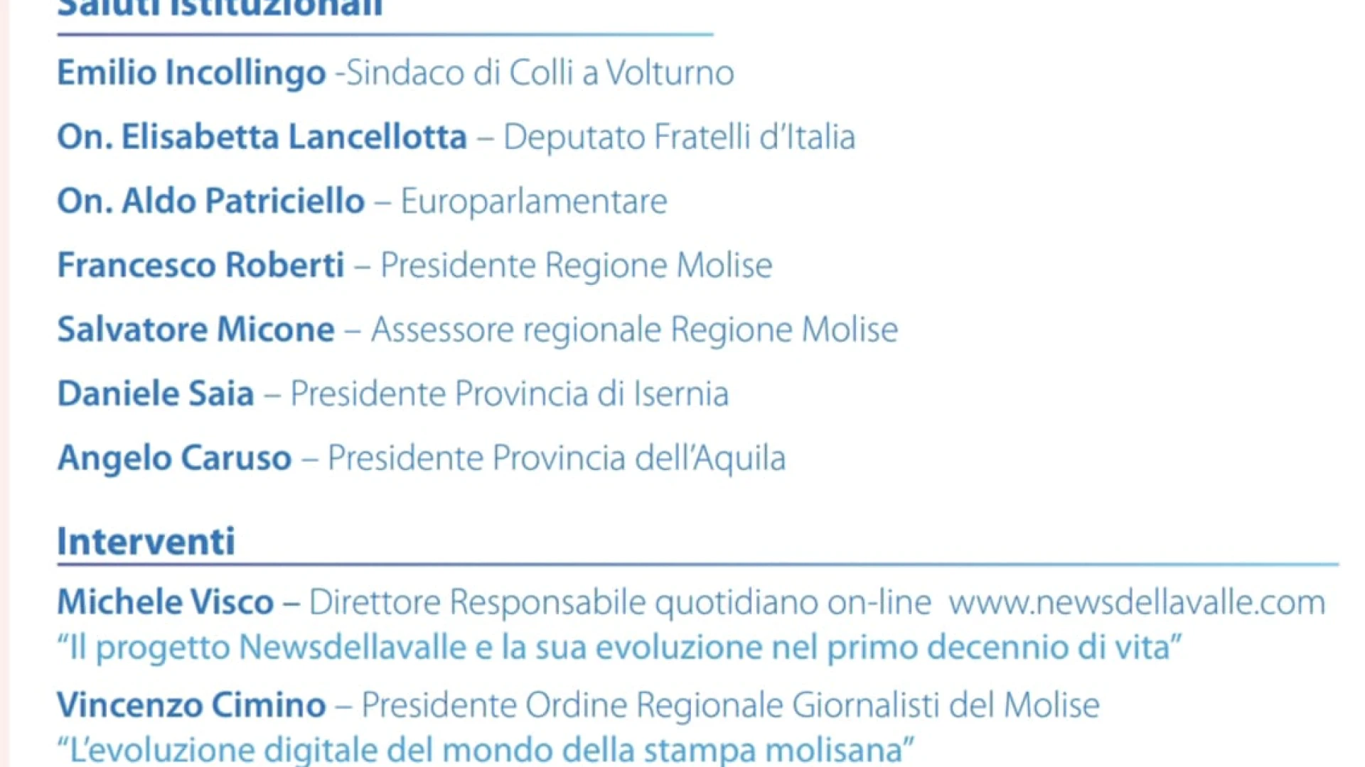 Tra i presenti per i saluti istituzionali: Emilio Incollingo sindaco di Colli a Volturno, Onorevole Elisabetta Lancellotta deputato di Fratelli d’Italia per il Molise, Onorevole Aldo Patriciello Europarlamentare, Francesco Roberti presidente Regione Molise, Salvatore Micone assessore regionale Molise, Daniele Saia presidente Provincia di Isernia, Angelo Caruso presidente Provincia dell’Aquila.