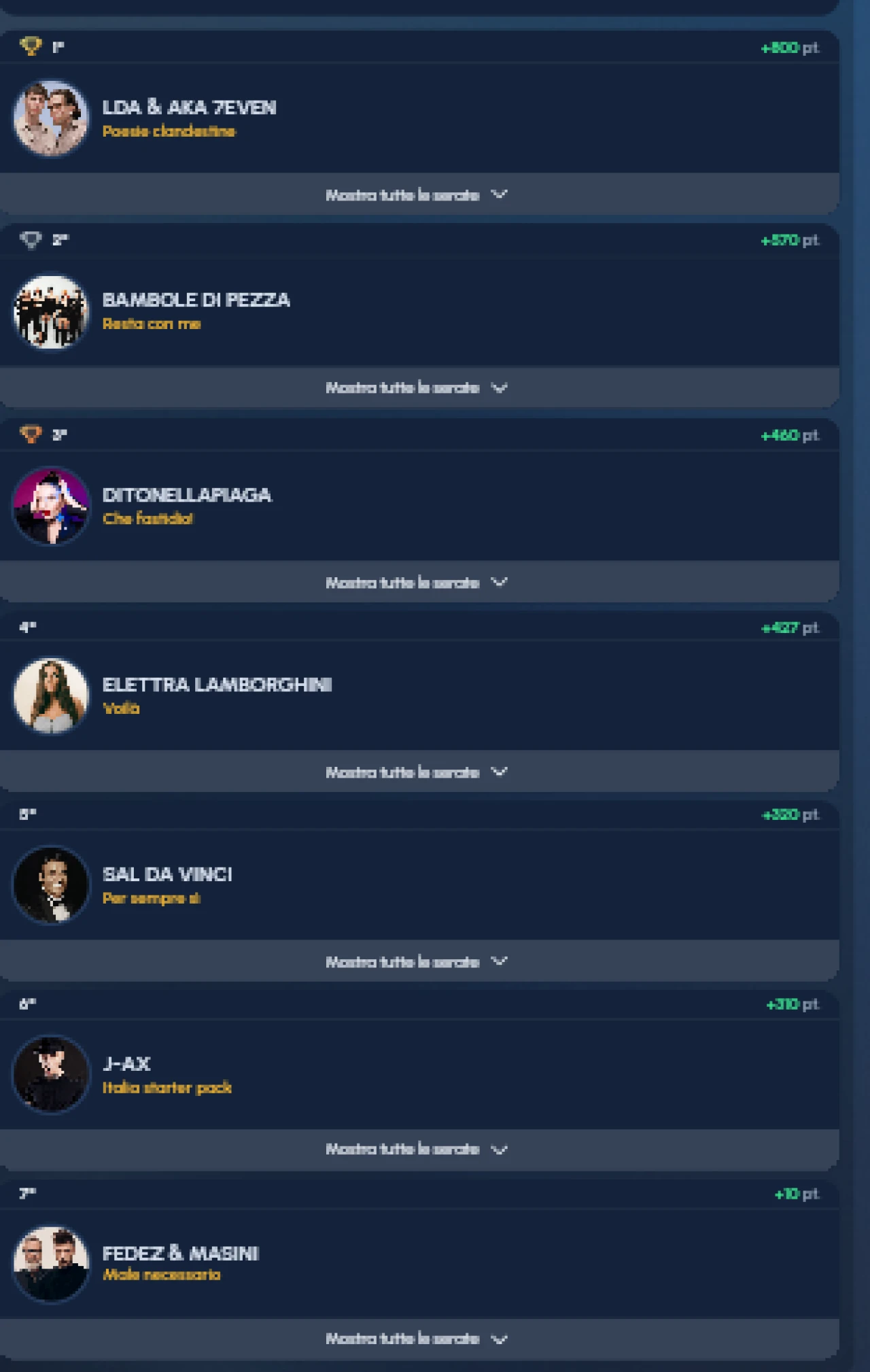 Altri artisti hanno contribuito in modo significativo con punteggi medi, come Elettra Lamborghini (427 punti) e Samurai Jay (487 punti), mentre nomi storici come Raf e Francesco Renga hanno raccolto punteggi più modesti, rispettivamente 130 e 135 punti. La classifica finale degli artisti dimostra come la strategia nella scelta dei titolari e la capacità di accumulare punti bonus abbiano determinato le sorti delle squadre, rendendo il FantaSanremo 2026 una competizione entusiasmante fino all’ultima serata.