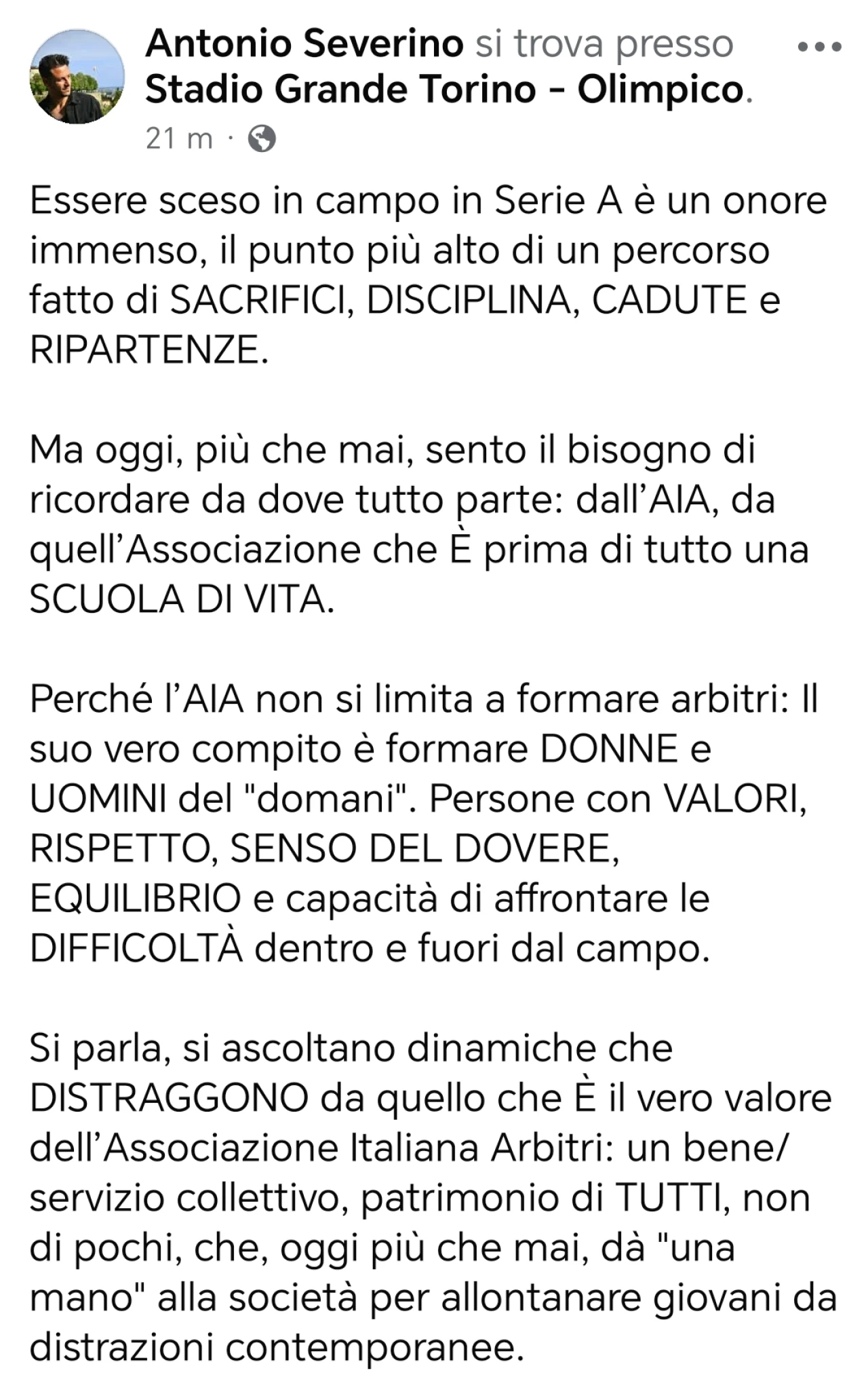 La visione di Severino è netta: se si smarrisce il patrimonio valoriale, si perde l'identità stessa della categoria. Non possono esistere grandi arbitri se mancano, alla base, persone con una struttura morale solida. Indossare la divisa significa dunque rappresentare un’idea di crescita che precede il ruolo tecnico. È un appello alla difesa dell’essenza dell’Associazione, che deve tornare a investire sulla costruzione dell'individuo come priorità assoluta. Quella di Severino non è solo una riflessione, ma una vera e propria missione dichiarata: proteggere a ogni costo questa funzione pedagogica dell'AIA, la stessa che lo ha plasmato come uomo e alla quale dichiara di dover tutto ciò che è diventato oggi. Un ringraziamento pubblico che sa di impegno civile per il futuro delle prossime generazioni di direttori di gara.
