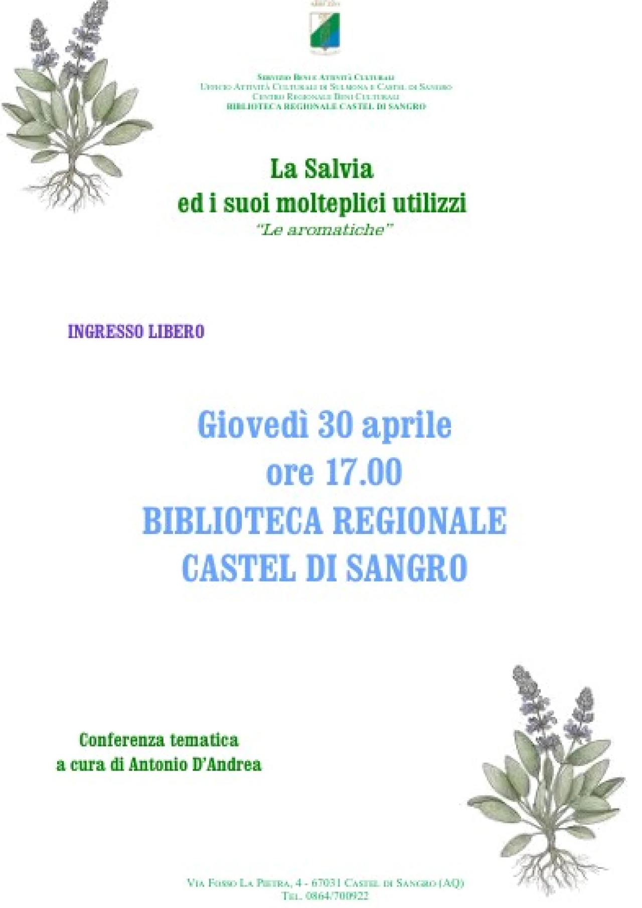 CASTEL DI SANGRO. Giovedì 30 aprile ore 17.00 - Ingresso Libero. Antonio D’ Andrea, noto attivista, ecologista e figura di rilievo del Borgo di Capracotta (IS), nato nel 1953, illustrerà in un convegno la sua dedizione alla promozione di pratiche sostenibili, alla riscoperta delle tradizioni locali. Un’ interessante lezione sulle erbe aromatiche e le loro proprietà, incentrata sulla Salvia ed i suoi impieghi.