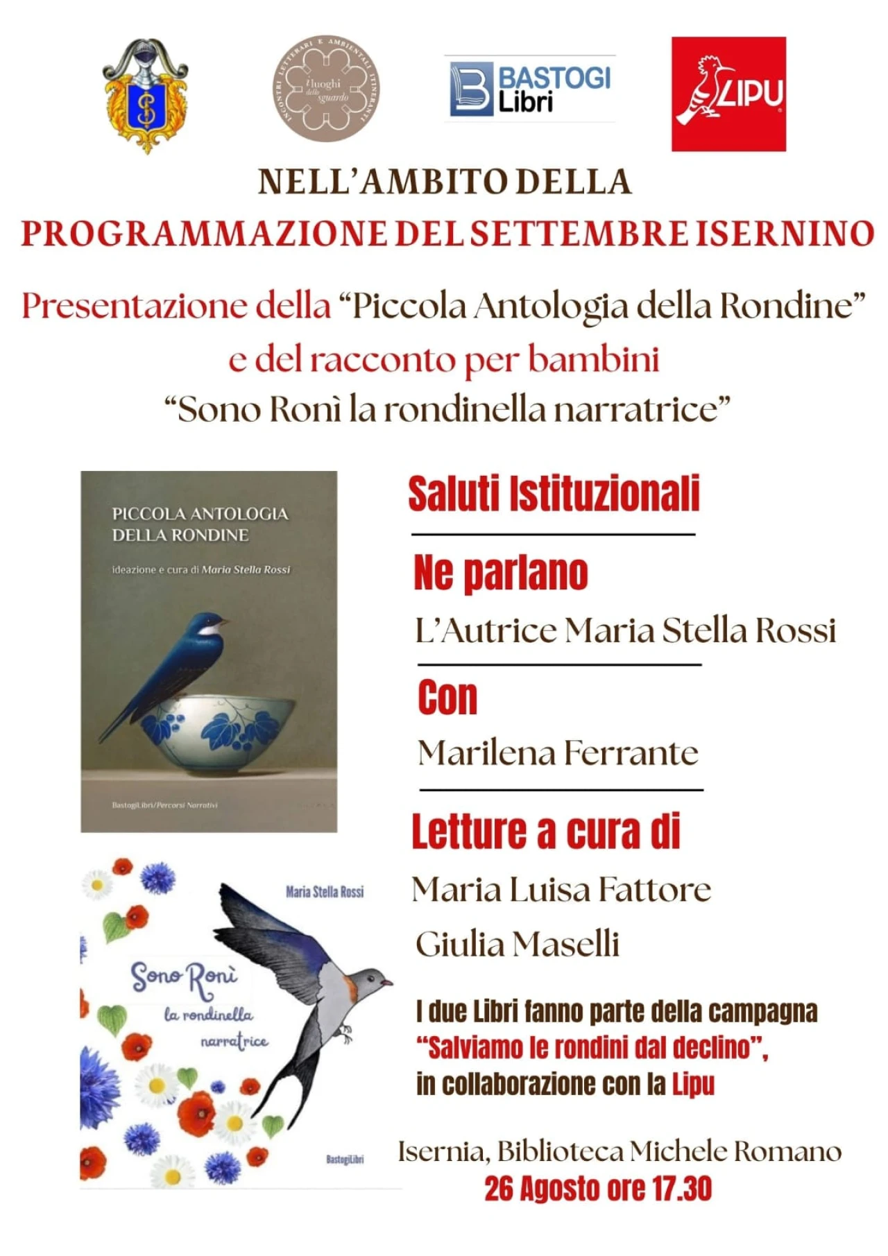 ISERNIA. Il 26 agosto si svolge nell’ambito del Settembre Isernino la presentazione della Piccola antologia della rondine e del racconto per i piccoli Sono Ronì la rondinella narratrice che fanno parte della Campagna “Salviamo le rondini dal declino” proposta da Maria Stella Rossi, autrice dei due libri, entrambi editi dalla BastogiLibri. Nella Biblioteca Michele Romano di Isernia, a partire dalle 17.30, si svolge questa duplice presentazione che ha come tema la Rondine, e propositi di salvezza e di protezione per questo volatile iconico.