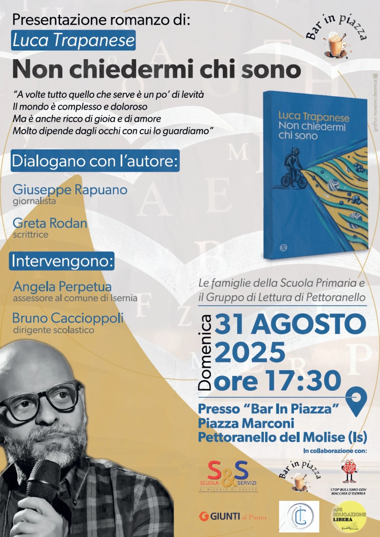 PETTORANELLO DEL MOLISE. Il 31 agosto 2025 alle ore 17:30 il Molise ospita lo scrittore Luca Trapanese, autore molto noto sia per il suo grande talento che per la sua vita di genitore, divenuta un film, "Nata per te", che proprio in questi giorni approda sul piccolo schermo, precisamente su Canale 5. Il film è tratto dal romanzo omonimo che racconta la storia di Luca e di sua figlia Alba, bambina affetta dalla sindrome di Down e che Luca adottò quando lei era da poco venuta al mondo, rifiutata dalla sua famiglia di origine, ma con un progetto grande per lei e per suo padre: una famiglia d'amore incondizionato, un reciproco volersi schiettamente bene. "La nostra è la storia di un ragazzo single e gay che, con grande fatica e determinazione, riesce ad adottare una bambina appena nata con sindrome di Down. Ripeto sempre che la nostra non è una storia straordinaria, né una famiglia speciale: è una famiglia come tante, perché al centro c’è l’amore", dichiara Trapanese.Lo scrittore, che è anche Assessore alle politiche sociali al comune di Napoli, presenta in Molise l'ultimo suo romanzo, "Non chiedermi chi sono", edito da Salani, un'opera di grande valore letterario, nella quale con una scrittura brillante narra le parallele esistenze del diciannovenne Livio e di Vittorio, giovane uomo affetto da serie problematiche psichiatriche. È un romanzo che racconta l'amicizia ma anche il disagio mentale e il bisogno che la società lo riconosca e lo affronti, non demonizzandolo o allontanandolo come altro da sé.L'appuntamento è per il 31 agosto 2025 alle 17:30 in un luogo particolare a Pettoranello del Molise, il "Bar in Piazza", un posto informale e accogliente di condivisione.A dialogare con l'autore, il giornalista Giuseppe Rapuano e la scrittrice Greta Rodan. Intervengono Angela Perpetua, assessore al comune di Isernia, e Bruno Caccioppoli, dirigente scolastico.