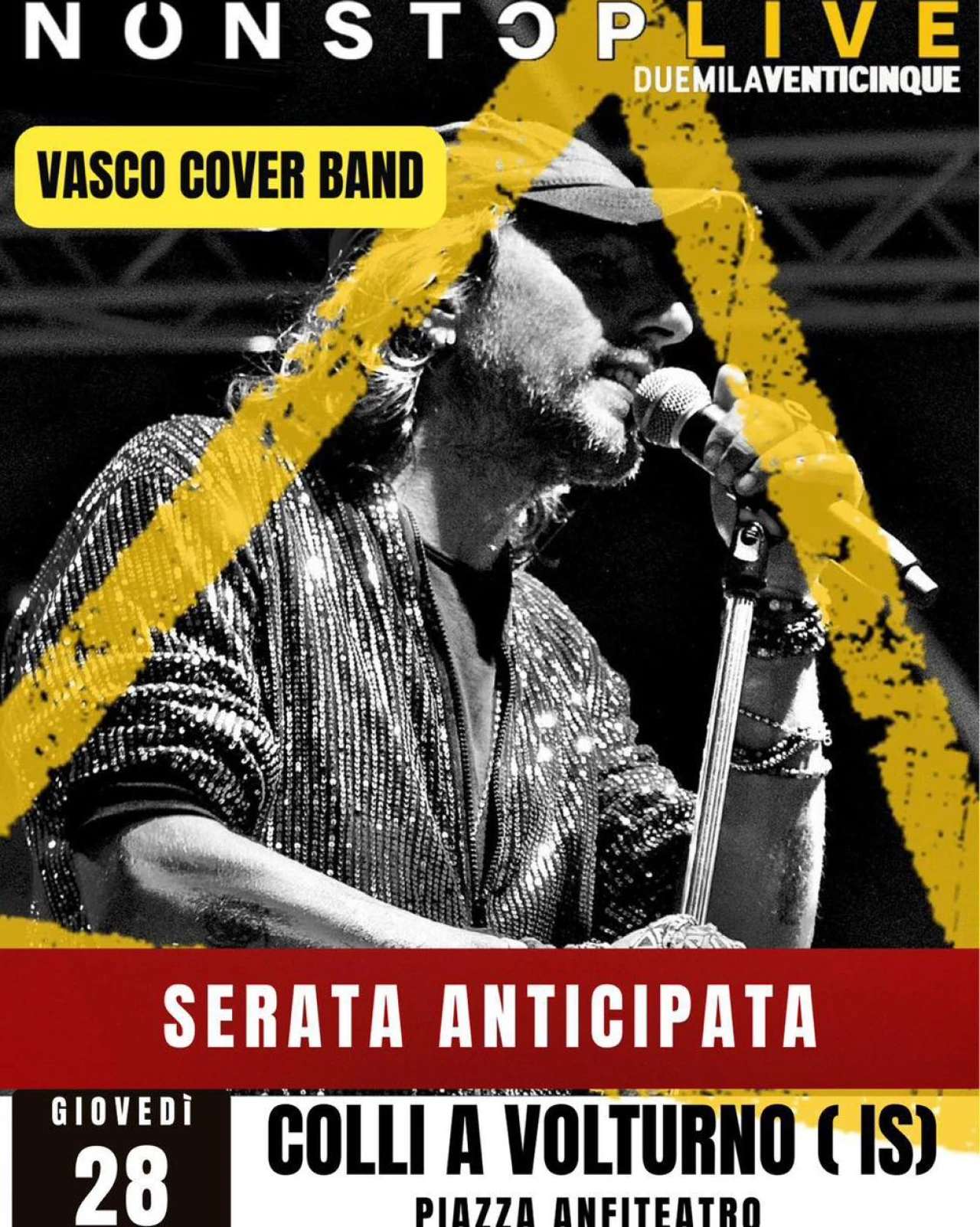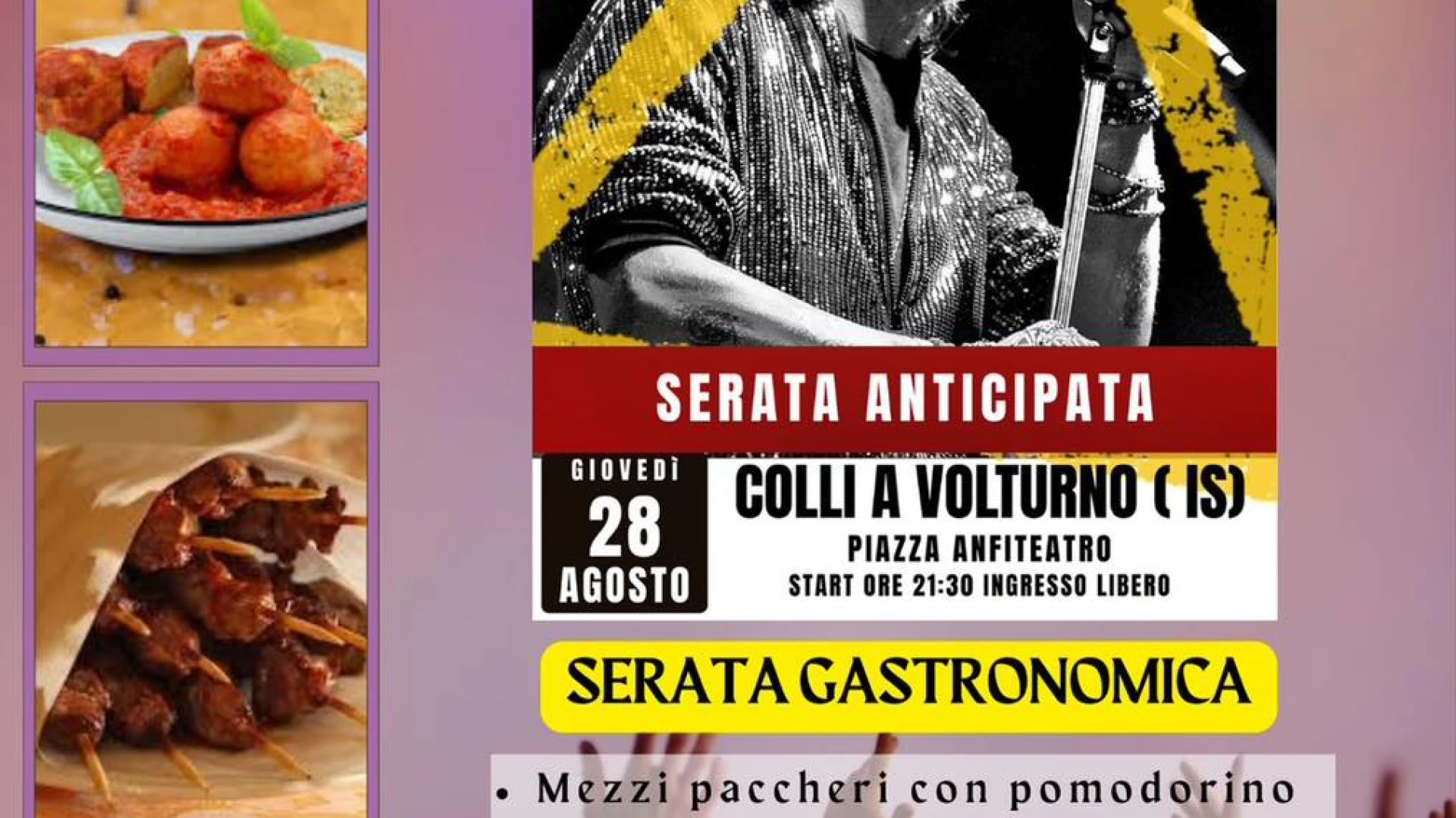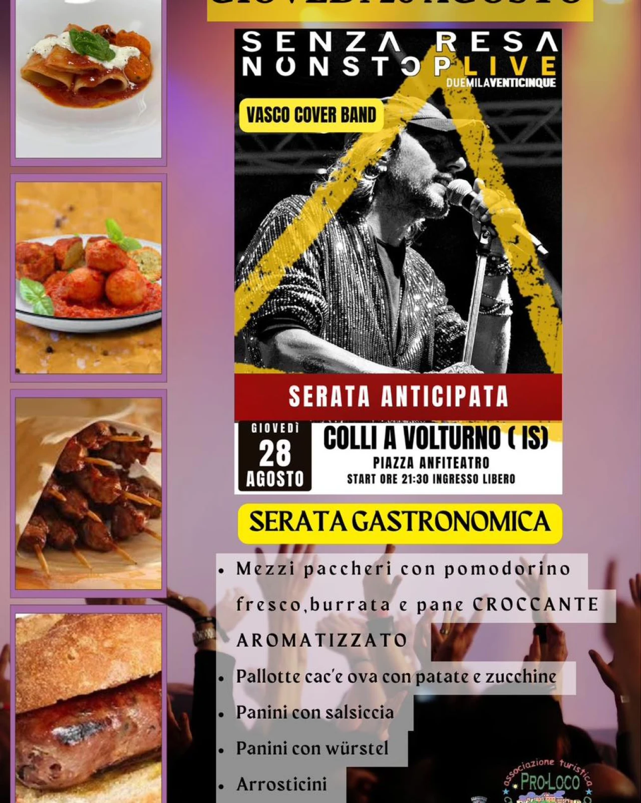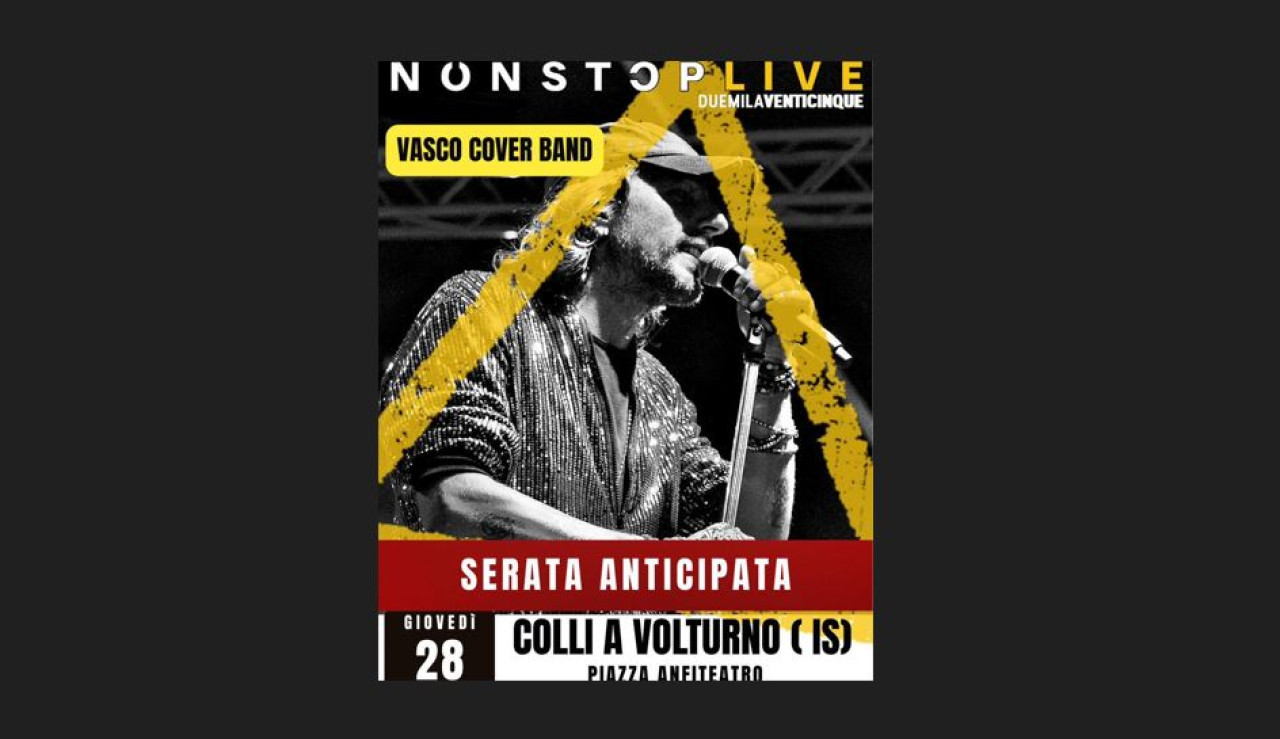 COLLI A VOLTURNO. L’Associazione turistica Pro Loco propone a partire dalle ore 20 di questa sera l’ultimo evento estivo per quel che riguarda la stagione 2025. Una serata gastronomica in Piazza Anfiteatro con l’esibizione della Vasco Cover Band “Senza Resa Non Stop Live”. Il menu’ della serata con pietanze a pagamento comprende: mezzi paccheri con pomodorino fresco , burrata e pane croccante; pallotte cac’ e ova con patate e zucchine; panini con salsiccia; panini con wurstel; arrosticini; bevande varie. Un ultimo appuntamento per chiudere una grande estate collese ricca di intrattenimento, divertimento e presenze turistiche.