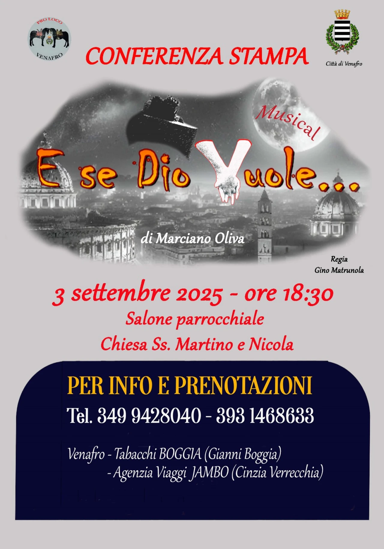 VENAFRO. Un grande impegno che nasce dall’idea e dalla genialità dell’ingegnere venafrano doc Marciano Oliva. Un lavoro di squadra e soprattutto una produzione artistica di assoluto livello. A Venafro il prossimo 13 settembre andrà in scena la prima assoluta del musical intitolato “E se Dio Vuole” scritto ed ideato, testi e musiche da Marciano Oliva. Una storia tutta da vivere e soprattutto da seguire. La commedia in due atti verrà messa in scena il 13 settembre a partire dalle ore 20.30 presso il piazzale della Chiesa dei Santi Martino e Nicola a Venafro. Intanto, l’evento, verrà presentato in conferenza stampa mercoledì 3 settembre alle ore 18.30 all’interno del salone parrocchiale della chiesa dei Santi MARTINO E NICOLA.