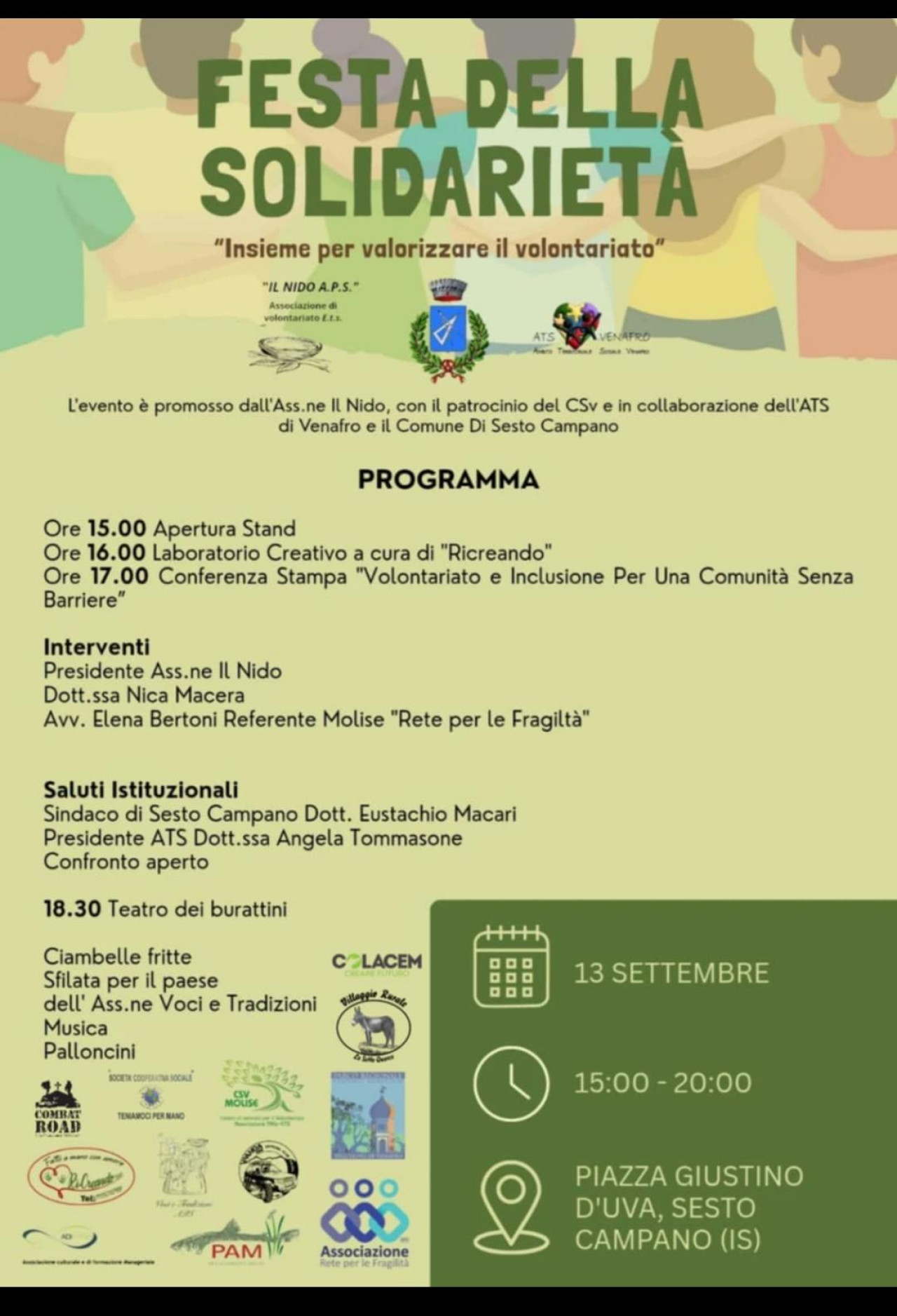 Sesto Campano. Confronti, dibattiti e nuove prospettive del volontariato. Questo e tanto altro nella Festa della Solidarietà in programma a Sesto Campano, sabato 13 settembre dalle ore 15 alle 20 in piazza Giustino D'Uva. L'evento è stato organizzato dallassociazione Il Nido, in collaborazione con il CSV Molise, con l'ambito territoriale sociale Venafro e col Comune di Sesto Campano. La manifestazione è stata supportata anche da altri enti del Terzo Settore e da alcune imprese che ne hanno condiviso la finalità. Con questa prima edizione, i promotori vogliono raccontare l'opera del volontariato e dell'agire solidale, evidenziando i valori di inclusione e generosità che possono rappresentare il motore della resilienza e al tempo stesso della crescita del territorio.