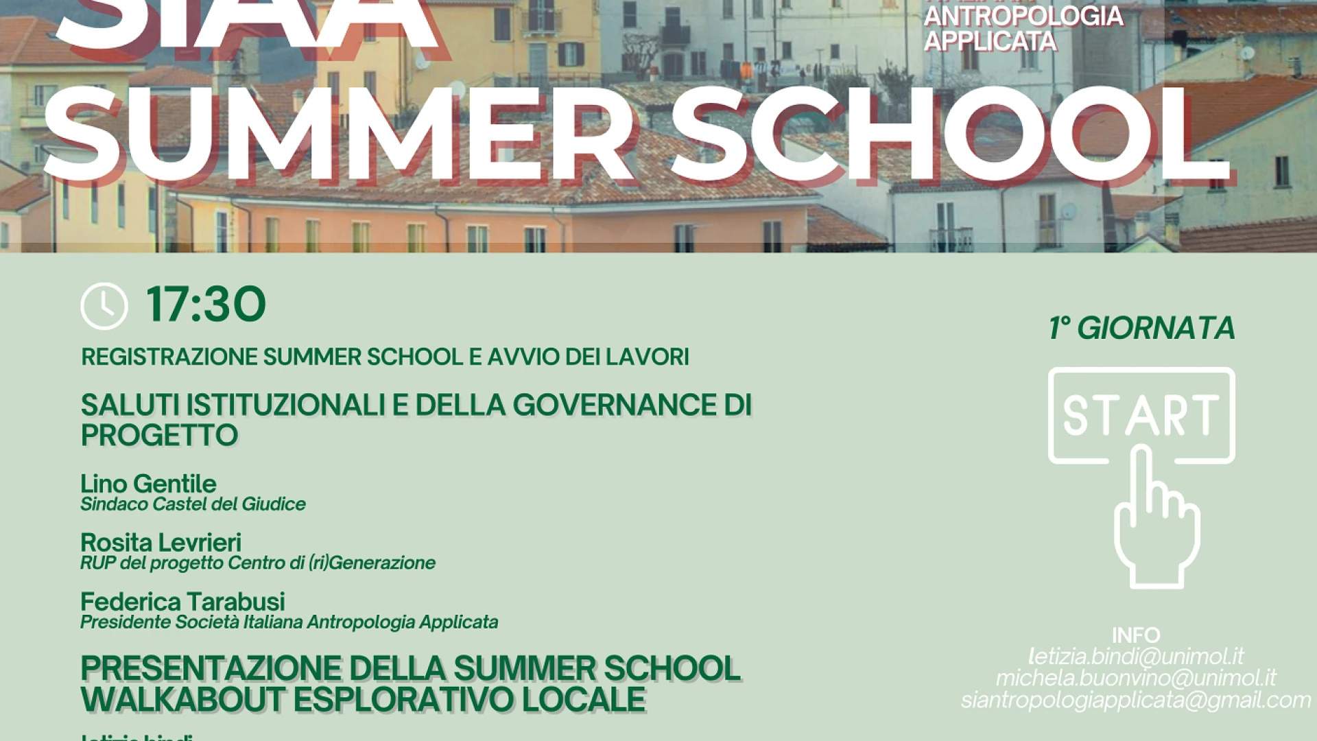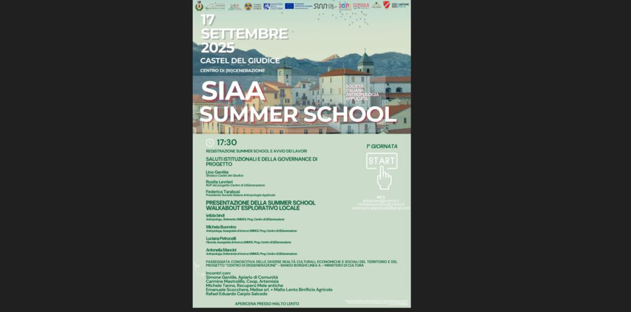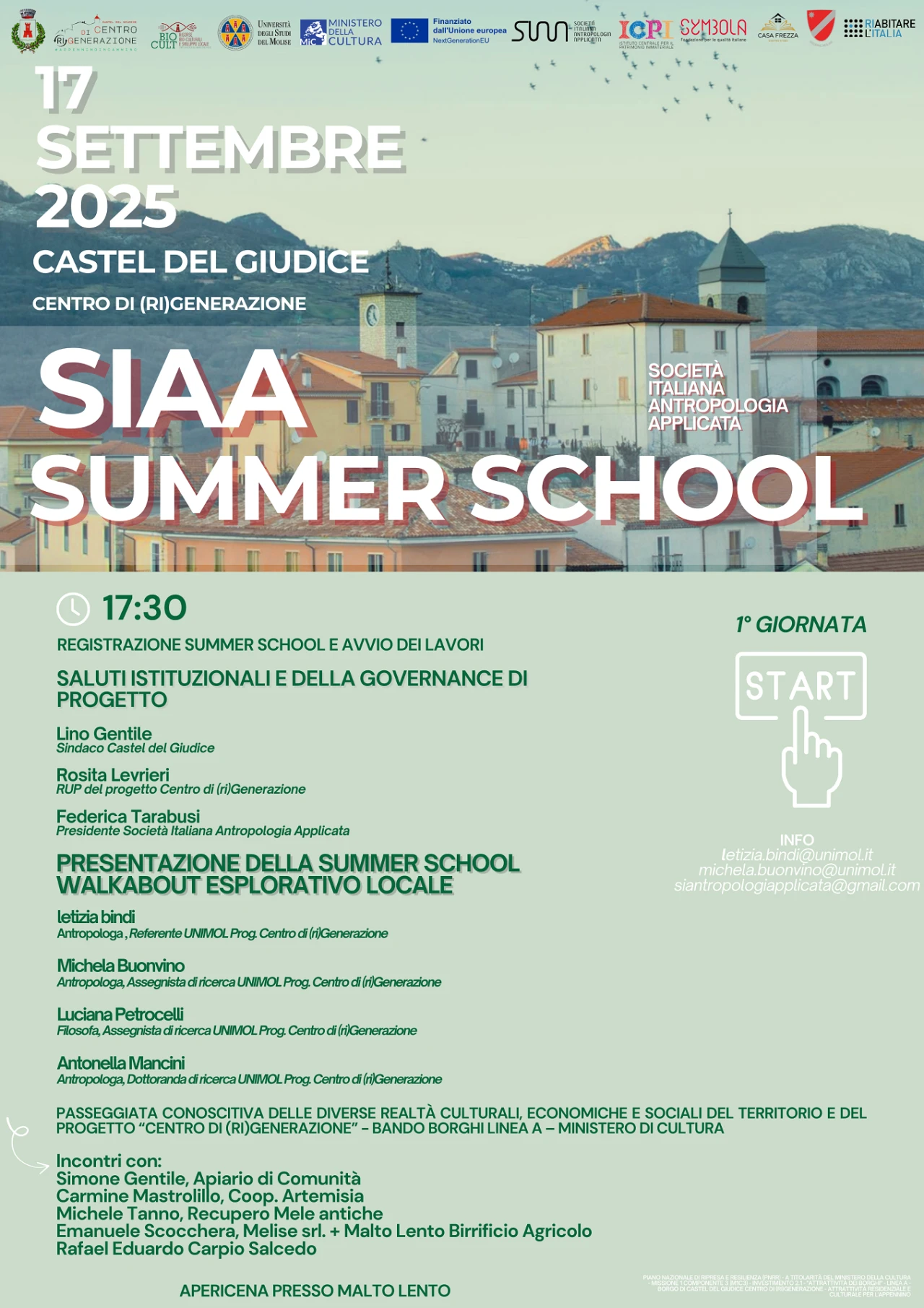 CASTEL DEL GIUDICE. Un’esperienza di apprendimento immersivo ed interdisciplinare che approfondirà tematiche di rigenerazione delle aree interne, lavoro culturale e innovazione sociale, sviluppo rurale sostenibile, innovazione sociale in agricoltura, cittadinanza energetica, beni comuni e comunità energetica rinnovabile, progettazione di spazi culturali e valorizzazione patrimoniale nelle aree periferiche e a rischio spopolamento. Dal 17 al 21 settembre 2025 Castel del Giudice ospita la seconda edizione della Summer School della Società Italiana di Antropologia Applicata, organizzata dal Centro di Ricerca BIOCULT dell’Università degli Studi del Molise in collaborazione con l’istituto Centrale per il Patrimonio Immateriale, l’Associazione Riabitare l’Italia, la Fondazione Symbola e l’Associazione culturale Casa Frezza, nel quadro degli interventi realizzati dal “Centro di (ri)Generazione dell’Appennino” di Castel del Giudice con cui il Comune ha vinto il Bando Borghi – Linea A del PNRR.