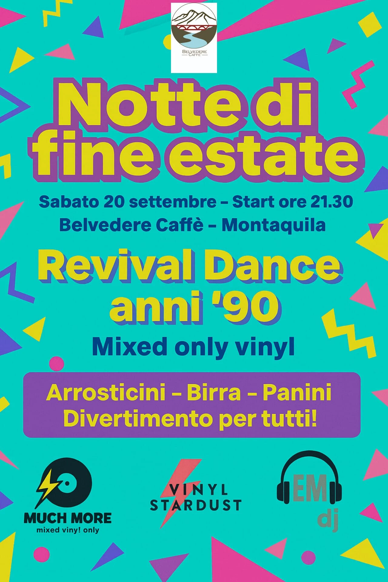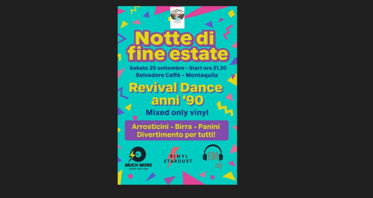 MONTAQUILA. Una serata da non perdere al Belvedere Caffe’ di Montaquila. Il locale gestito dagli imprenditori locali Cristian e Stefania offrirà a tutti i clienti l’ultimo evento della stagione estiva che volge ormai al termine. Una “notte di fine estate” caratterizzata da divertimento assoluto, musica, cibo e fiumi di birra gelata. A fare da contorno all’evento con inizio alle ore 21.30 una dj set di assoluto livello con un revival dance anni ’90 che vedra’ esibirsi in console Dj Much More, Vinyl Stardust ed Emsi.