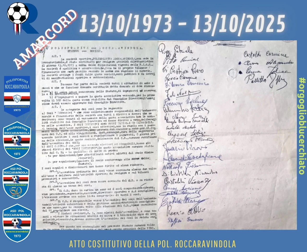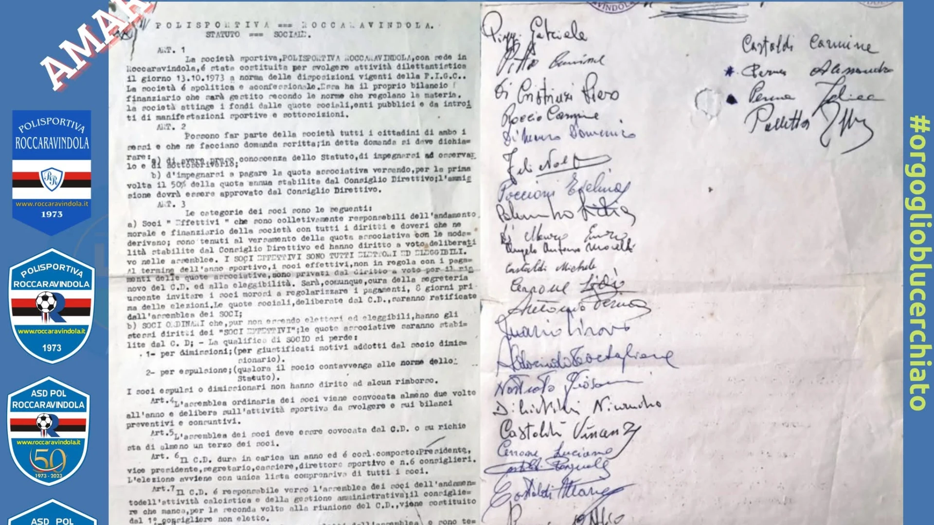 ESTRATTO DAL LIBRO "50 SFUMATURE DI BLUCERCHIATO" di Pasquale Castaldi, edito nel 2023 dalla Grafica Isernina:"13 ottobre 1973, quel giorno iniziava una grande storia: quella della Polisportiva Roccaravindola. Proprio quel giorno infatti un gruppo di amici di Roccaravindola decide di fondare una società sportiva per permettere ai giovani del posto di praticare in modo agonistico il calcio, sport che all’epoca solo pochi paesi nei dintorni praticava a livello federale. E il 13 ottobre 1973 si arriva, tra la soddisfazione di tutto il paese, alla costituzione di una società affiliata alla FIGC denominata POLISPORTIVA ROCCARAVINDOLA. Nei locali della Parrocchia Maria SS. Ausiliatrice ufficialmente viene costituita la società e, in rigoroso ordine di firma, appongono il loro “autografo” i seguenti soci: Gabriele Pizzi, Carmine Pittà, Piero Di Cristinzi, Carmine Roccio, Domenico Di Mauro, Felice Volpe, Evelina Poccioni, Lidia Palumbo, Enzo Di Mauro, Angelo Antonio Morelli, Michele Castaldi, Livio Cerrone, Antonio Perna, Mario Siravo, Aldorindo Tartaglione, Giovanni Nostrato, Nicandro Di Cristinzi, Vincenzo Castaldi, Luciano Cerrone, Pasquale Castaldi, Mario Castaldi, Attilio Roccio, Francesco Staffieri, Carmine Castaldi, Alessandro Perna, Felice Perna e Raffaele Pallotta. A queste persone, ma anche ad altre che in quel periodo danno il loro notevole contributo, tutti noi saremo per sempre riconoscenti per aver creato un qualcosa nel quale il nostro paese si è sempre identificato e che per sempre lo sarà.