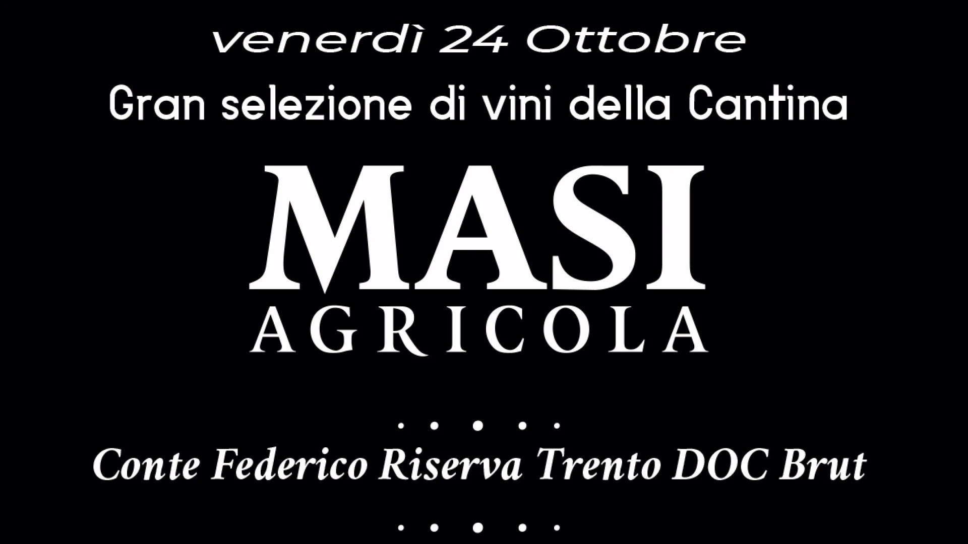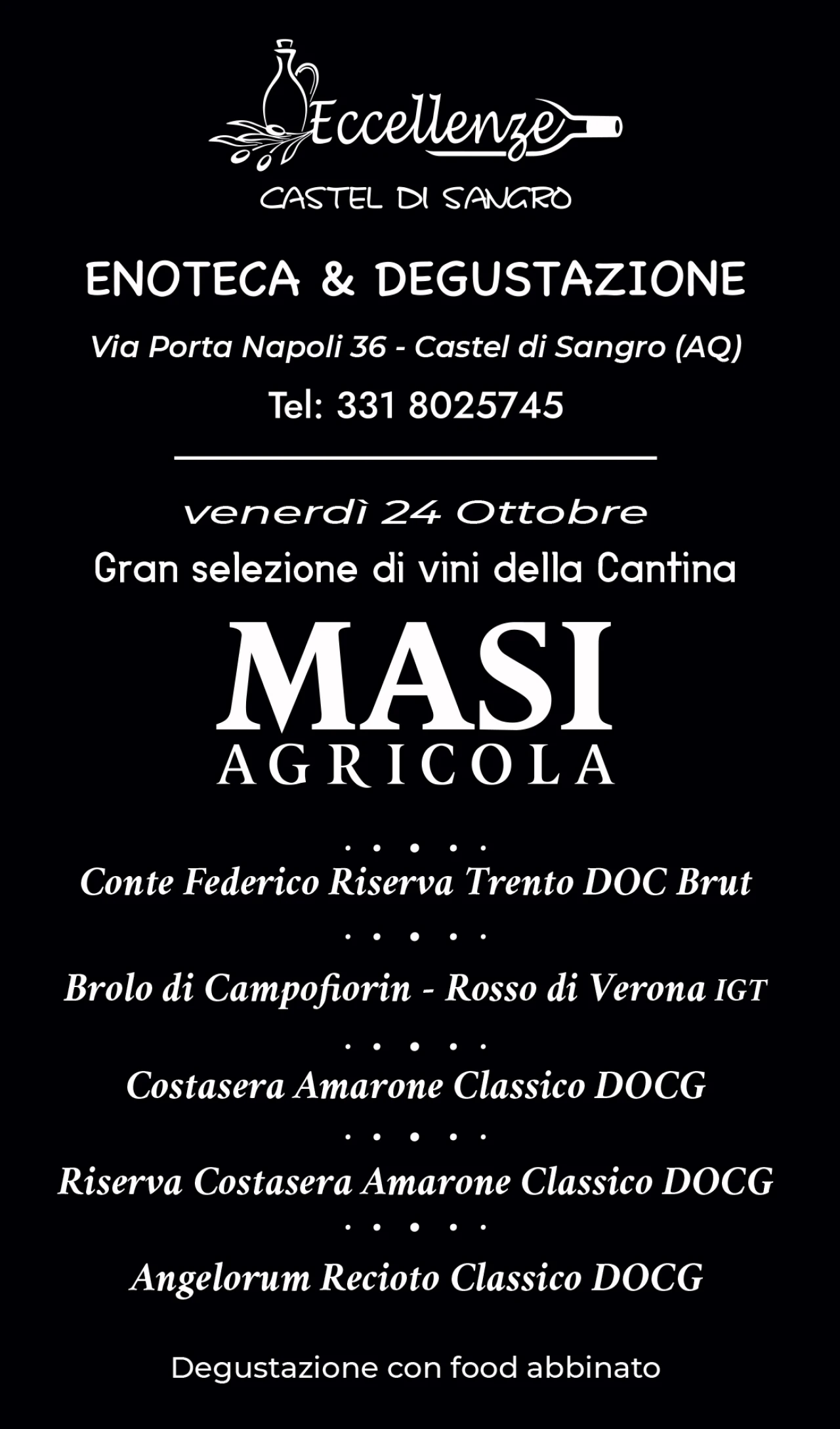 CASTEL DI SANGRO. Da Eccellenze enoteca e degustazione, appuntamento assolutamente da non perdere in programma venerdì 24 ottobre. Una serata per gli appassionati del buon vino in compagnia della gran selezione di vini della Cantina Masi Agricola. Una serata che vedra’ abbinamenti speciali con food abbinato scelti da Franco Gasbarro titolare di Eccellenze. Tutti i piatti saranno accompagnati da degustazioni di : Conte Federico Riserva Trento Doc Brut, Brolo di Campoforin, rosso di Verona IGT, Costasera Amarone Classico DOCG, Riserva Costasera Amarone Classimo DOCG, Angelorum Recioto Classico DOCG.