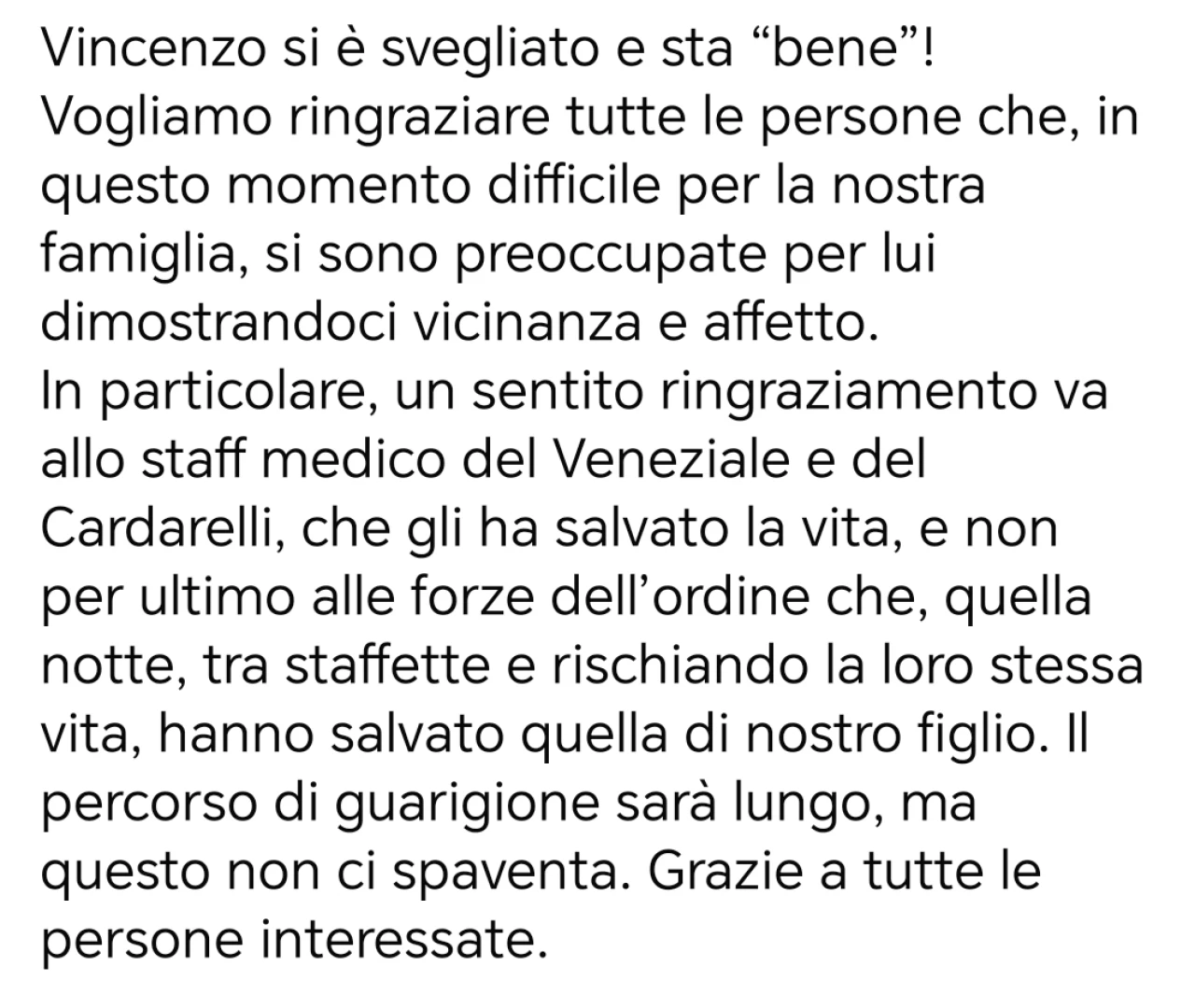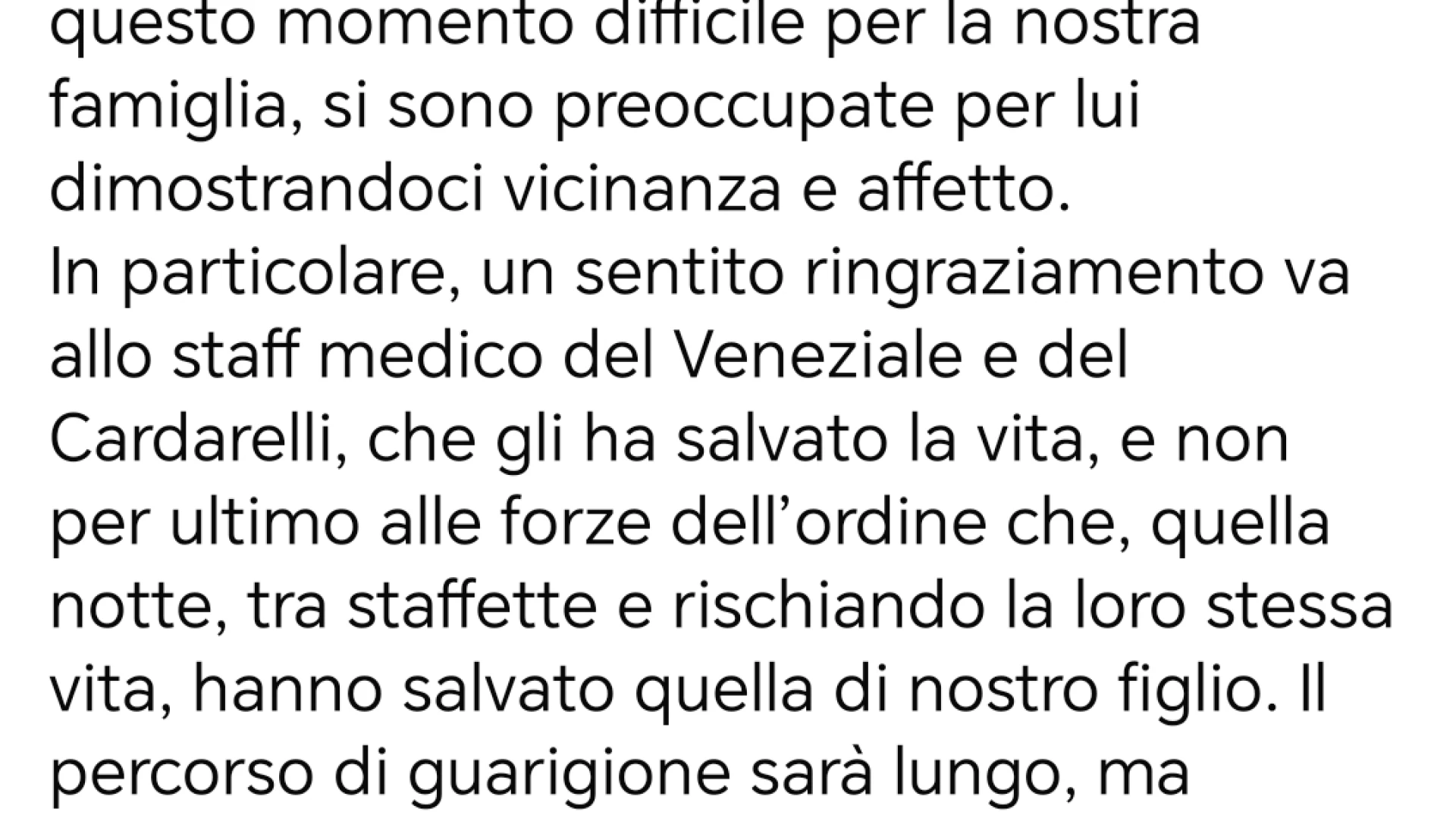 Come riferito dal padre del ragazzo, le sue condizioni sono in miglioramento(guarda la foto in gallery), scongiurando così l’ipotesi di una nuova prognosi riservata. Il papà desidera ringraziare tutti coloro che sono intervenuti tempestivamente per salvare la vita del figlio. Bisogna sottolineare come spesso si elogi — giustamente — il lavoro del personale sanitario, ma si tenda a dimenticare la fondamentale figura dell’autista soccorritore, che ogni giorno mette a rischio la propria vita per salvare quella degli altri, mettendo in pratica le tecniche di guida sicura in situazioni di emergenza. In particolare, per questo trasporto complesso e delicato, è doveroso riconoscere la professionalità e l’esperienza ultra ventennale dell’autista P.S.
