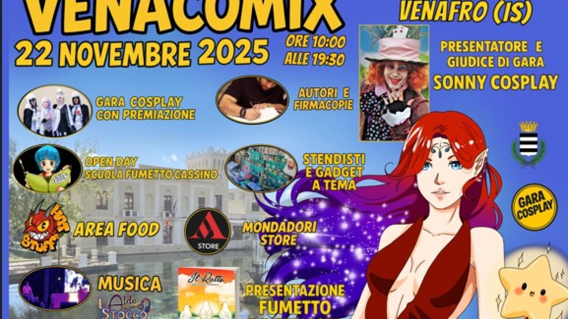 Venafro si prepara ad accogliere la sua prima grande fiera del fumetto, cosplay e cultura pop. Appuntamento imperdibile sabato 22 novembre 2025 per un evento che promette di trasformare la città in un regno di fantasia. Il fermento è palpabile: per la prima volta in assoluto, Venafro ospiterà il suo festival dedicato al mondo comix, fumetto e cosplay. Il Venacomix ideato dal giornalista Lello Castaldi e da Antonietta Sorrentino – Artista e Fumettista, non sarà solo una fiera, ma una vera e propria celebrazione della cultura pop che porterà nella nostra città artisti, doppiatori, cosplayer e migliaia di appassionati da tutto la regione. Gli organizzatori stanno lavorando alacremente per finalizzare un programma ricco e variegato. L’appuntamento dunque è fissato per il giorno 22 novembre 2025 presso la Palazzina Liberty di Venafro. L’ingresso è gratuito e gli orari di apertura andranno dalle ore 10 alle ore 19.