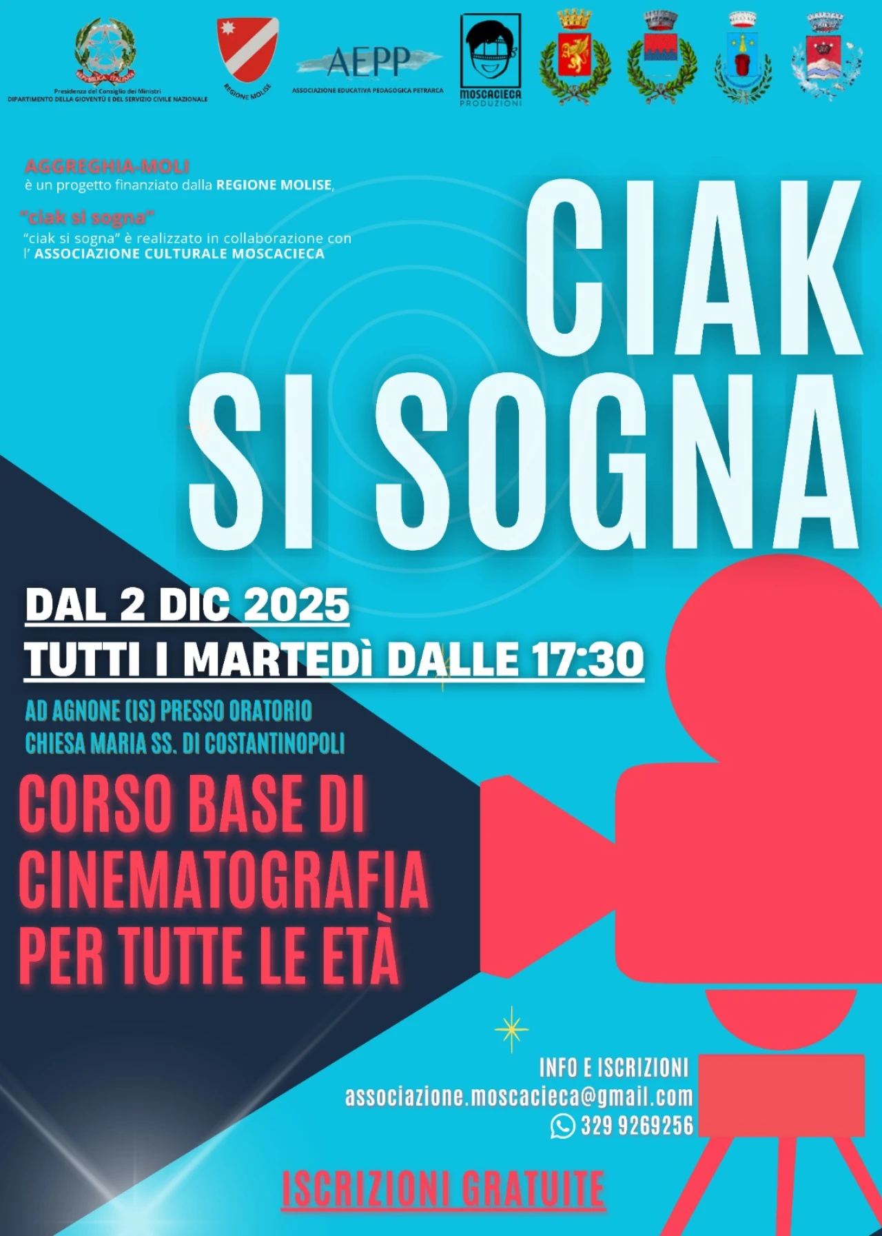 Nell’ambito del progetto AGGREGHIA-MOLI, finanziato dalla Presidenza del Consiglio dei Ministri e dalla Regione Molise, il Comune di Agnone promuove il corso base di cinematografia “Ciak, si sogna”, organizzato in collaborazione con i Comuni di Poggio Sannita, Civitanova del Sannio, Salcito e con l’associazione culturale Moscacieca.L’iniziativa è aperta a partecipanti di tutte le età interessati a conoscere da vicino il processo creativo e tecnico che dà vita a una produzione cinematografica. Grazie all’esperienza pluriennale dell’associazione Moscacieca, i corsisti avranno l’opportunità di esplorare i segreti del dietro le quinte.