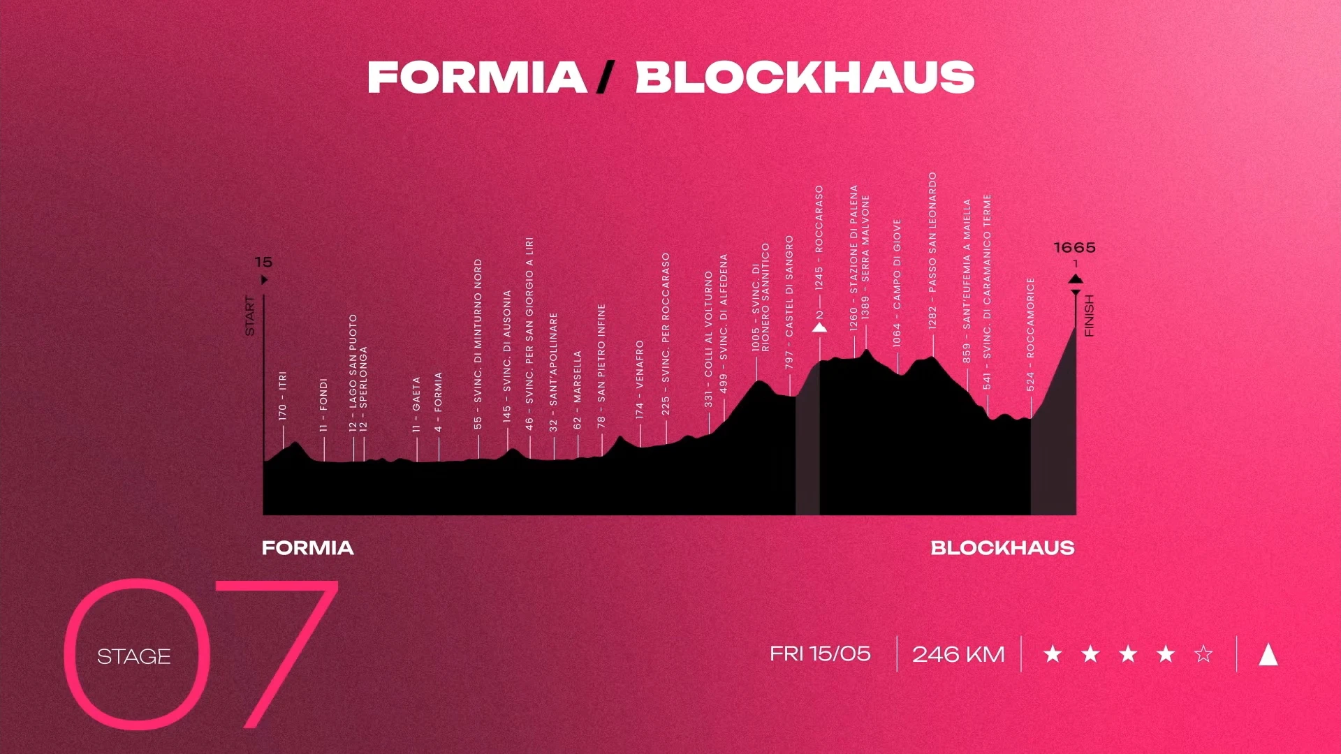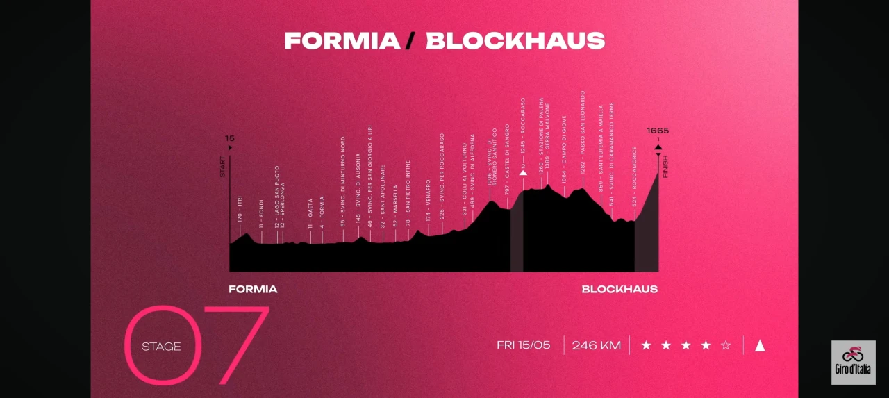 All’Auditorium Parco della Musica Ennio Morricone di Roma sono stati presentati i percorsi del 109° Giro d’Italia, in programma dall’8 al 31 maggio, e del Giro d’Italia Women, che partirà il 30 maggio per poi terminare il 7 giugno. Sará la settima tappa quella che interesserà il Molise e l'Abruzzo, prima il 15 maggio e poi il 16 maggio. Il Molise tornerà a colorarsi di rosa con il passaggio del Giro d’Italia: il percorso attraverserà la Valle del Volturno, per poi dirigersi verso Castel di Sangro e Roccaraso, fino a raggiungere la vetta abruzzese del Blockhaus, oltre i 1600 metri. Si tratta della settima tappa, con partenza da Formia e arrivo proprio al Blockhaus e sarà la tappa piu lunga di questo Giro d'Italia con ben 246 km. La tappa successiva toccherà ancora l'Abruzzo con partenza Chieti ed arrivo a Fermo.