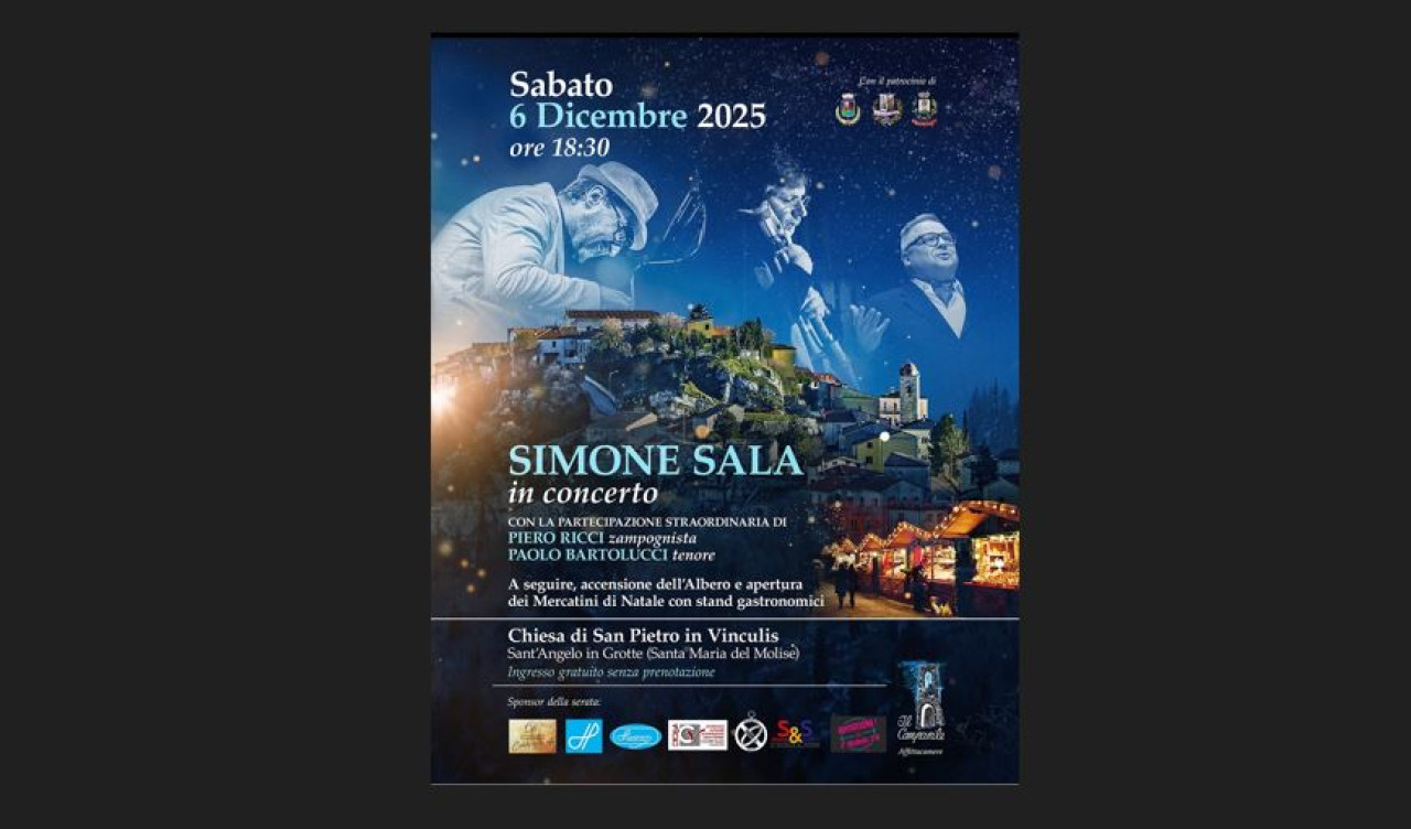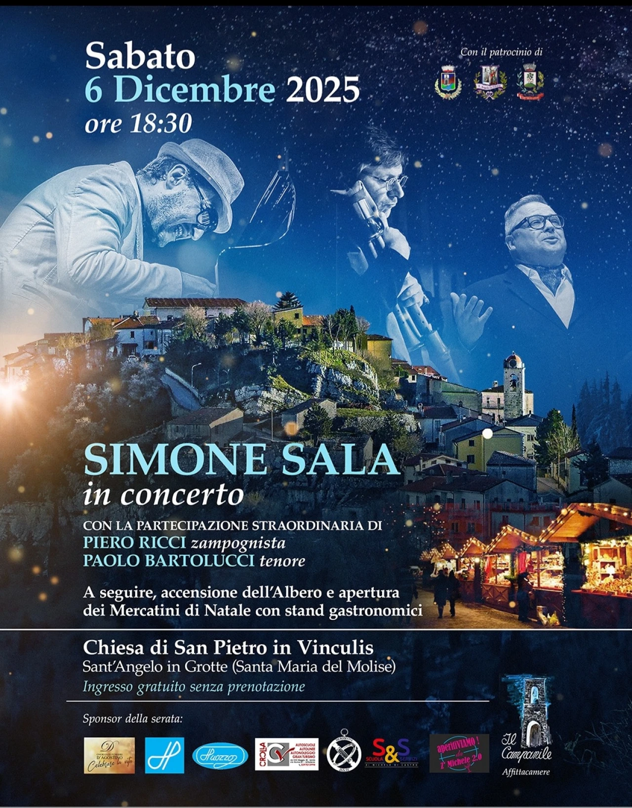 SANTA MARIA DEL MOLISE. I mercatini di Natale sono un vero e proprio «must» per gli amanti del periodo più magico dell’anno, e quest’inverno, il 6 dicembre dalle ore 18.30, arriverà anche a S.Angelo In Grotte (IS), la terza edizione del Mercatino di Natale, patrocinato dalla locale ProLoco, dall'Ass.Culturale Il Longobardo, dal Comune di S.Maria del Molise ed organizzato dalla struttura ricettiva Il Campanile.Il piccolo Borgo in provincia di Isernia sarà illuminato da tante decorazioni natalizie, e i tanti turisti potranno passeggiare tra stand caratterizzati da candele dipinte a mano, ceramiche, gioielli locali e oggetti realizzati da artigiani, oggetti unici da portare a casa come ricordo delle feste. A rendere tutto ancora più coinvolgente sono i profumi: cannella, agrumi, vin brulé fumante. Le soste gastronomiche invitano ad assaggiare dolci tipici, biscotti speziati e specialità che cambiano da regione a regione. A precedere l’apertura del mercatino, alle ore 18.30 il Concerto nella chiesa di S.Pietro in Vinculis del maestro Simone Sala e la partecipazione del tenore Paolo Bartolucci e dello zampognista Piero Ricci.