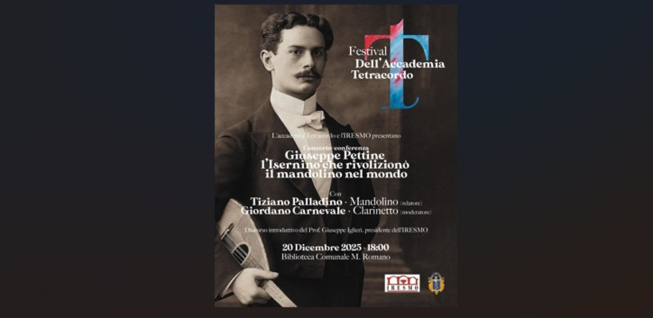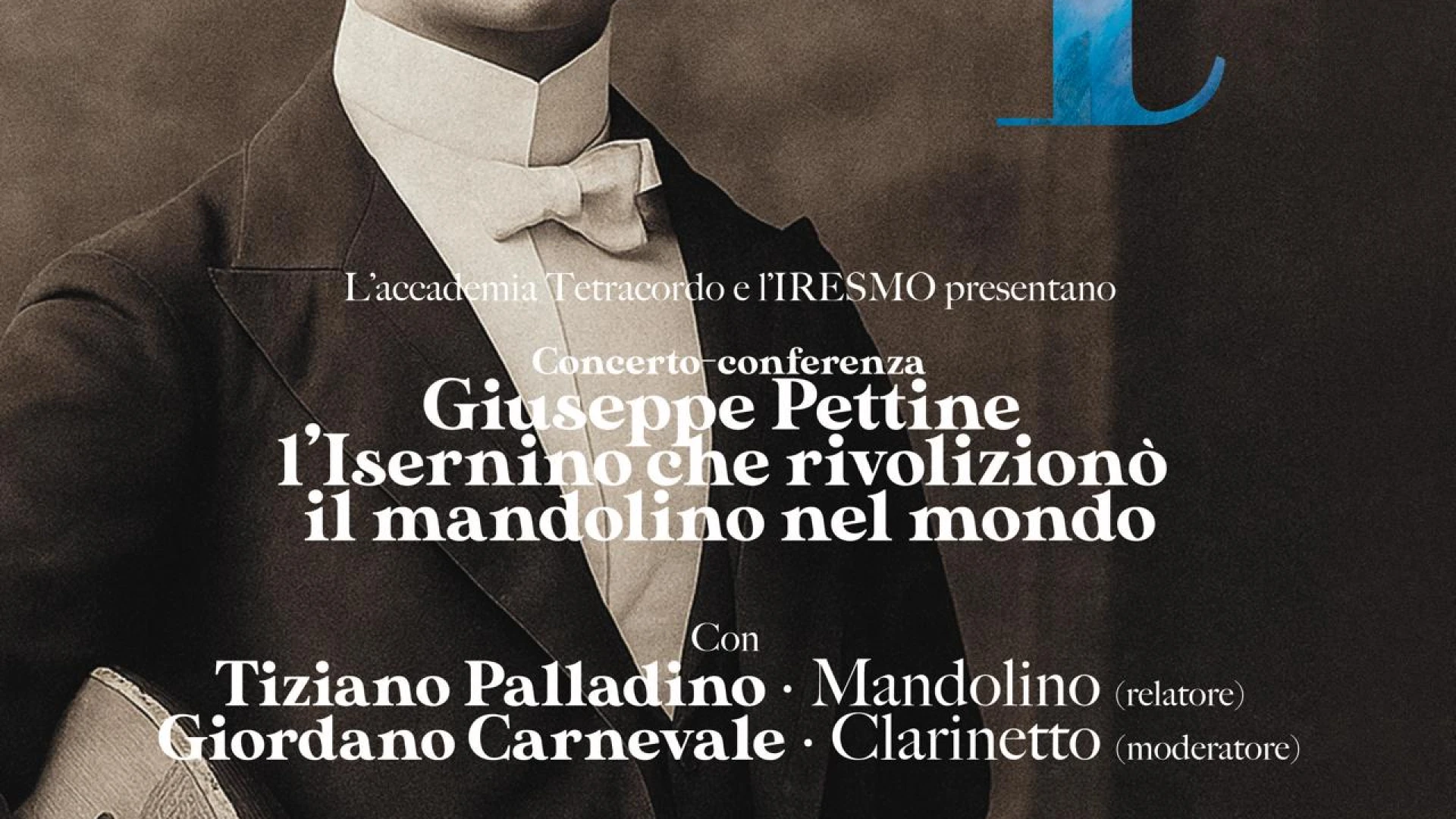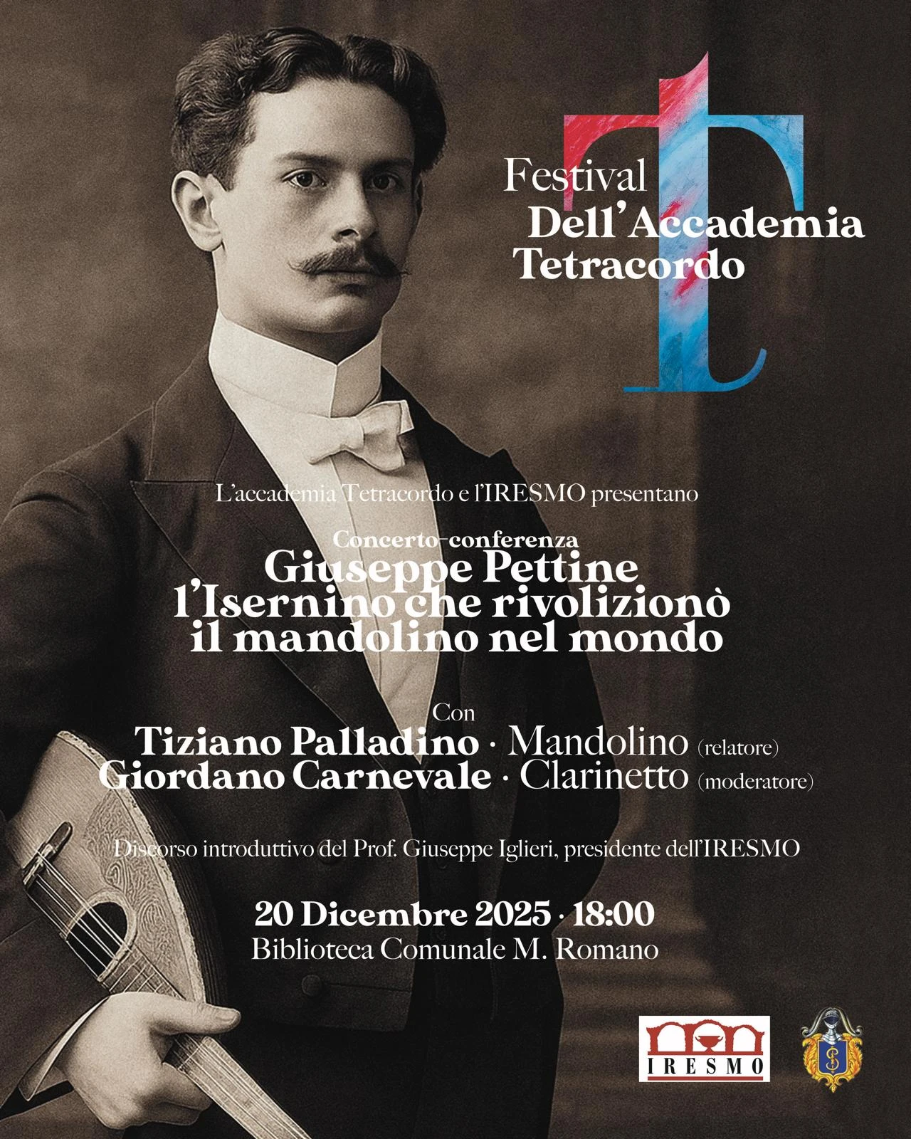 Una conferenza-concerto che unisce ricerca storico-musicologico, esecuzioni musicali dal vivo e divulgazione, nell’ambito di un progetto dell’Accademia Tetracordo e dell’IRESMO dedicato alla figura storica di Giuseppe Pettine (1874–1966), mandolinista isernino che rinnovò e diffuse il mandolino nel mondo intero. Figura celebrata negli Stati Uniti ma ancora poco nota a Isernia, la sua città natale. Un percorso tra storia e musica. L’incontro sarà introdotto dal Prof. Giuseppe Iglieri, presidente dell’IRESMO, che delineerà il contesto del progetto. Seguiranno gli interventi di: Tiziano Palladino, mandolinista e studioso di Giuseppe Pettine, che illustrerà il profilo storico-musicale di Pettine, e Giordano Carnevale clarinettista e direttore artistico dell’Accademia Tetracordo, che offrirà una narrazione divulgativa, capace di connettere la ricerca storico-musicologica con l’ascolto esperienziale.