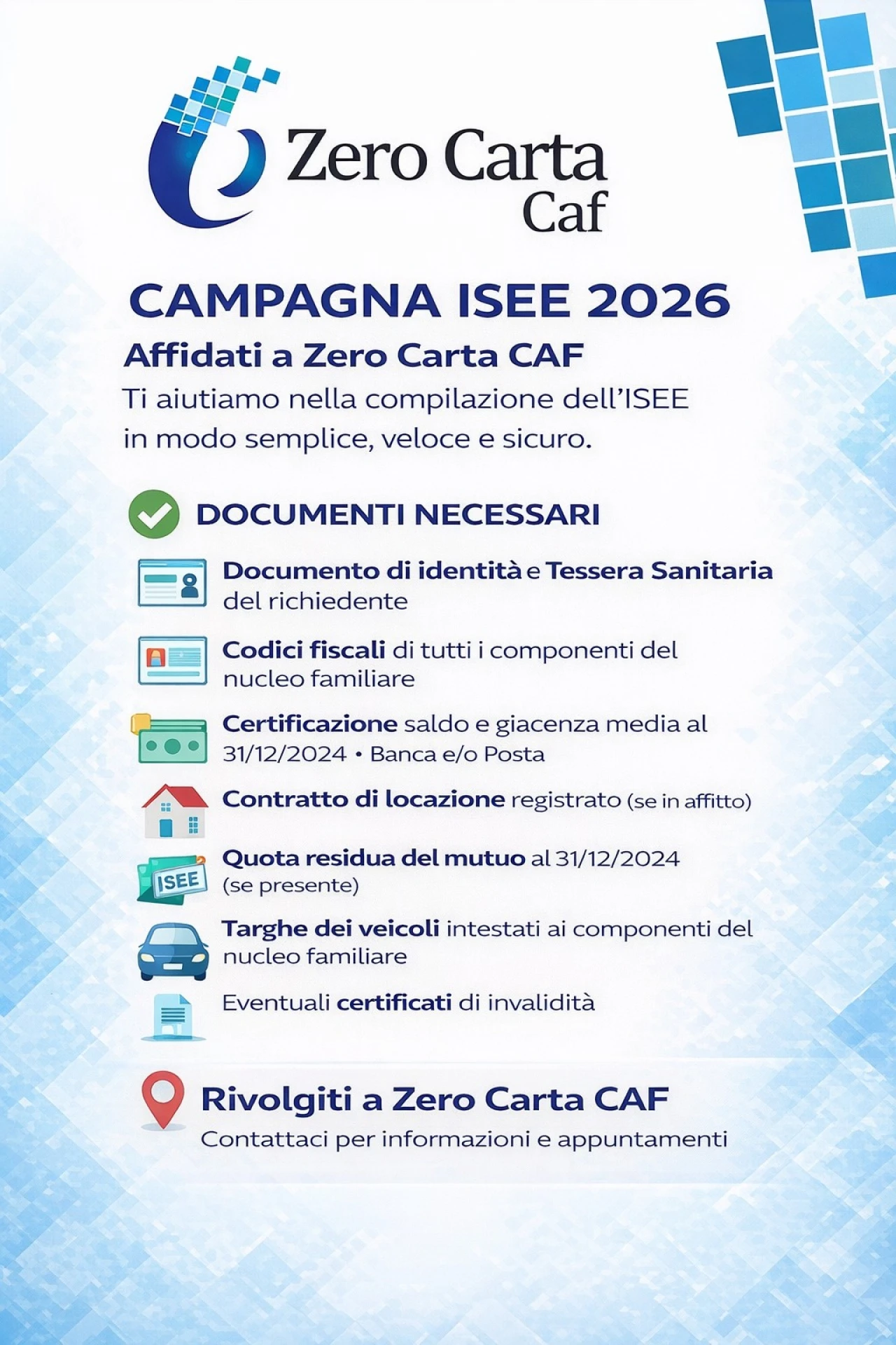 📍 Contatta la sede Zero Carta CAF di zona, che ti assisterà per la compilazione della DSU e la richiesta dell'attestazione Isee aggiornata.