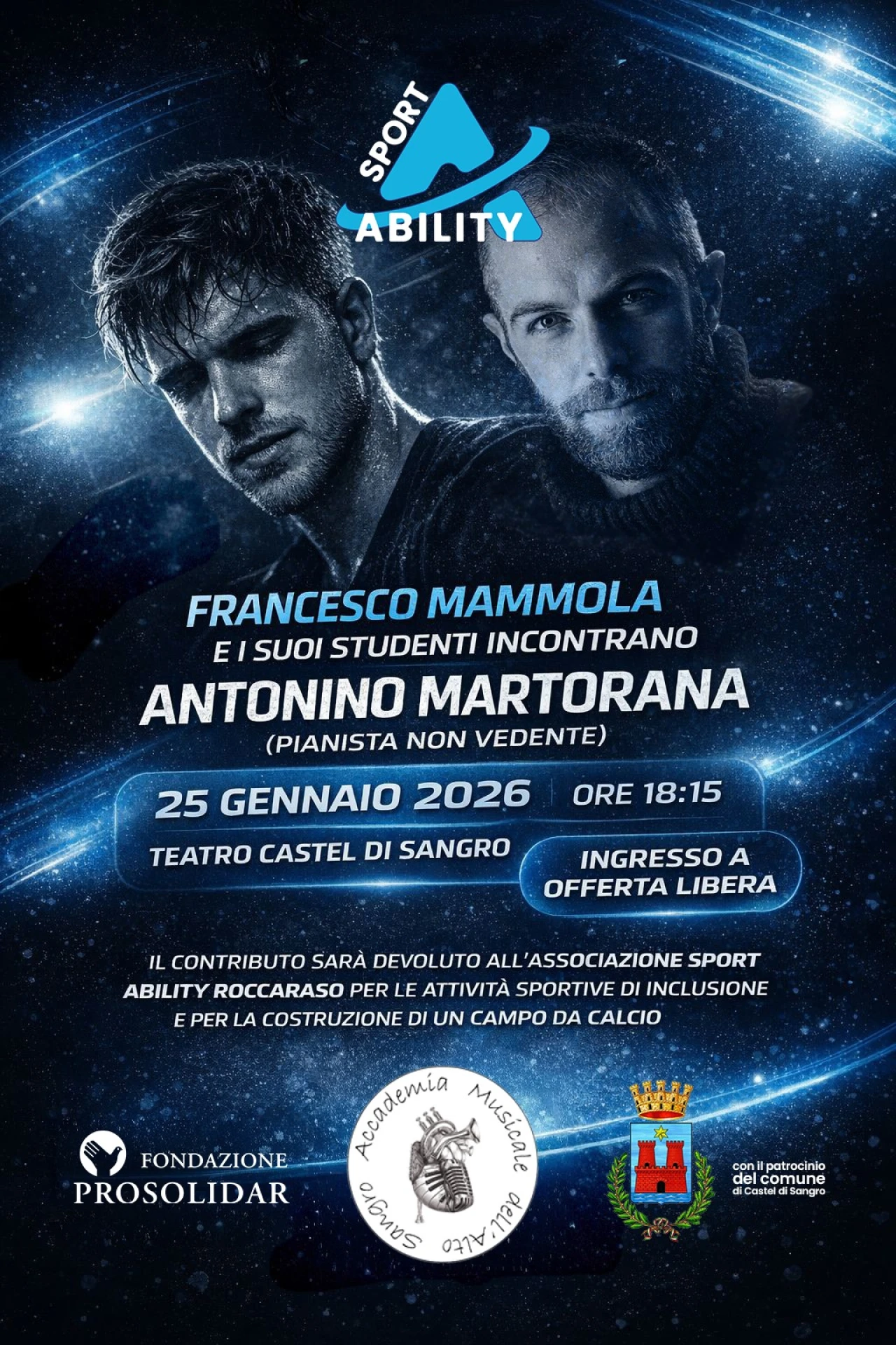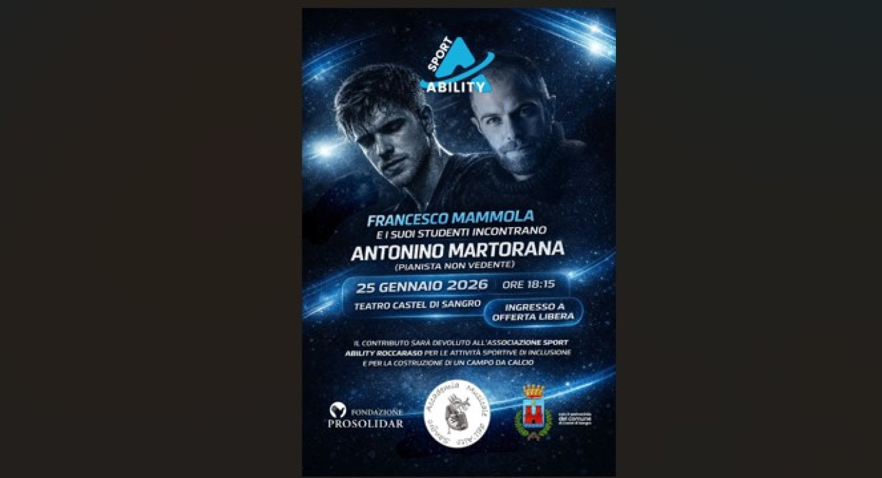 Francesco Mammola guiderà il pubblico in un percorso musicale intenso e coinvolgente insieme ai suoi allievi, protagonisti di esecuzioni curate e ricche di sensibilità. Accanto a loro la presenza speciale di Antonino Martorana, giovane atleta e pianista non vedente che porterà sul palco talento, emozione e forza espressiva. La serata sarà anche un gesto concreto di solidarietà: l'evento sosterrà Sport Ability nella sua missione di inclusione attraverso lo sport, per mezzo della musica, nei diversi progetti dedicati al calcio a 5 B1 per non vedenti, all’organizzazione di eventi e tornei inclusivi, alle attività educative sul territorio e allo sviluppo di eventi che garantiscano opportunità reali a persone con disabilità.