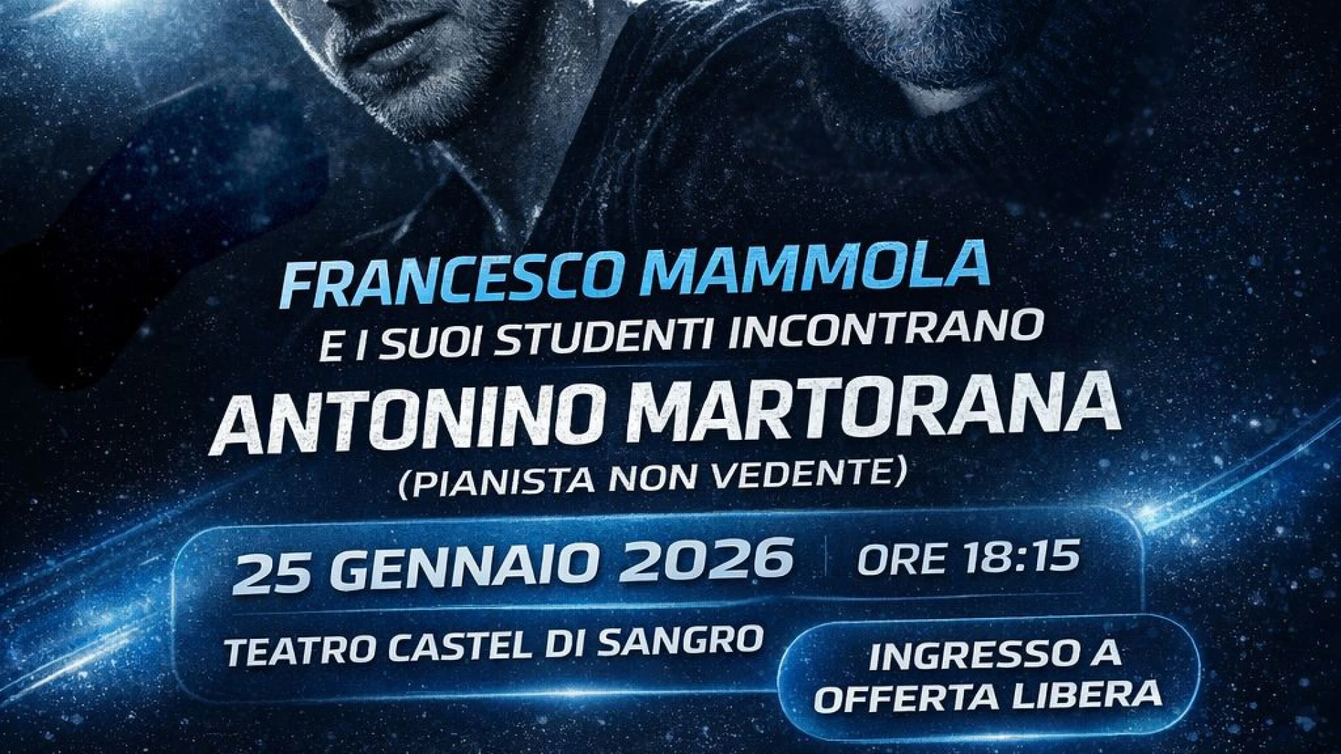 Castel di Sangro. Domenica 25 Gennaio alle ore 18.30 presso il Teatro Tosti di Castel di Sangro si terrà un concerto solidale con il Maestro Francesco Mammola, i suoi allievi e Antonino Martorana, giovane pianista non vedente della ASD Sport Ability Roccaraso.