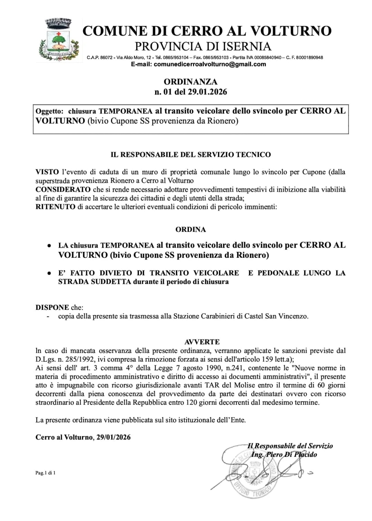 Il traffico veicolare in zona è stato chiuso anche con apposita ordinanza emessa dal settore tecnico del comune di Cerro al Volturno. Indagini strutturali in corso da parte dei tecnici dell'Anas.
