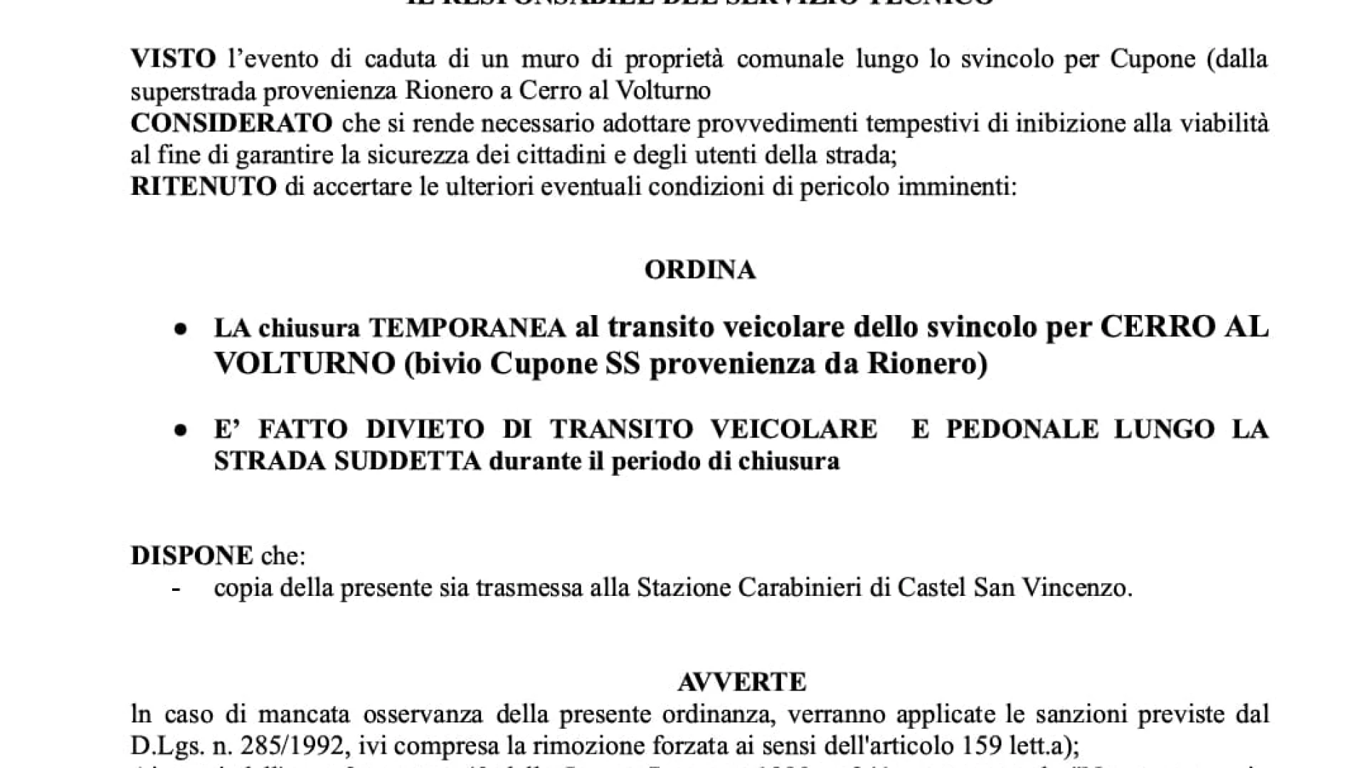 Cerro al Volturno. Nella giornata di oggi tecnici dell'Anas e del comune di Cerro al Volturno hanno proceduto alla chiusura di un tratto stradale sulla Fondovalle Sangro in direzione Cerro al Volturno all'altezza del bivio di Cupone a causa del cedimento di un muro di contenimento.
