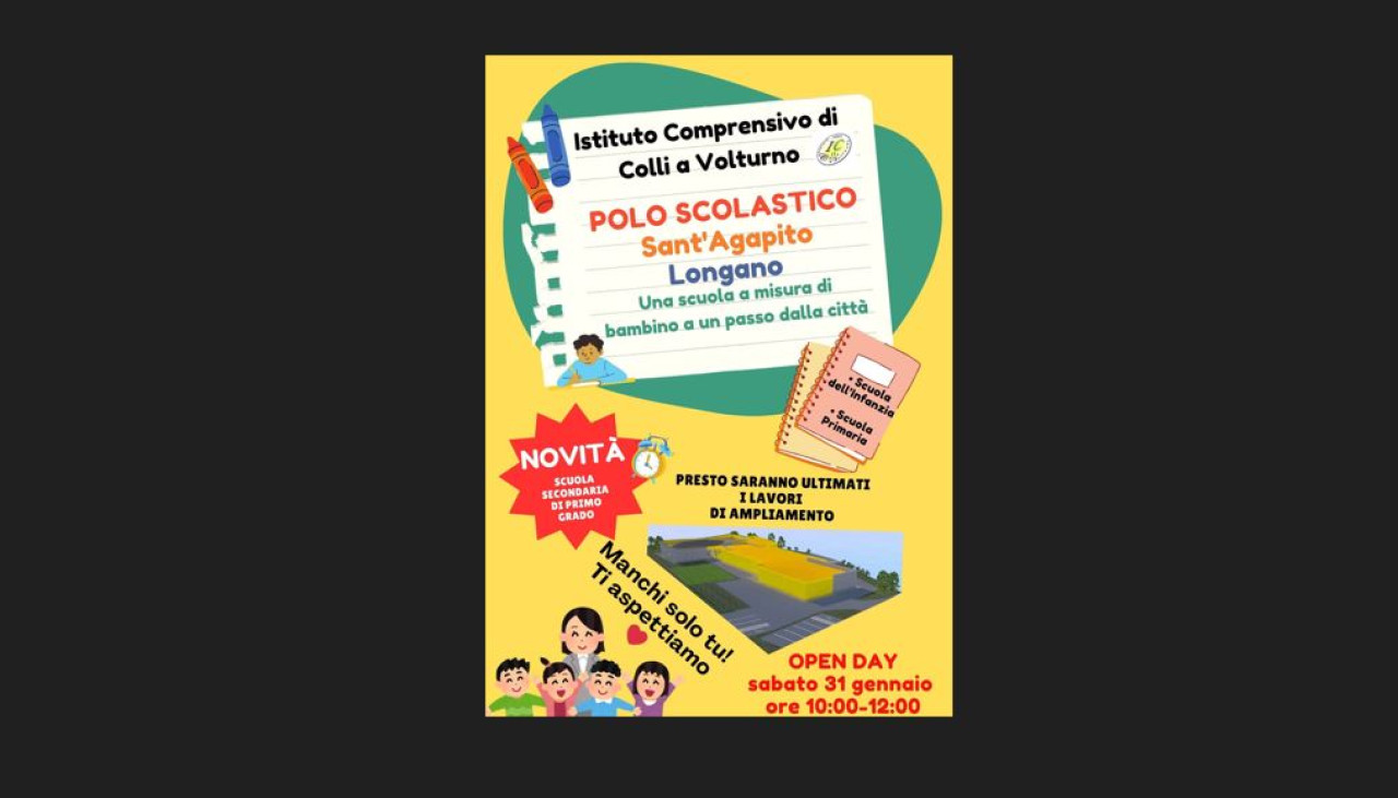 SANT'AGAPITO-LONGANO. Il Polo Scolastico di Sant’Agapito-Longano, attualmente interessato anche da importanti lavori di ampliamenti, aprirà le porte alle famiglie e ai futuri studenti nella giornata di sabato 31 gennaio 2026 dalle ore 10 alle ore 12. Una scuola moderna afferente all’Istituto Comprensivo di Colli a Volturno. Si potranno conoscere e visitare gli spazi della scuola primaria e dell’infanzia. Dal prossimo anno scolastico apertura anche della scuola secondaria di primo grado.