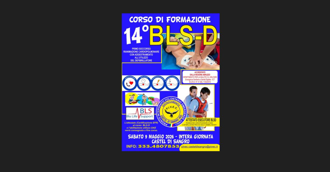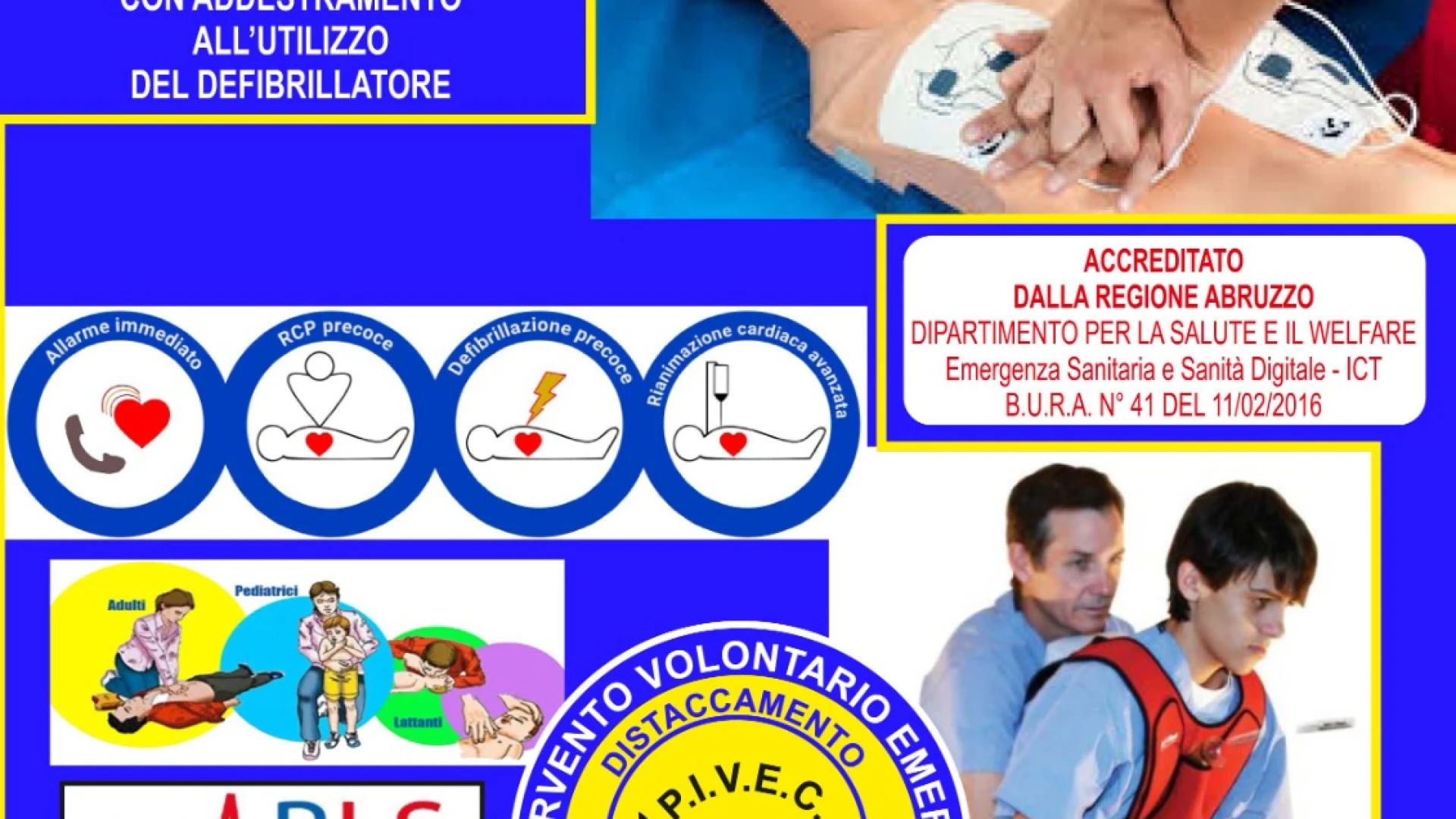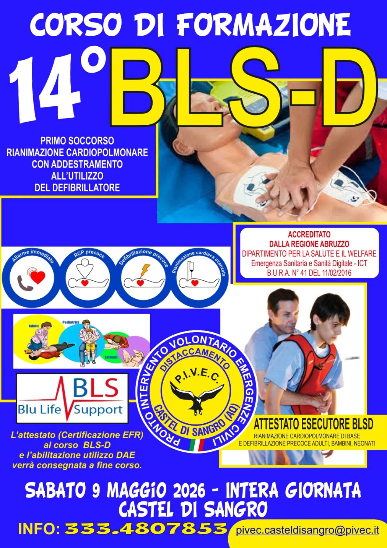 CASTEL DI SANGRO. Il distaccamento PIVEC propone ed organizza come da tradizione la quattrdicesima edizione del corso BLSD. Evento di formazione promosso in collaborazione con Blu Life Support. Al termine del corso di primo soccorso di rianimazione cardiopolmonare e corretto utilizzo del defibrillatore, verrà rilasciato ai partecipanti apposito attestato. Il Corso s svolgerà sabato 9 maggio 2026 per l’intera giornata a Castel Di Sangro.