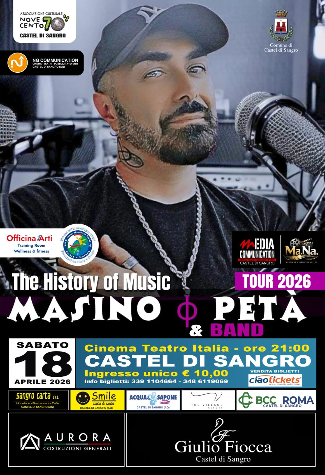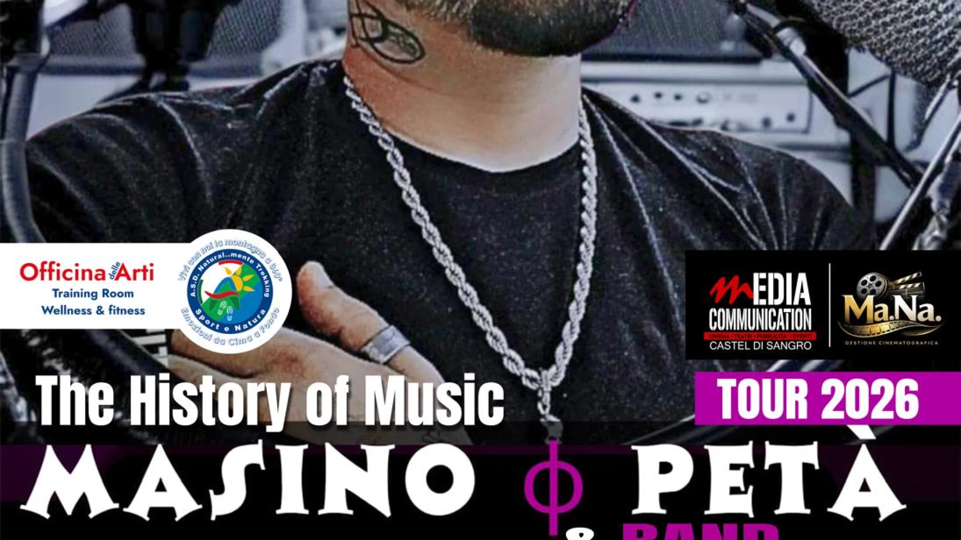 CASTEL DI SANGRO. Sale l'attesa per il concerto di MASINO PETA' & BAND THE HISTORY OF MUSIC, in programma al Cinema Teatro Italia di Castel di Sangro. Sabato 18 Aprile , la band si esibirà, per tutti gli appassionati della musica, proponendo uno show, di oltre due ore, con i piu' grandi successi della musica italiana ed internazionale dagli anni settanta ad oggi. Sul palco Masino Peta' voce e tastiere, Andrea Carbone batteria, Giuseppe Sabatino chitarra, Peppe Sax sassofonista.Tutti i musicisti vantano prestigiose collaborazioni con Tony Esposito, Enzo Avitabile, Franco Del Prete, Eduardo De Crescenzo, Gigi Finizio, Sal Da Vinci e altri.Presente allo spettacolo anche il corpo di ballo della scuola di danza A.S.D. Naturalmente Trekking diretto dalla Maestra Katiana Pacella. Presenta la serata Cristina Antenucci.