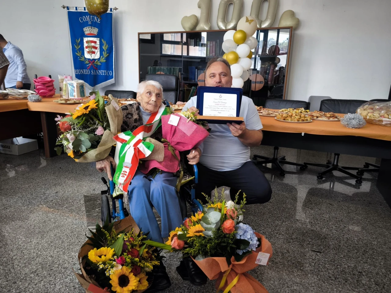 RIONERO SANNITICO. Una giornata di festa che i suoi familiari le hanno voluto dedicare. Anna Di Vincenzo di Rionero Sannitico, ha festeggiato quest’oggi il suo centesimo compleanno. Si tratta della seconda nonnina del territorio comunale che taglia questo importantissimo traguardo. Per lei una mega festa di paese. Prima la celebrazione della Santa Messa e subito dopo il rinfresco in piazza all’interno di un locale adiacente la sede del Municipio di Rionero Sannitico. Il sindaco Arnaldo Rossi, per l’occasione, ha consegnato a nonna Anna la fascia di primo cittadino e una targa commemorativa della giornata, trasformando cosi l’anziana piu’ longeva di Rionero nel sindaco per un giorno. GUARDA IL SERVIZIO.