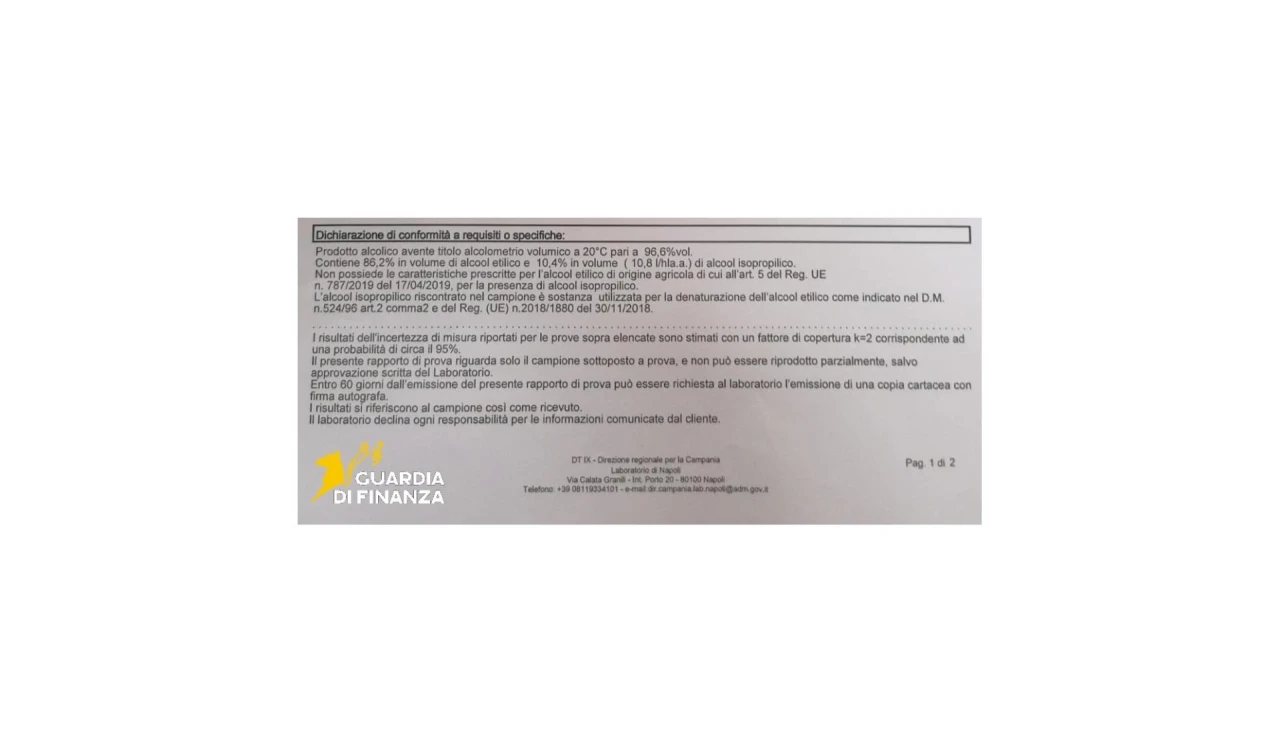 Le analisi chimiche del prodotto sequestrato hanno ora svelato la presenza, nel campione esaminato dal laboratorio dell'Agenzia delle Dogane e dei Monopoli di Napoli, di alcool isopropilico, in percentuale tra il 9,7 e il 10,4, composto che viene normalmente utilizzato per usi industriali, medici e cosmetici, e che comporta gravi rischi per la salute in caso di ingestione.Il suggerimento della GdiF, pertanto, è di acquistare solo da rivenditori autorizzati e diffidare di offerte troppo convenienti o prodotti di dubbia provenienza.Per il principio di presunzione di innocenza, la responsabilità degli indagati sarà definitivamente accertata solo nel caso in cui intervenga una sentenza irrevocabile di condanna.L’attività di servizio testimonia il costante impegno della Guardia di finanza nel contrasto ai traffici illeciti a tutela, oltre che dell’erario e dell’economia sana, anche della salute e dei diritti dei consumatori.