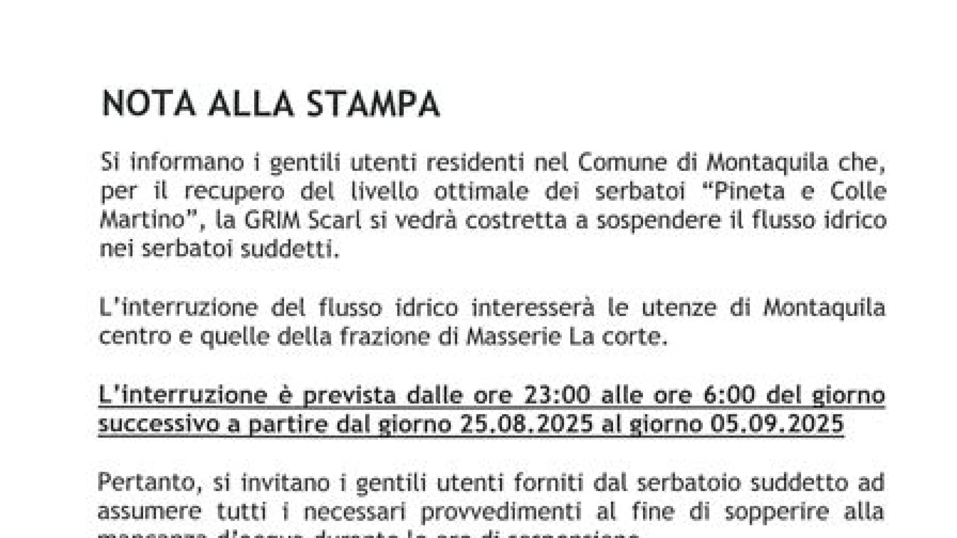 Montaquila: avviso sospensione flusso idrico. L'annuncio di Grim Molise. LEGGI LA COMUNICAZIONE Ambiente