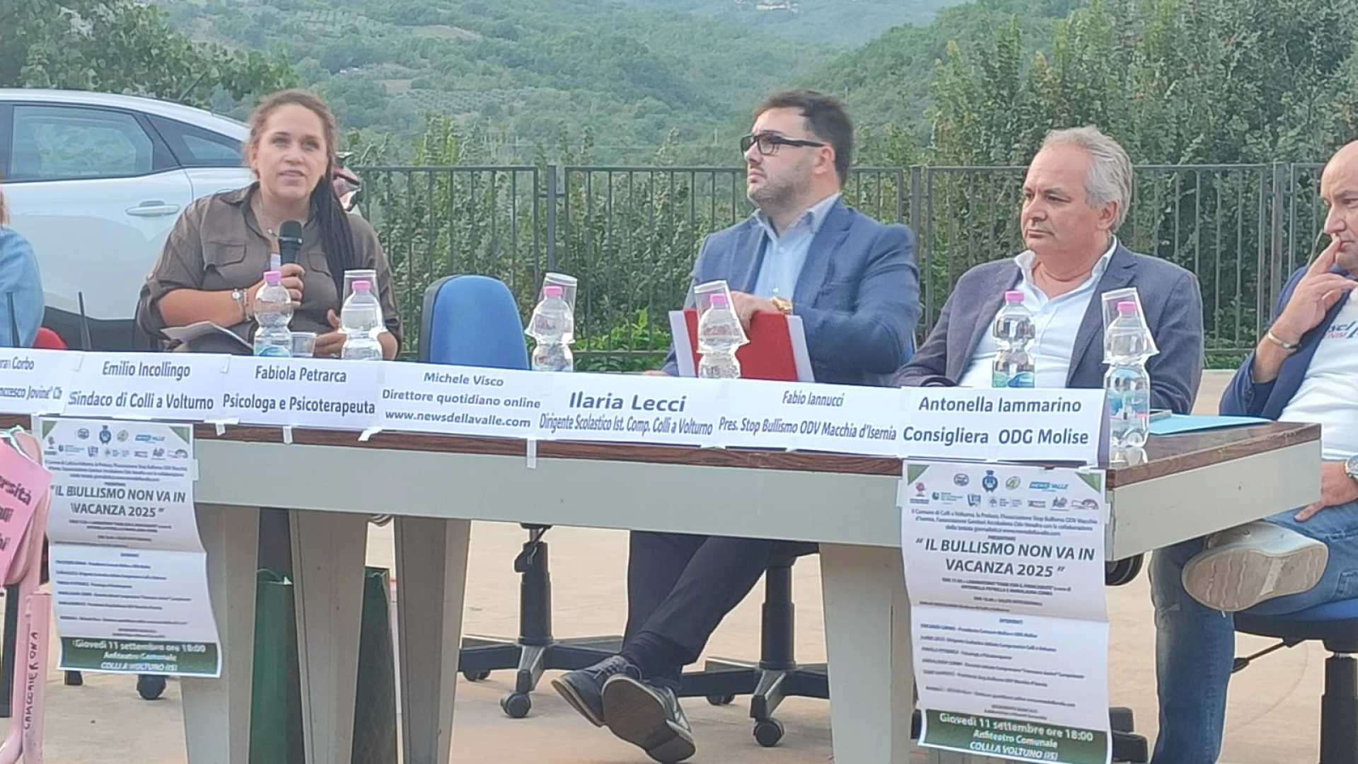 COLLI A VOLTURNO. Quello di giovedì 11 settembre e’ stato un appuntamento sociale e culturale di grande interesse in paese. Nella piazza anfiteatro si e’ svolta la tappa dell’evento “Il Bullismo non va in vacanza” promossa dall’Associazione Stop Bullismo Odv Macchia d’Isernia, dal comune di Colli a Volturno e dall’associazione turistica Pro Loco Colli. Evento realizzato grazie alla partecipazione a livello comunicativo della testata giornalistica www.newsdellavalle.com. I relatori hanno discusso delle tematiche strettamente correlate al bullismo, soprattutto in ambiente scolastico. GUARDA IL SERVIZIO.