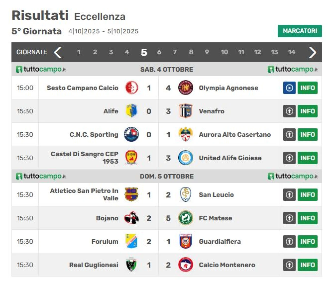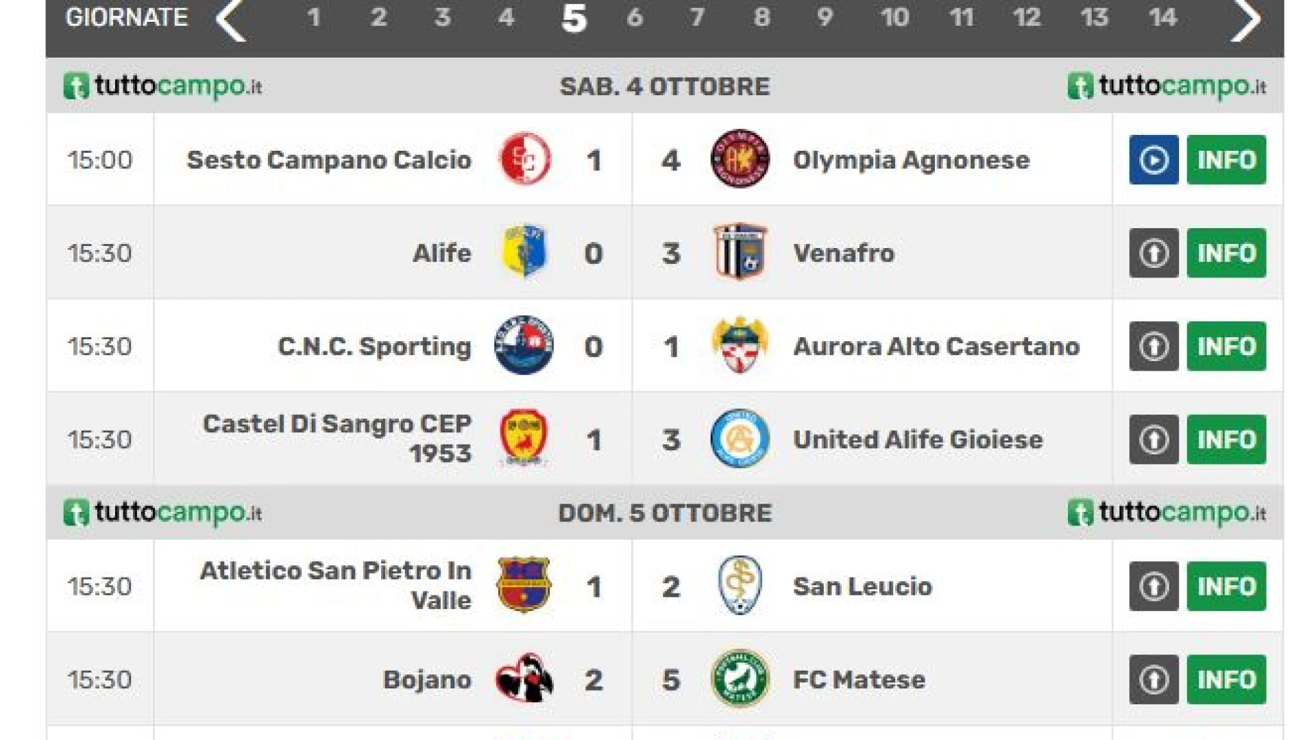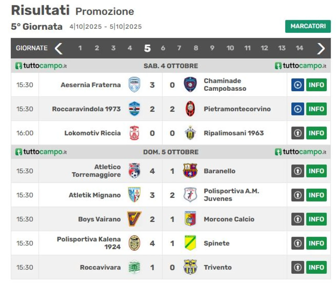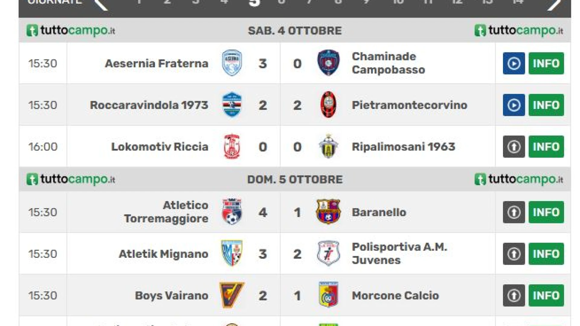 Nella gallery fotografica a margine dell'articolo consulta i risultati e le classifiche aggiornate dei vari campionati: Serie D girone F, Eccellenza e Promozione Molise.