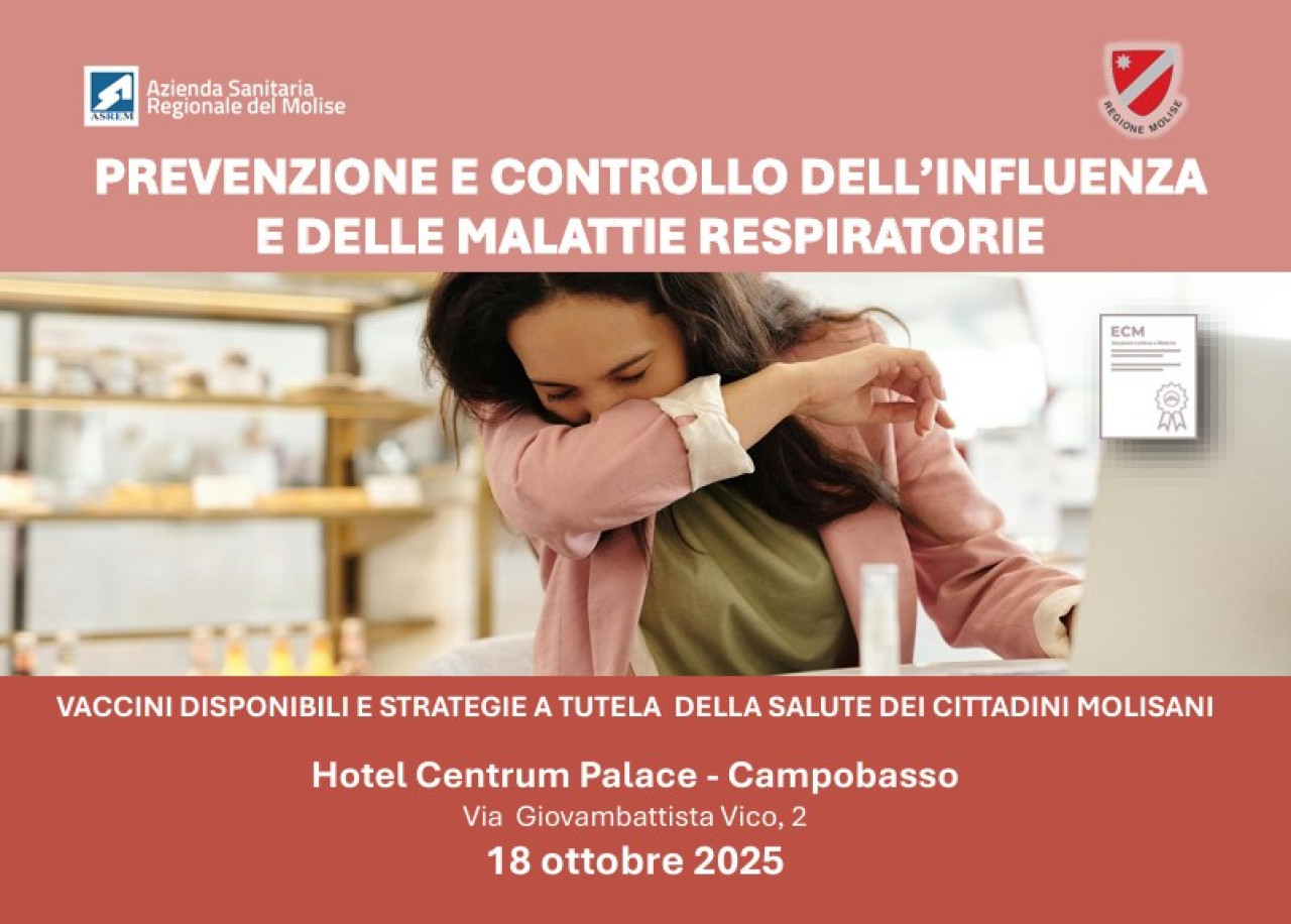 CAMPOBASSO. “Prevenzione e controllo dell’influenza e delle malattie respiratorie”: il titolo dell’evento che si terrà sabato 18 novembre 2025, a partire dalle 9e15, al Centrum Palace di Campobasso. Una iniziativa organizzata dal Dipartimento Unico di Prevenzione dell’ASReM.