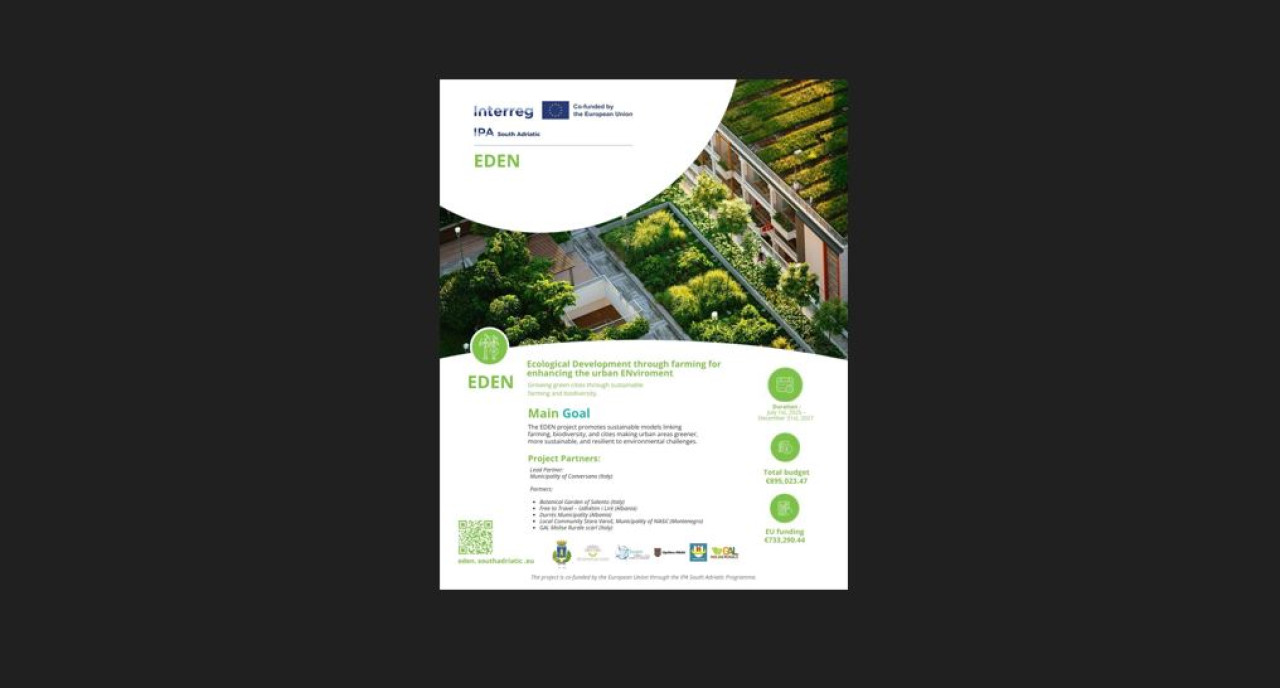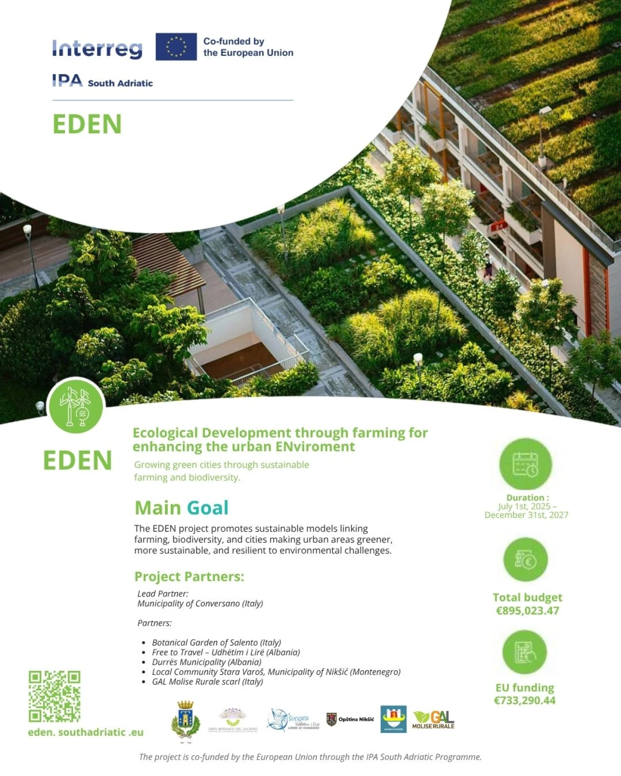 • stimolare nuove forme di gestione condivisa degli spazi pubblici. Le Fattorie Urbane Pilota saranno realizzate in ogni territorio coinvolto e saranno progettate secondo criteri modulari e replicabili, con infrastrutture leggere, orti rialzati, sistemi di raccolta dell’acqua piovana e compostiere, in linea con i principi del Green Deal europeo. EDEN coinvolge partner istituzionali e organizzazioni della società civile provenienti da Italia, Albania e Montenegro, con l’obiettivo di creare un modello condiviso di gestione e valorizzazione degli spazi verdi e una rete di fattorie urbane mediterranee. L’evento sarà articolato in due giornate: